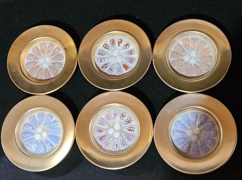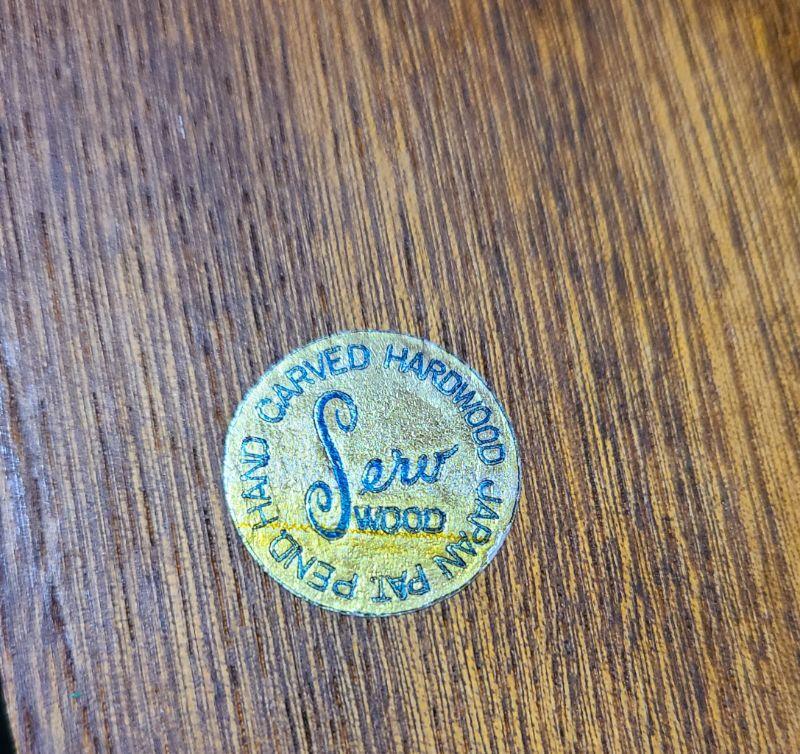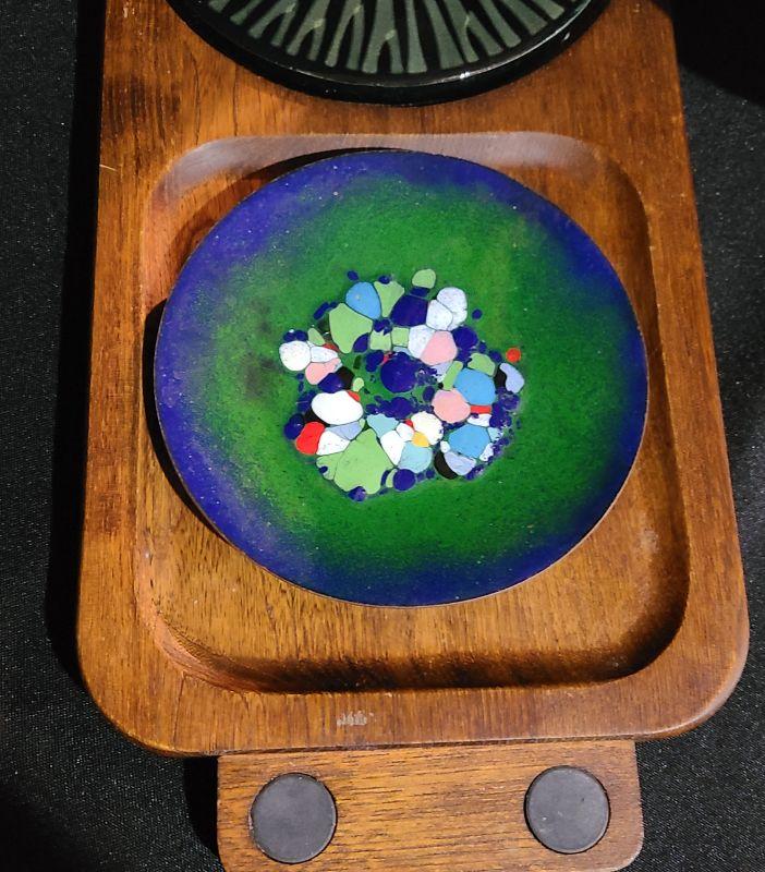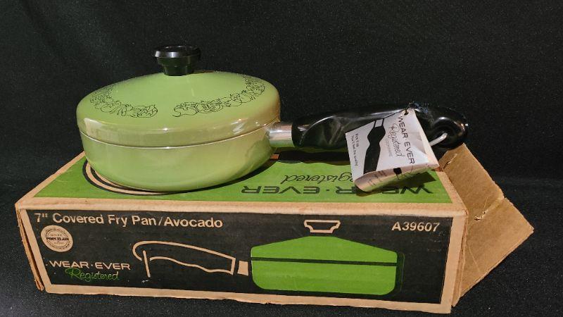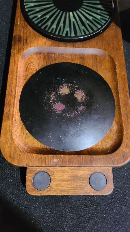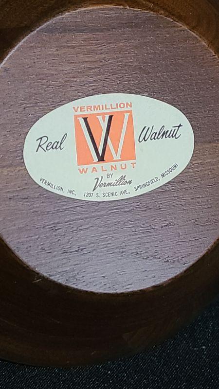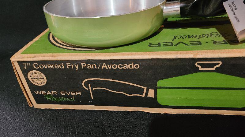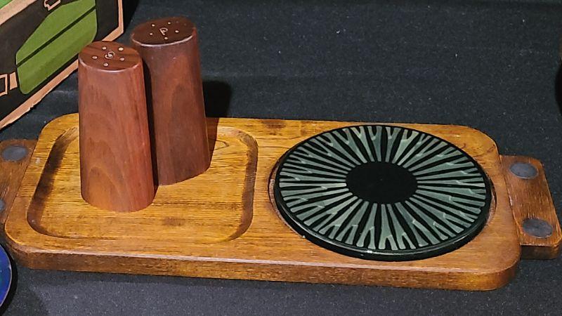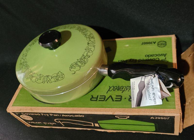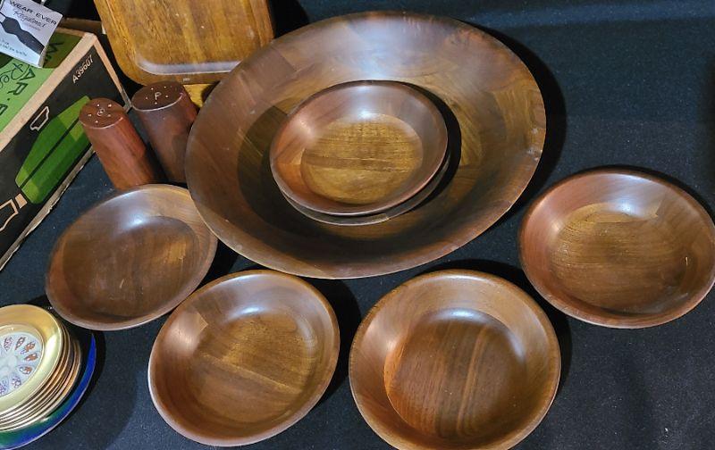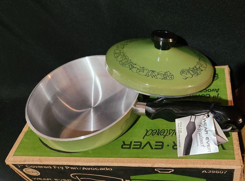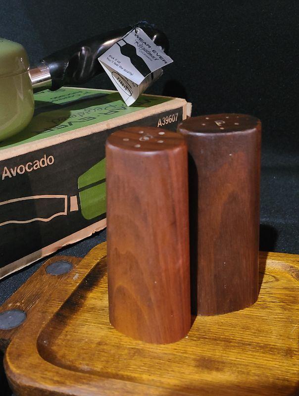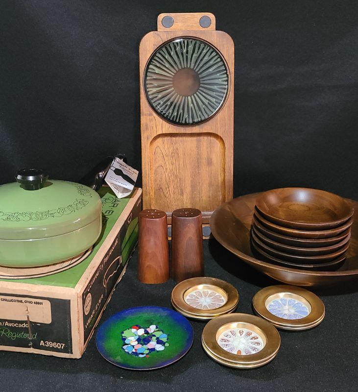 Fun lot of Mid Century Modern Serving pieces: New Wear-Ever Aluminum 7" covered Avocado Frypan with mushrooms on top, Serv Wood Hotplate, Pottery and Metal Coasters, Enamelware trinket Dish, and Vermillion Real Walnut Serving Bowls set new!