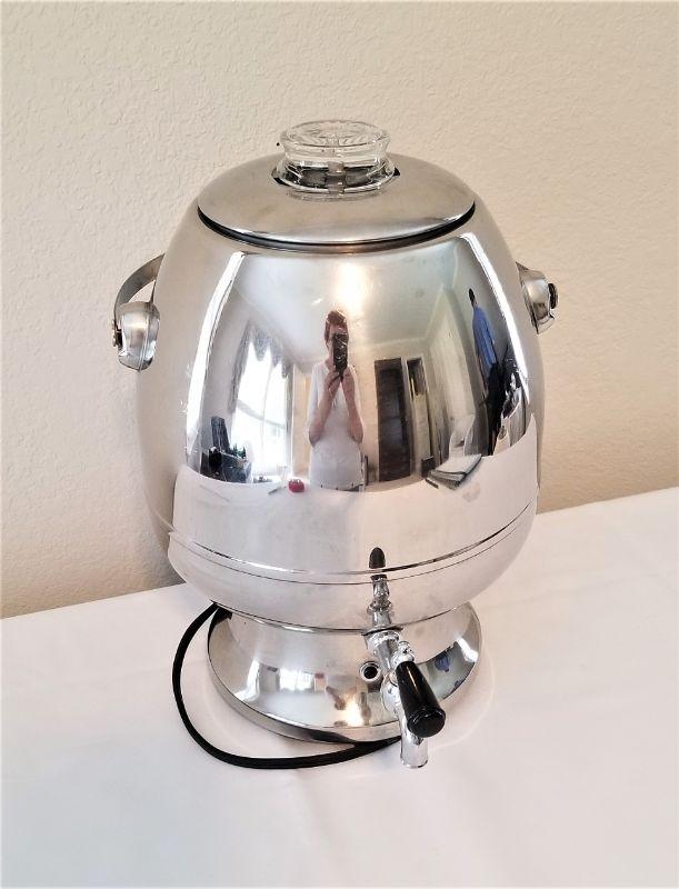 Tried as I might, there was no way I could take this photo without being in the shot - the surface was that shiny! MidCentury Hamilton Beach Party Coffee Perculator - complete - stainless steel. 14" tall, Appears to be in working condition.