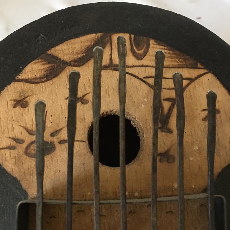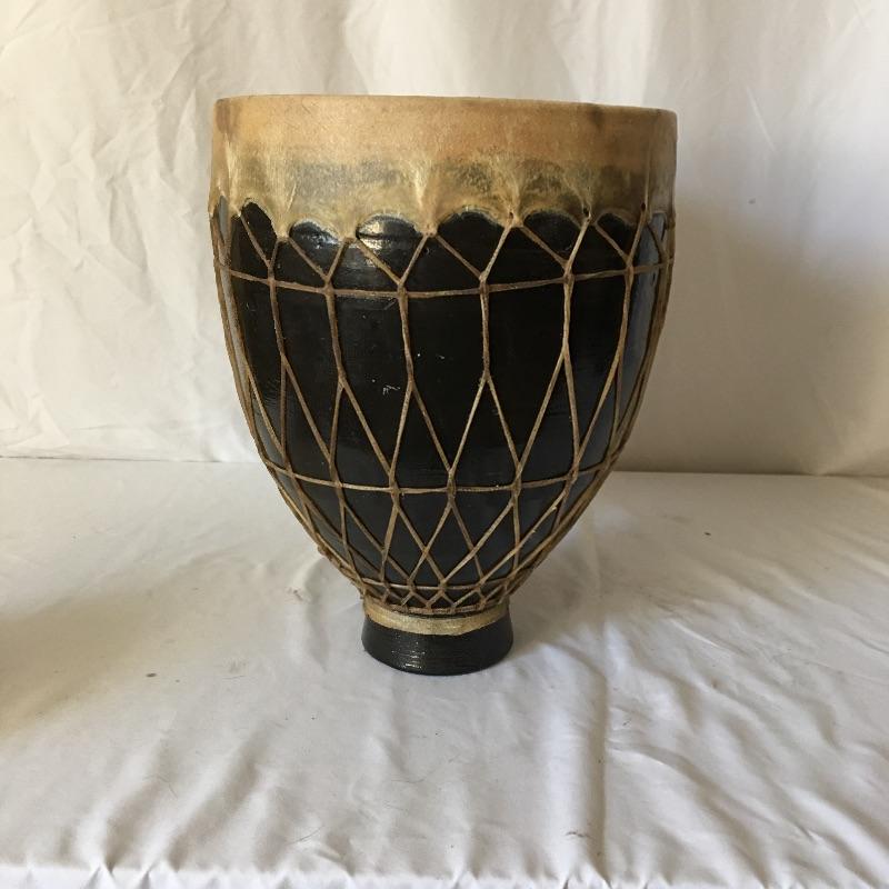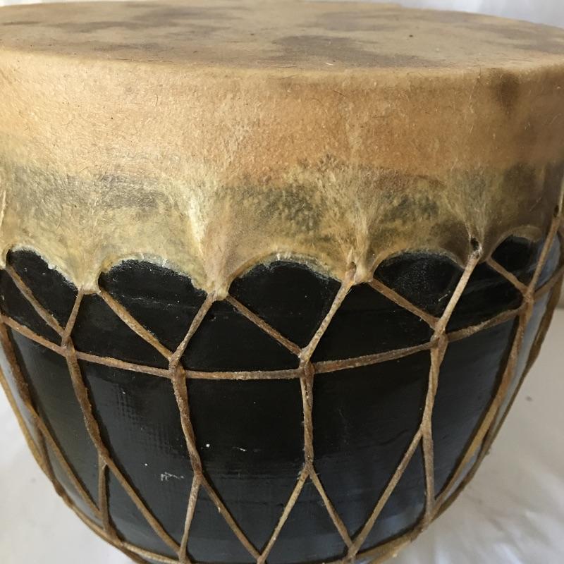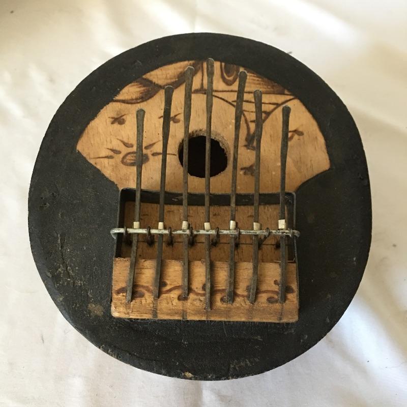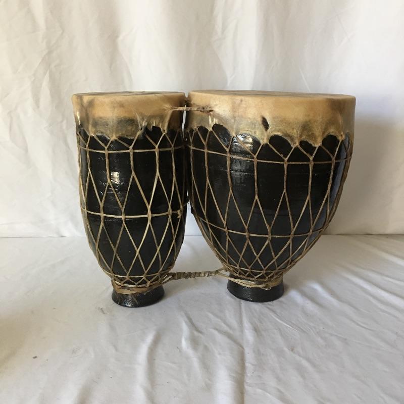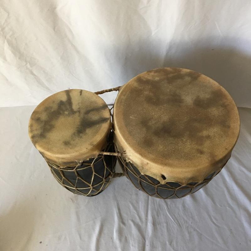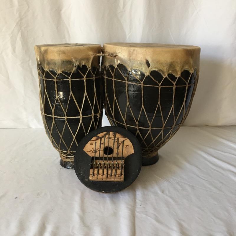 Moroccan bongo drums and thumb piano. Lot includes thumb piano and a set of bongo drums. Learn to play these unique instruments and you will amaze yourself and your friends. Drums measure 10” x 16” x 12.75”.