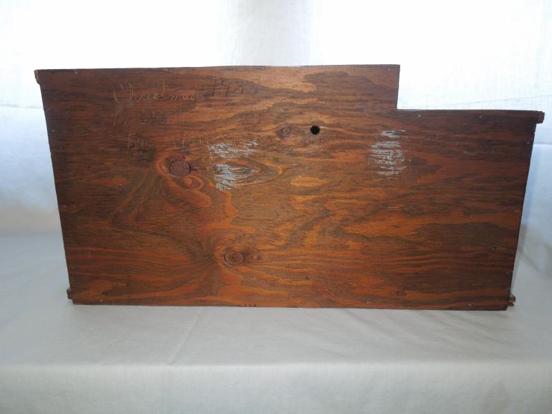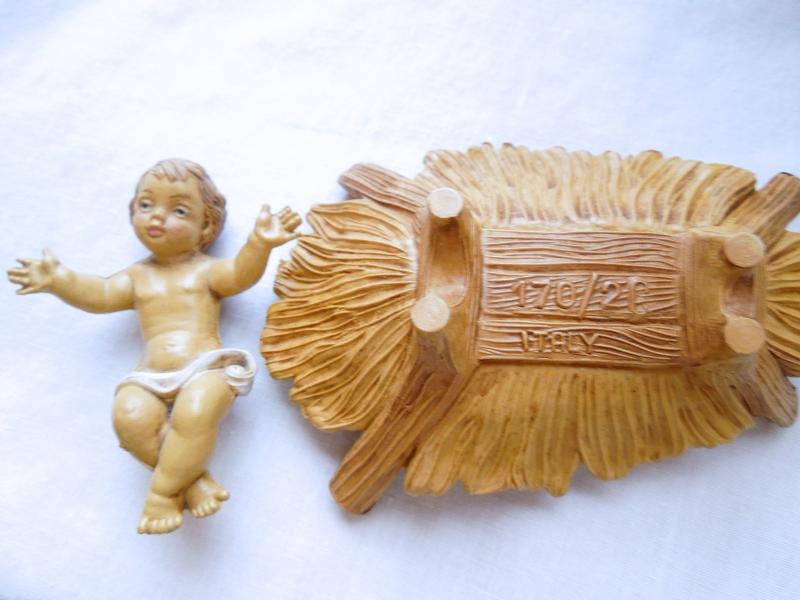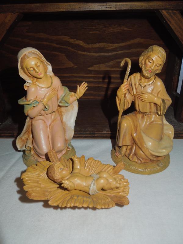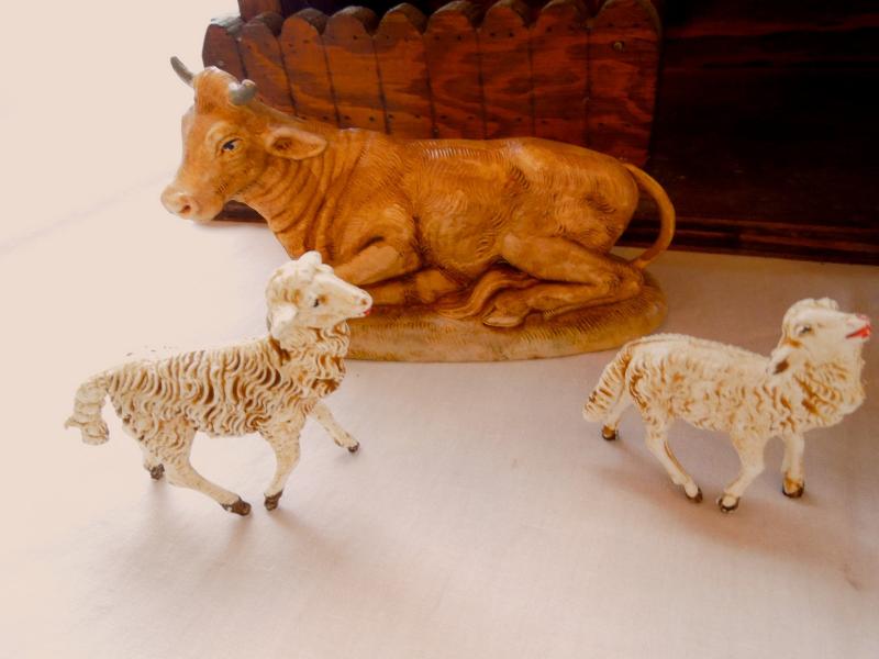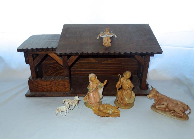 Very nice homemade stained pine manger scene with Mary, Joseph, baby Jesus, 2 sheep, angel and cow. Molded figurines. Some marked Italy. Sheep are plastic, the others have a resin base. Manger is 21" x 11" x 9". Gift inscription on backside of manger.