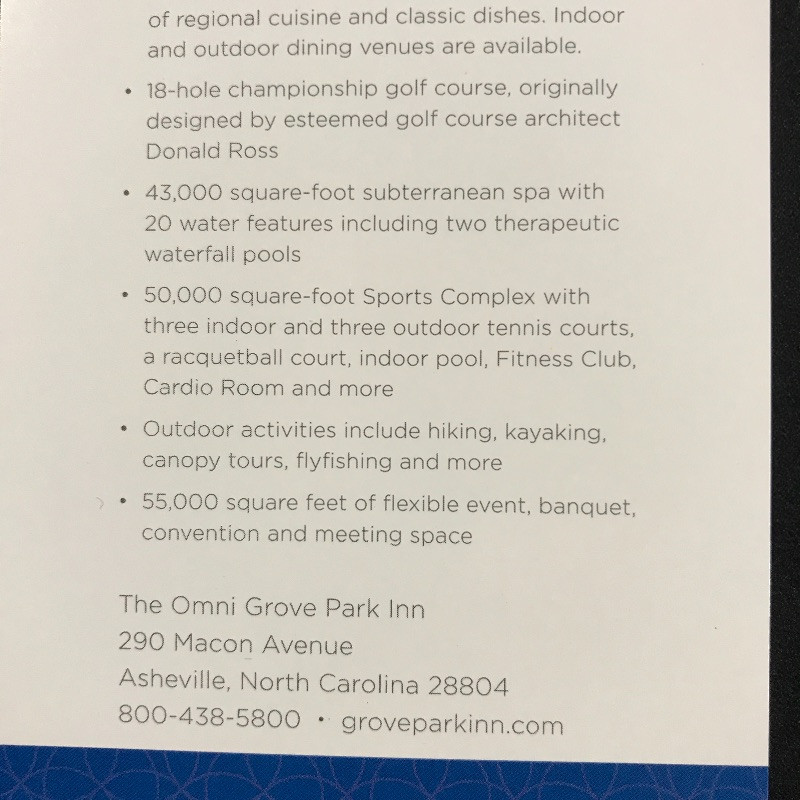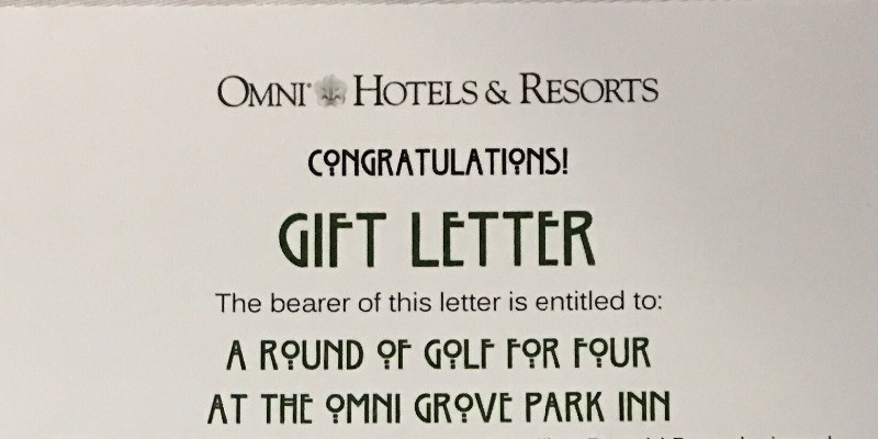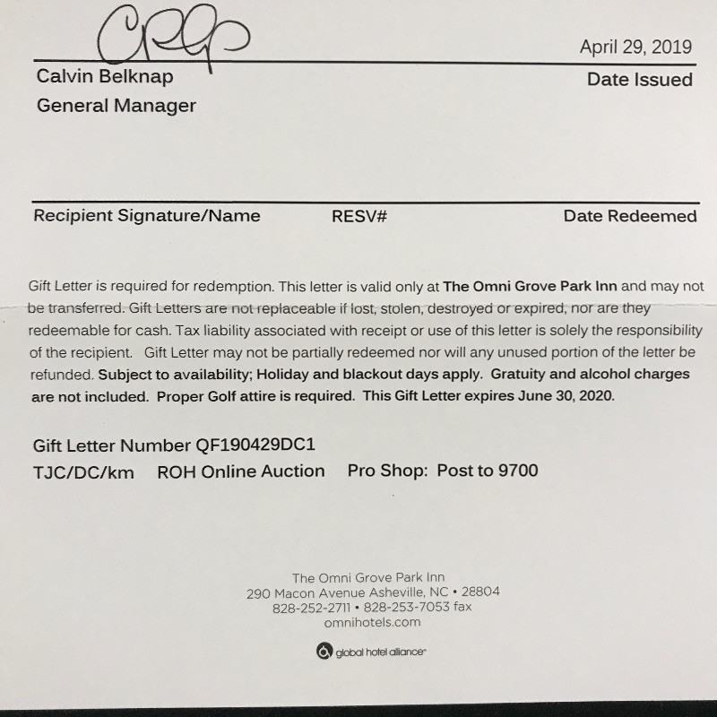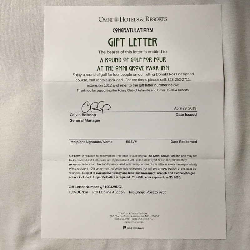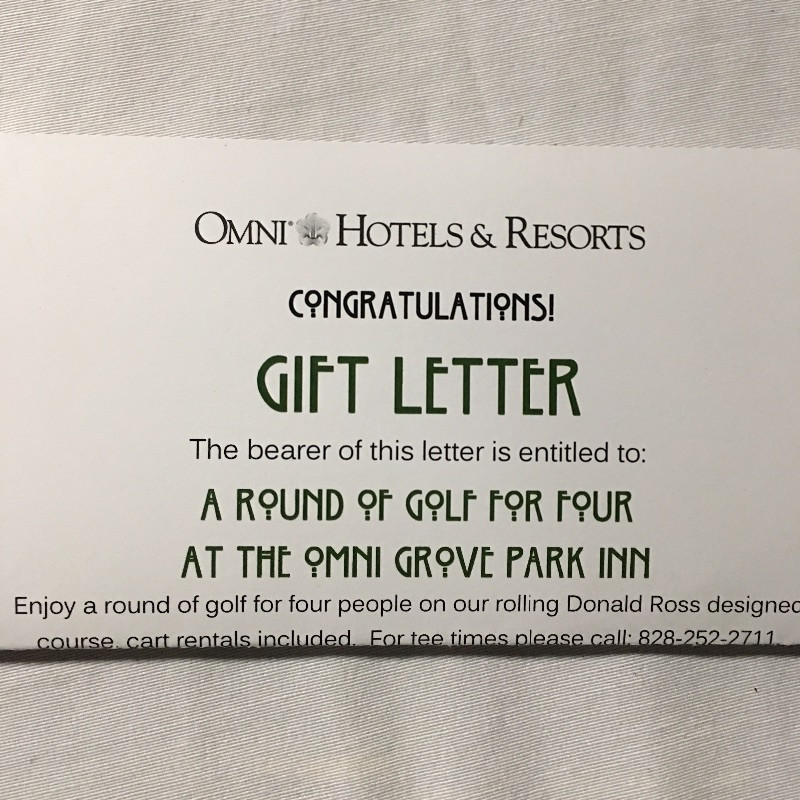 Spend some time at the beautiful Omni Grove Park Inn with 3 of your friends playing a round of golf with this lot. The gift letter is for a round of golf for four on the Donald Ross designed course. Enjoy the spectacular surroundings and have a great day of golf at the Omni Grove Park Inn.