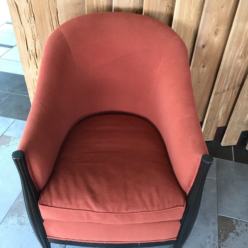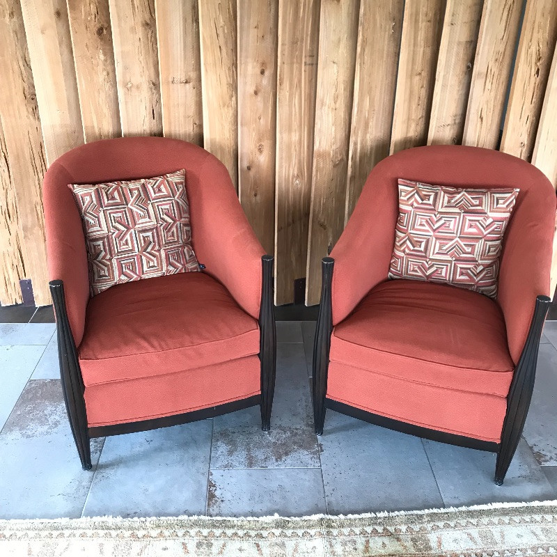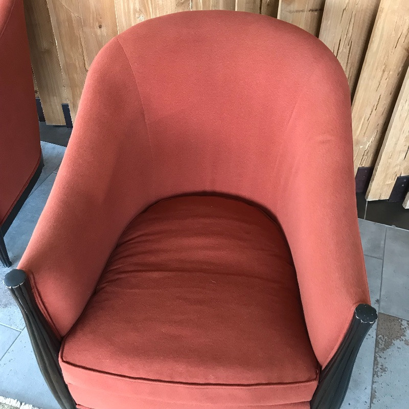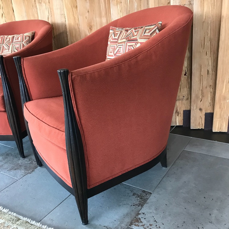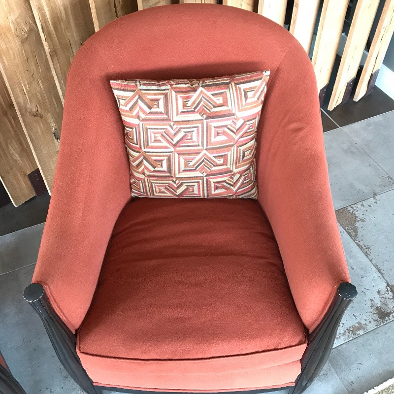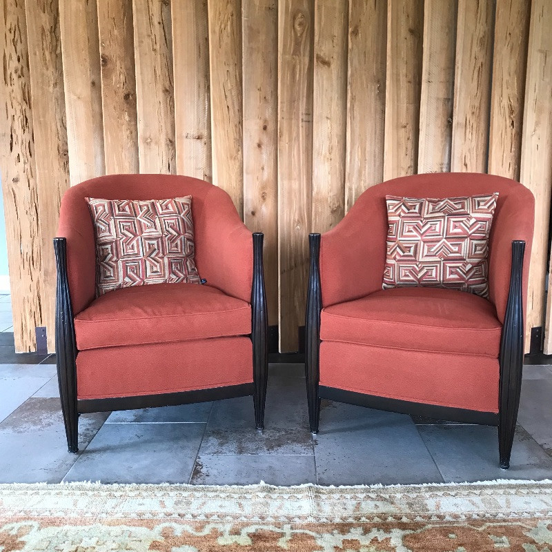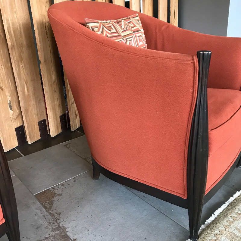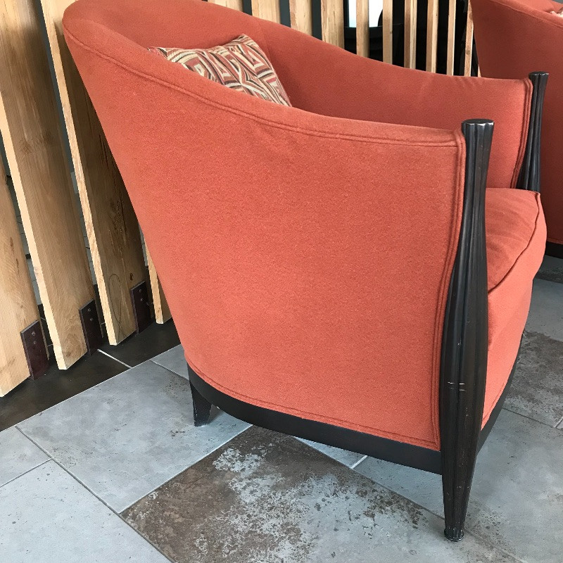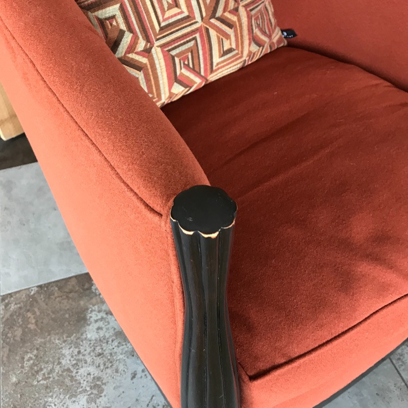 These lovely burnt orange and black wood framed chairs would look great anywhere. The fabric is soft and in great condition. These are the envelope style chair with a tailored look. Each measures 27” x37” x38”. seat cushion measures 26.5” to back.