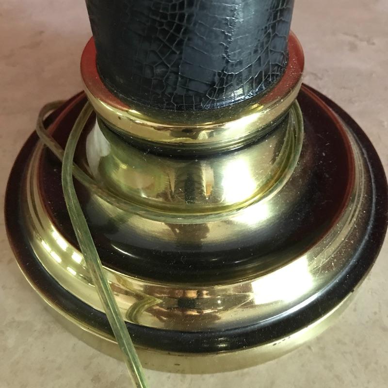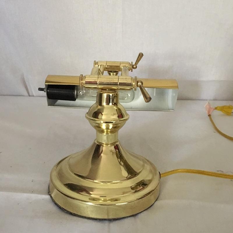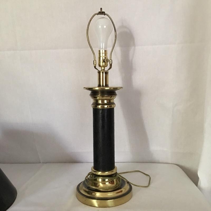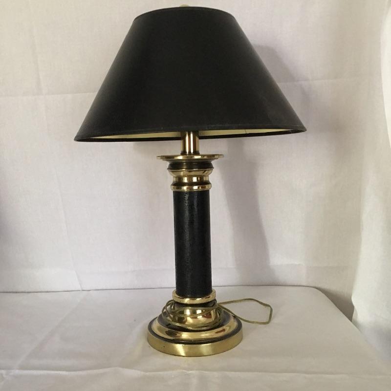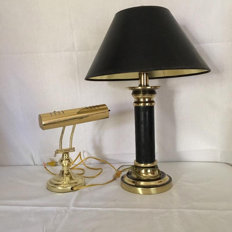 Brass bankers lamp and heavy table lamp. Light up your life and your home with this elegant pair of lamps. Black lamp has snake like material on black part. It’s Heavy brass that measures 26” tall.