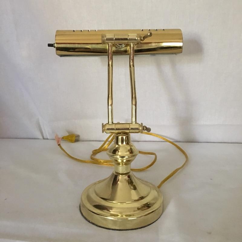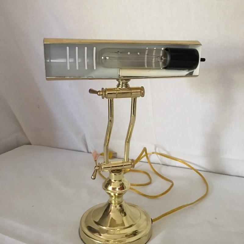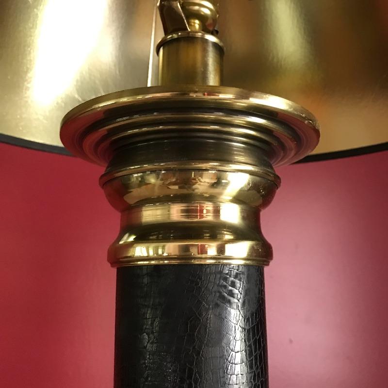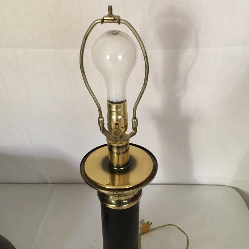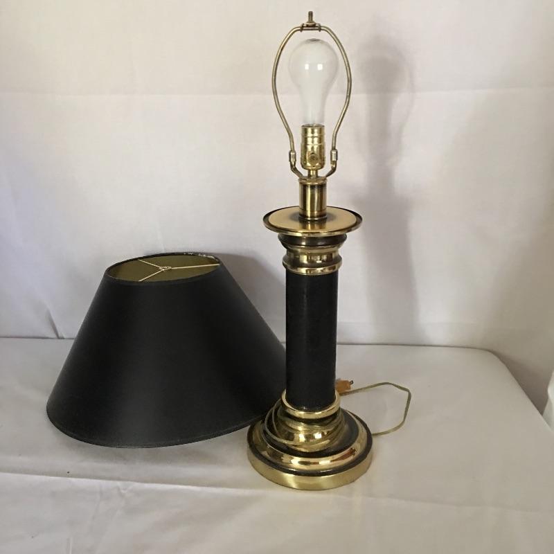 Brass bankers lamp and heavy table lamp. Light up your life and your home with this elegant pair of lamps. Black lamp has snake like material on black part. It’s Heavy brass that measures 26” tall.