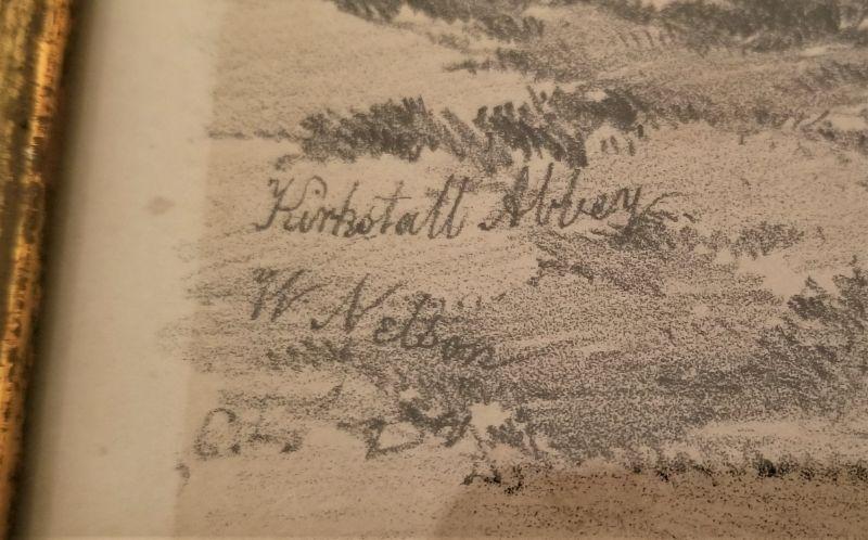 Victorian era engraving of "Kirkstall Abbey" by W. Nelson - age related foxing. Typical romantic scene you would see in a upper middle class Victorian parlor. Measures 18.5" x 15.5"