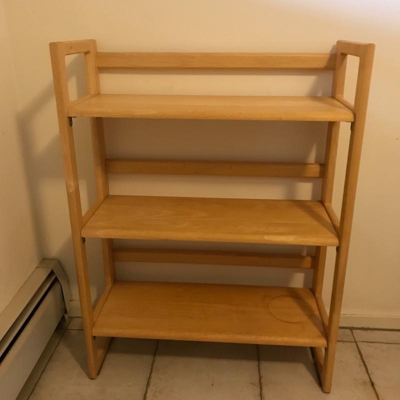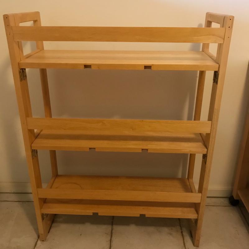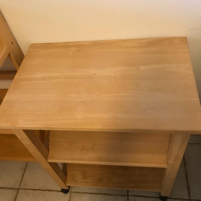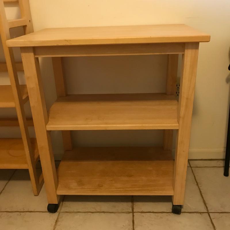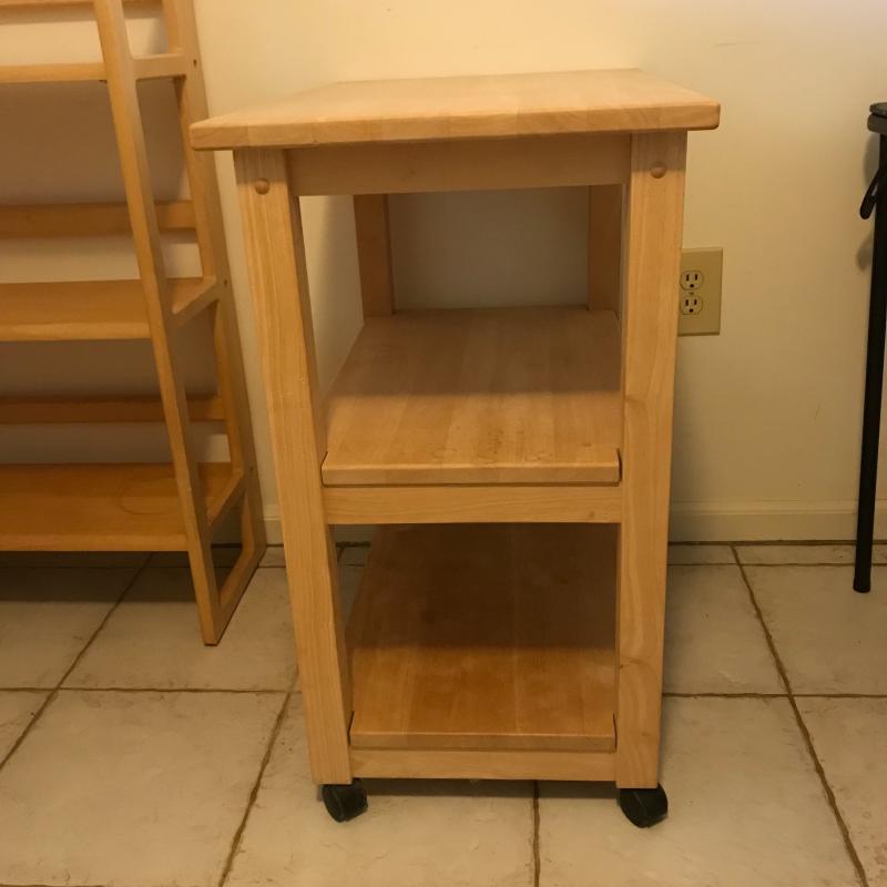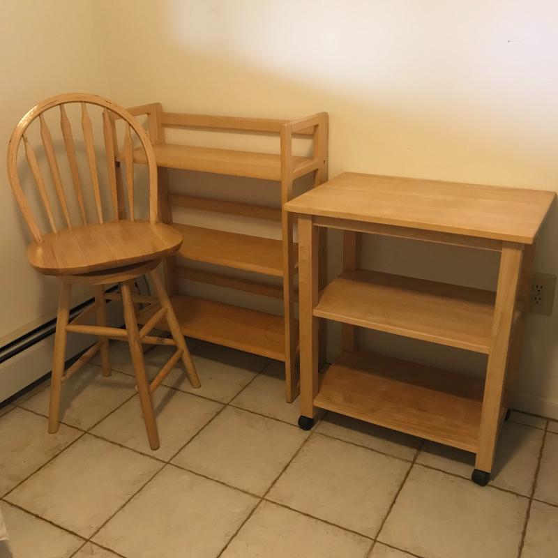 Three durable pieces all similarly colored. A rolling cart that glides smoothly looks great and measures approx. 25.75” x 17” x 30”. Lot also includes a sturdy book shelf that folds in for easy storage and a swivel chair. The swivel chair is missing one foot rest and there is another foot rest that appears to have been chewed on. Some wear is noted in photos. Local pick up only.