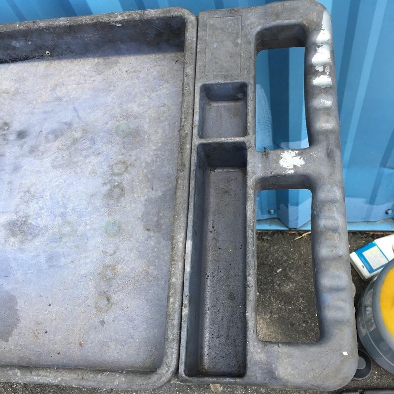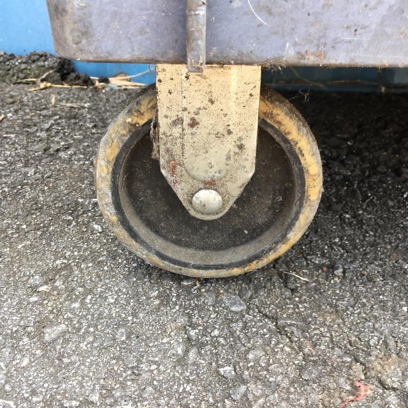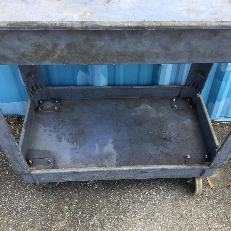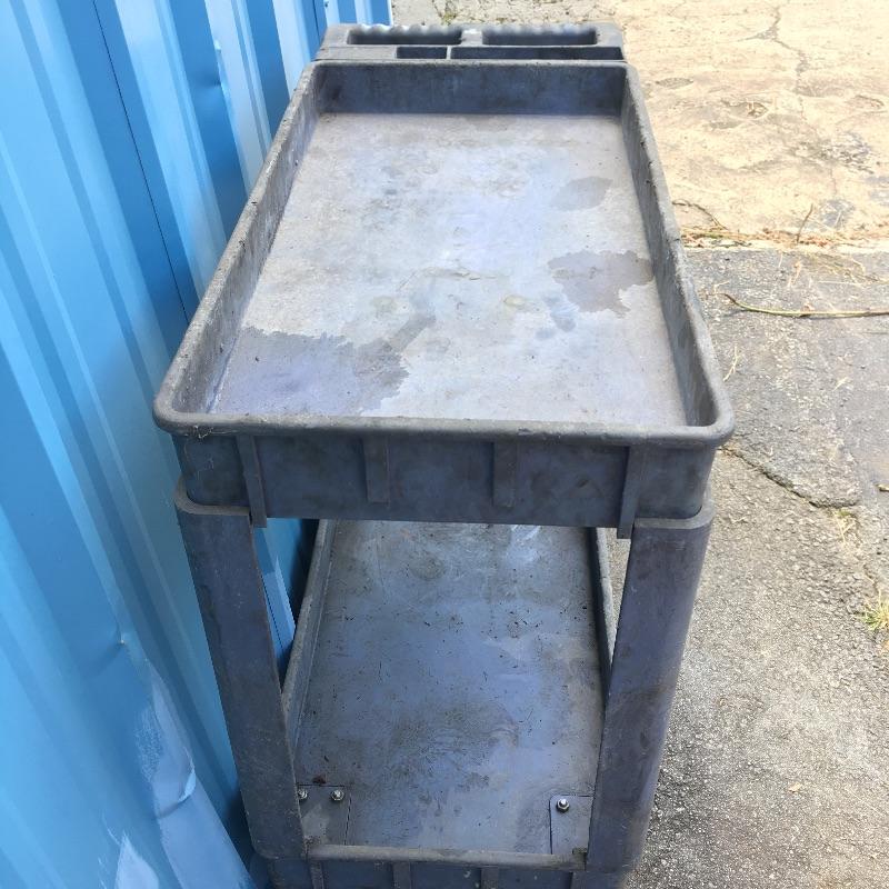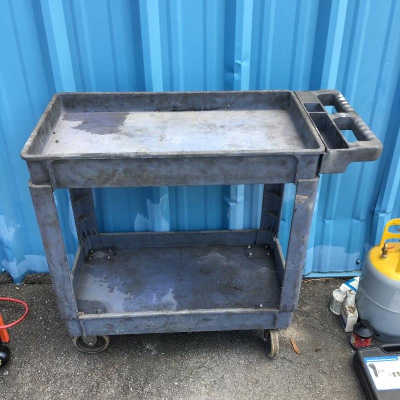 Rolling tool cart with shelf on bottom made out of what seems to be a composite and is very sturdy, see pictures for weight limit. Have your tools and parts close by with this super handy cart. Cart measures 17” x 37.5” 33.5”.