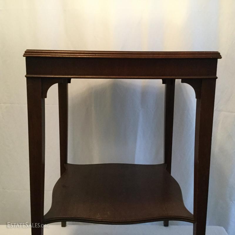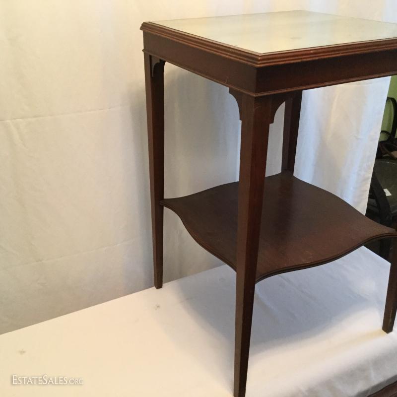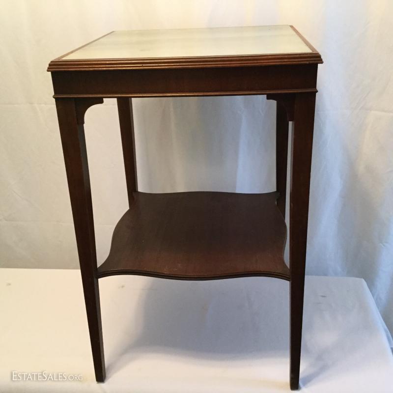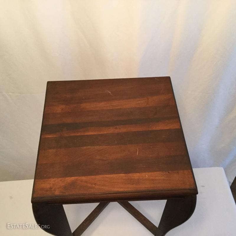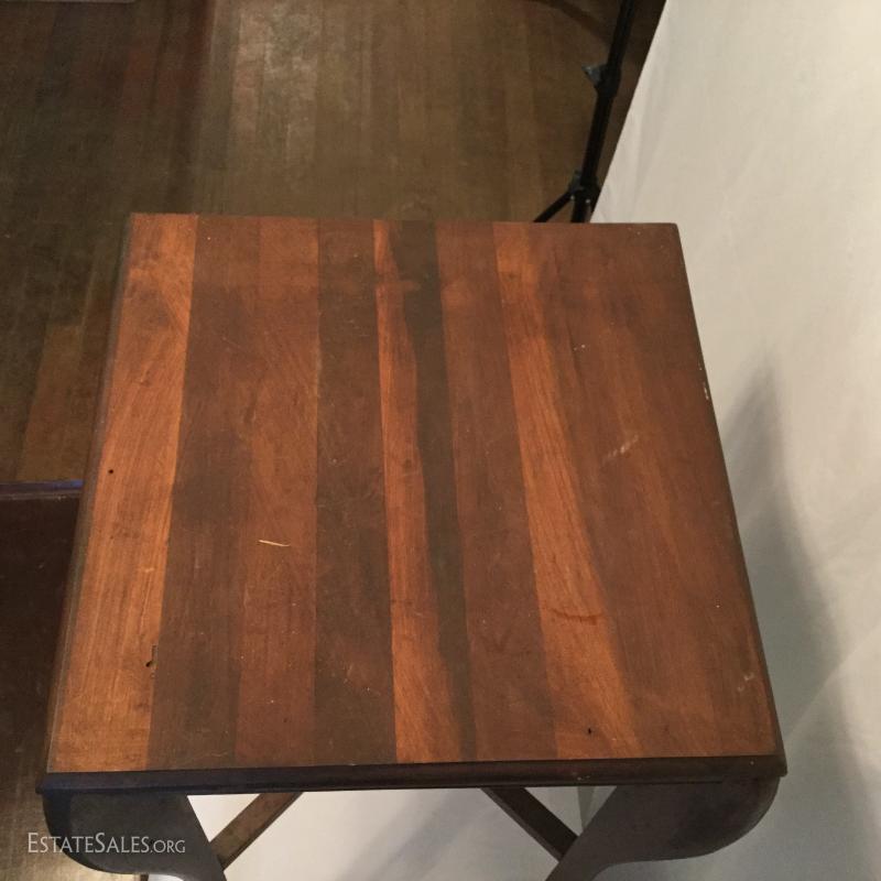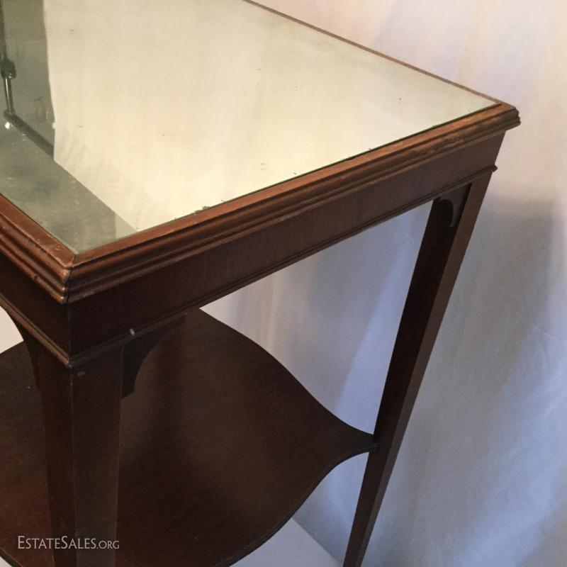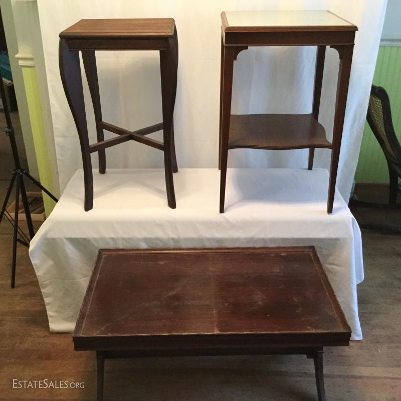 Two wooden tall, side tables (one mirrored top) and one wooden coffee table. Coffee table has a label underneath from ABE Mann Furniture Agency in New York.