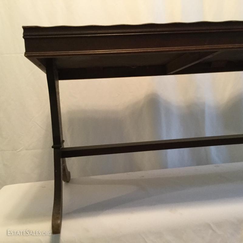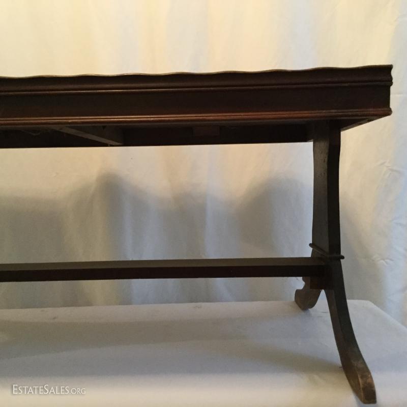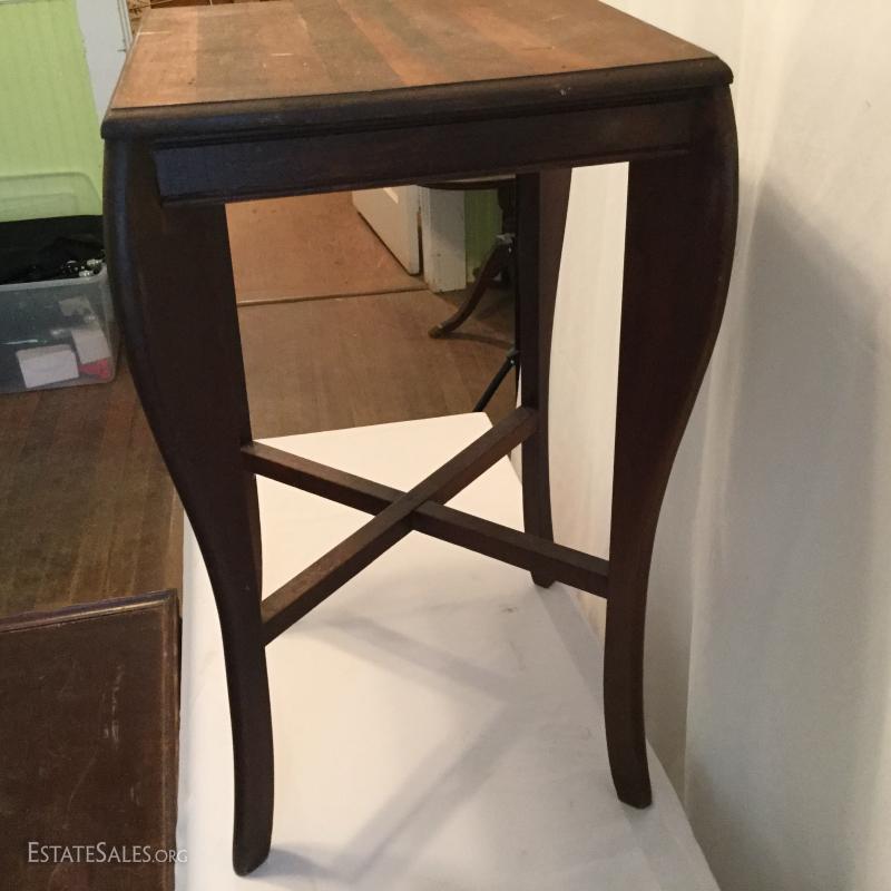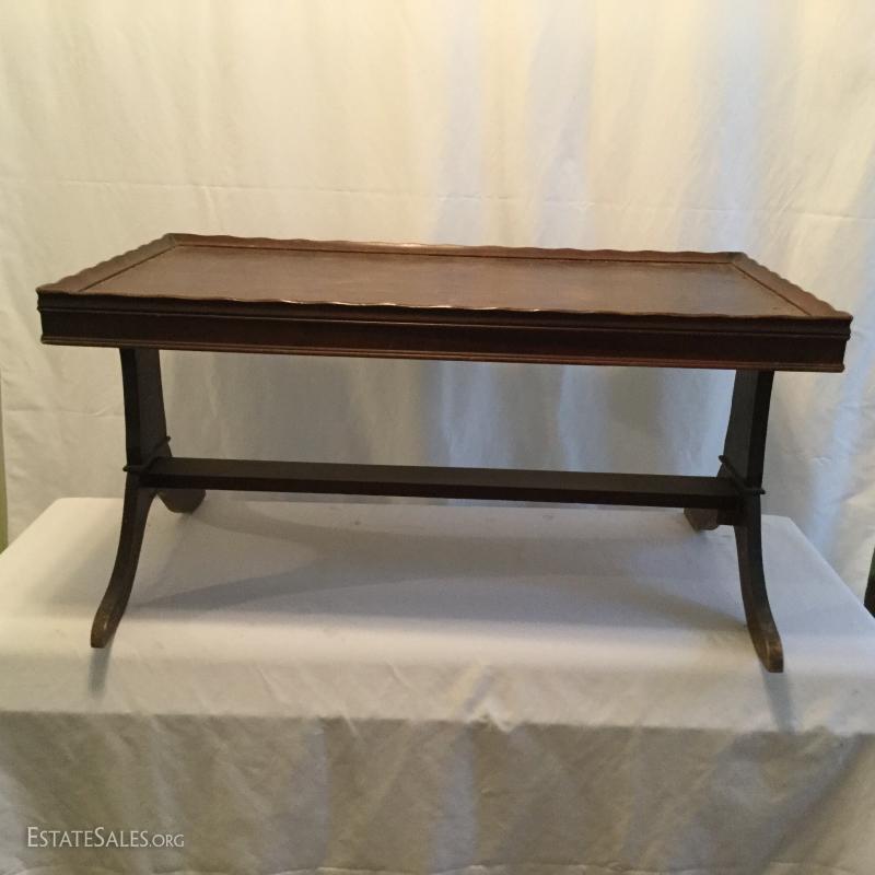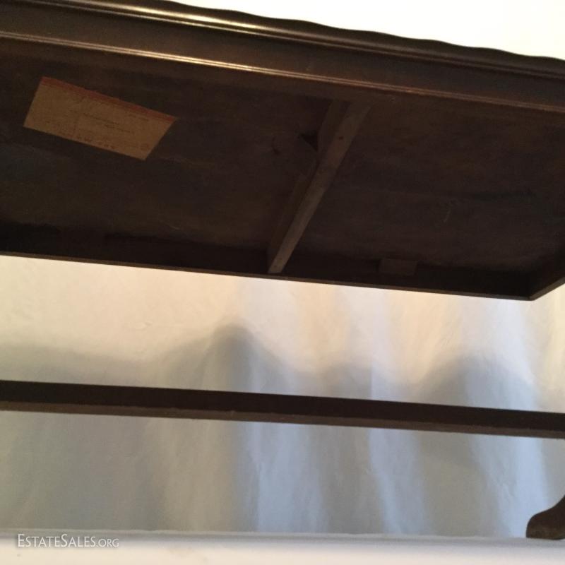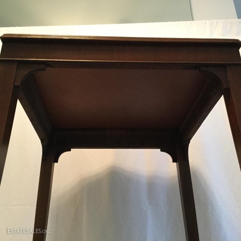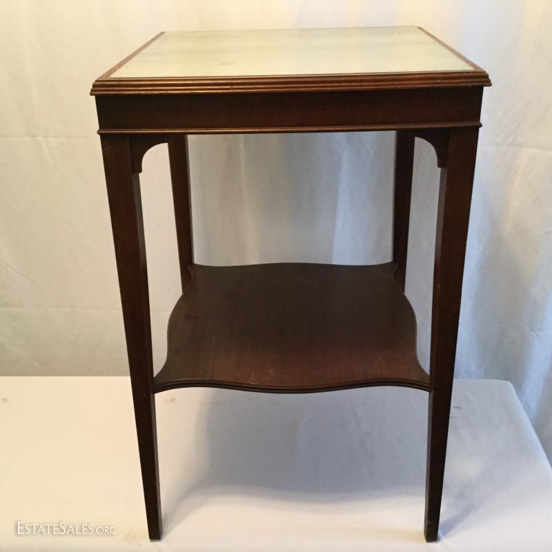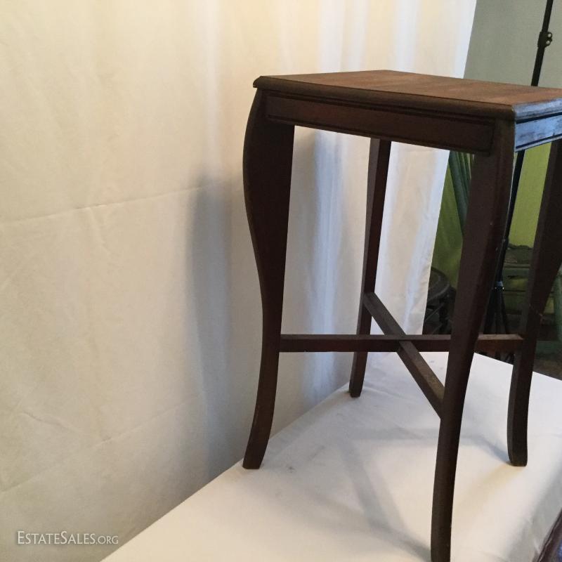 Two wooden tall, side tables (one mirrored top) and one wooden coffee table. Coffee table has a label underneath from ABE Mann Furniture Agency in New York.