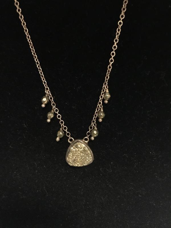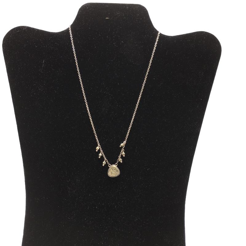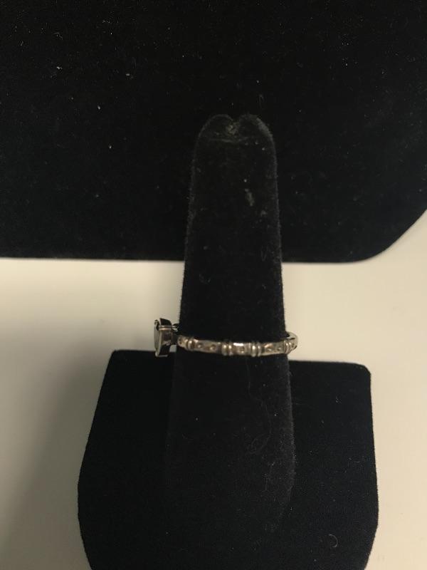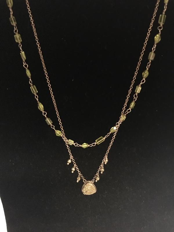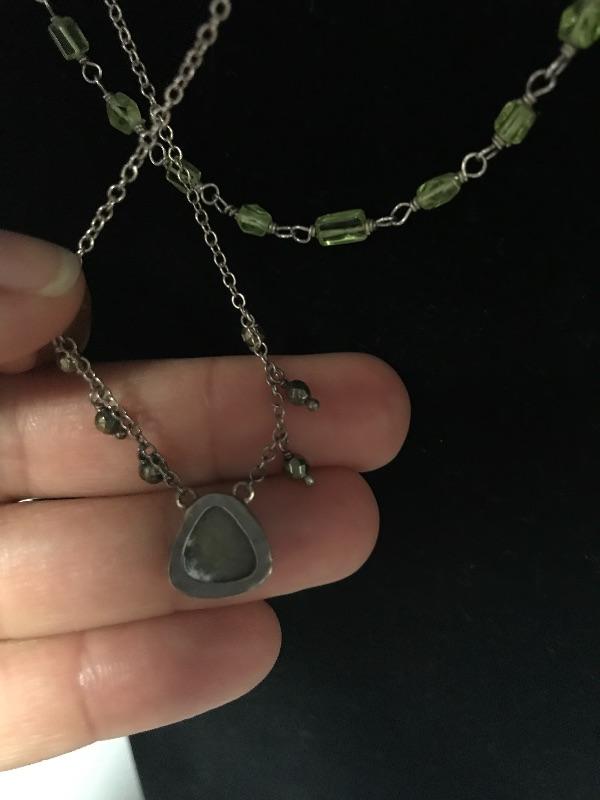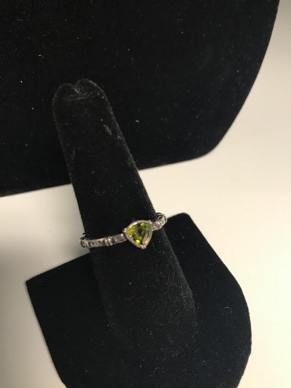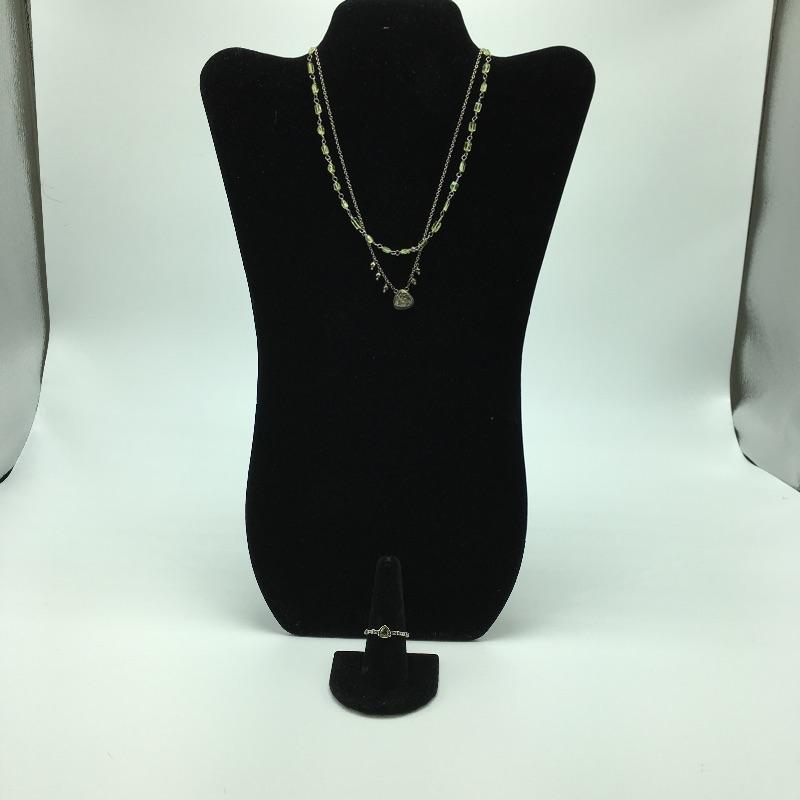 Two Silpada necklaces and ring. This lot includes a Belle Fleur stack ring size 9.5 with green cubic zirconia and sterling silver, a Trade Secret sterling silver necklace with Pyrite pendant as well as a sterling silver and Peridot necklace with 2” extender. Both necklaces are 16” in length.