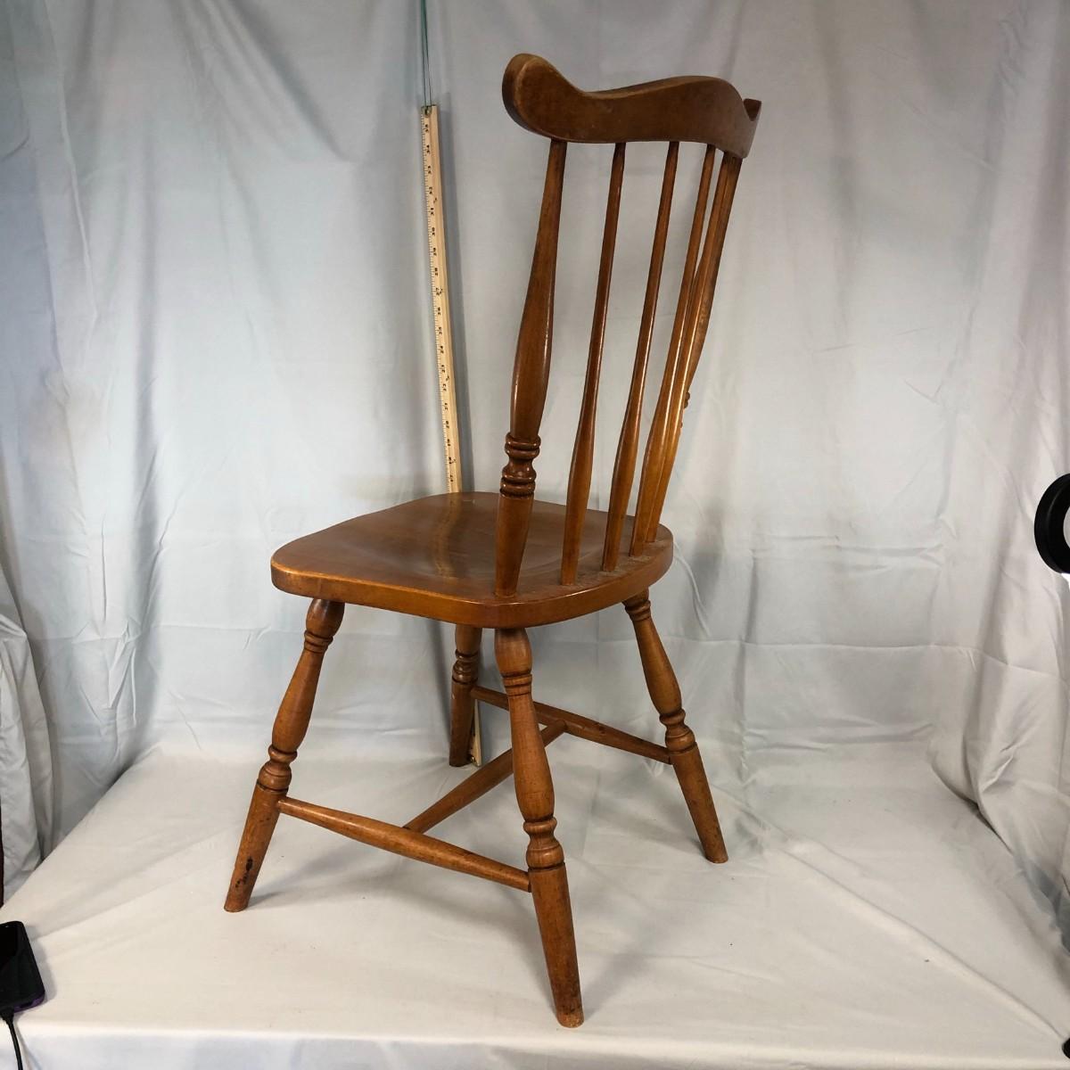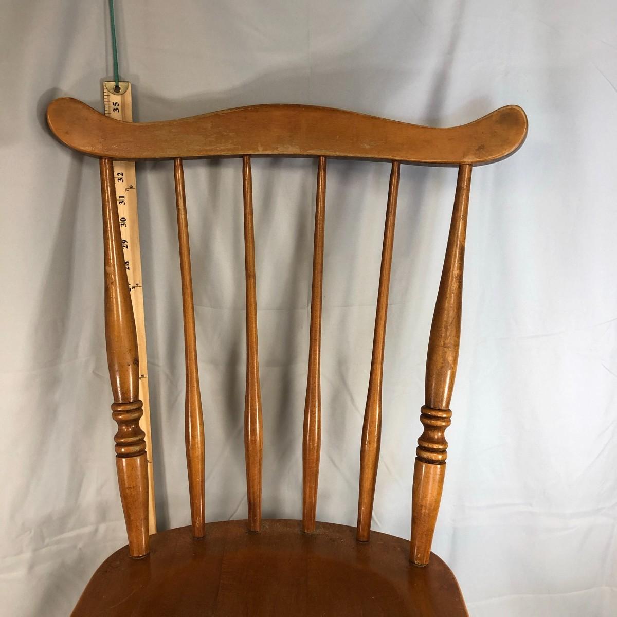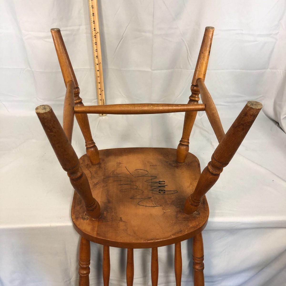 This is a solid piece - no wiggles! I think that it is made of maple and the only issue is the finish needs a little work in some places, but you could also start using it as is right now. It really is a nice chair. It is about 36" tall and the seat height is at about 17" tall.