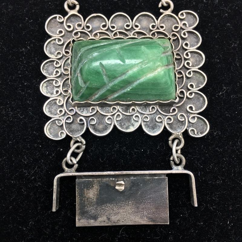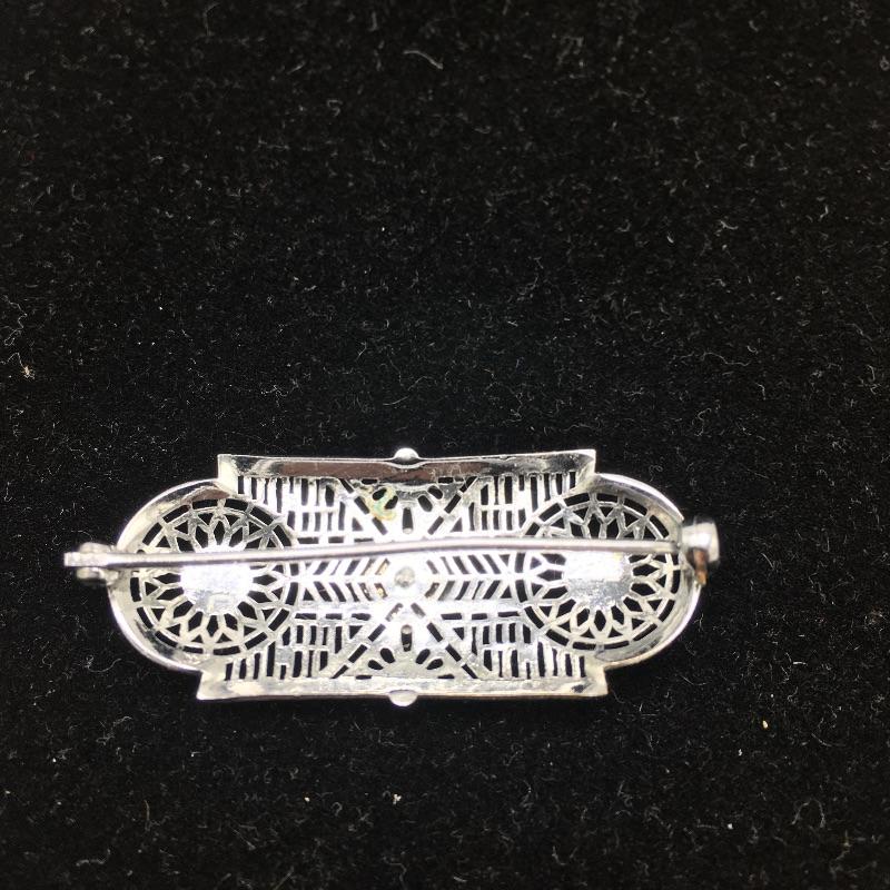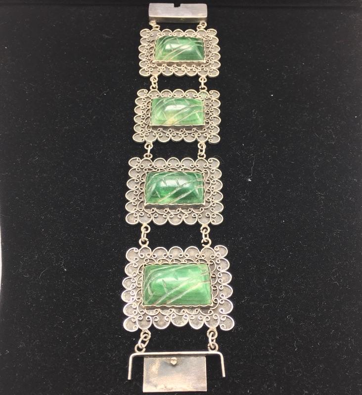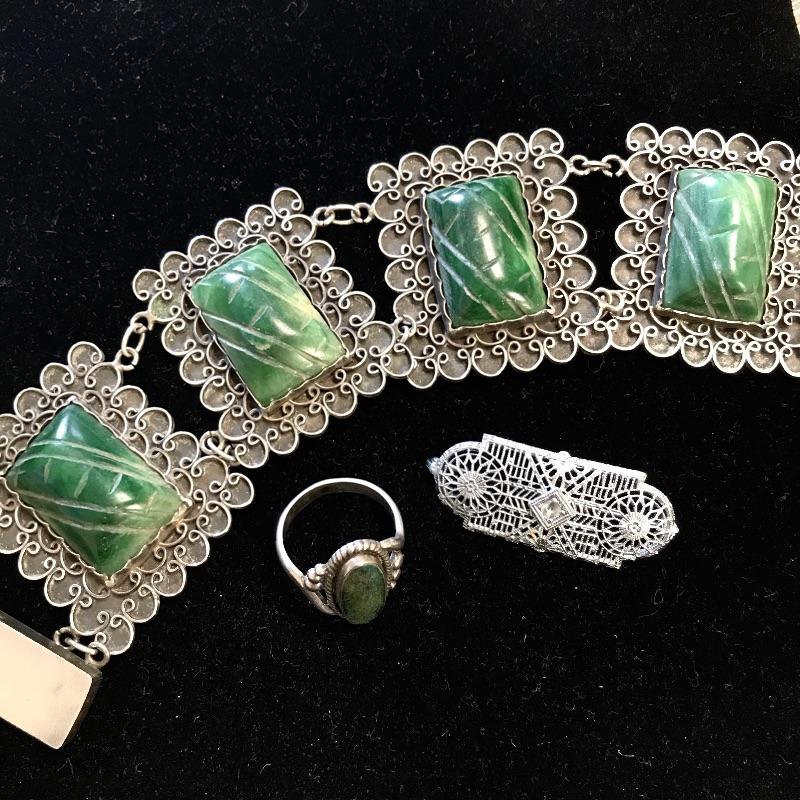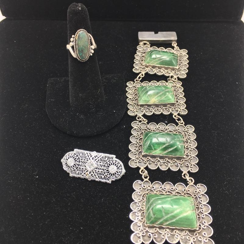 Lot includes ring with a dark green stone that is marked sterling. There is also a silver colored pin that is unmarked and is missing center stone. Last you’ll find a bracelet with four green stones marked 900 sterling.