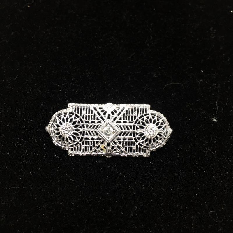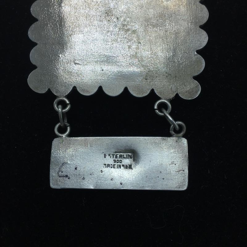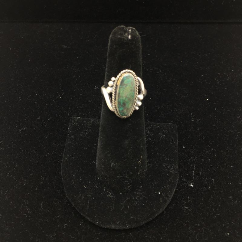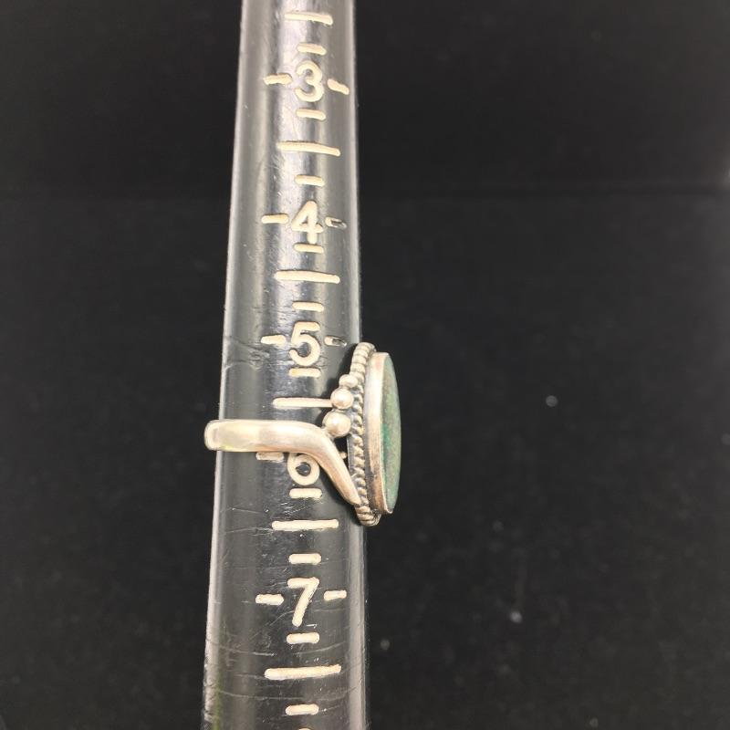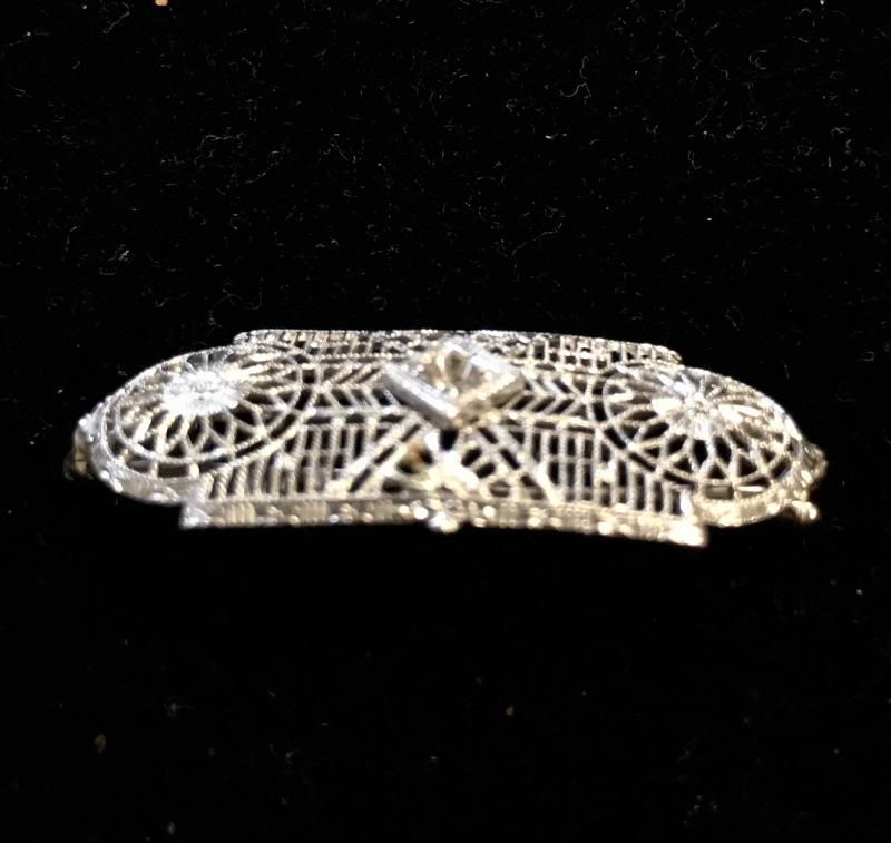 Lot includes ring with a dark green stone that is marked sterling. There is also a silver colored pin that is unmarked and is missing center stone. Last you’ll find a bracelet with four green stones marked 900 sterling.