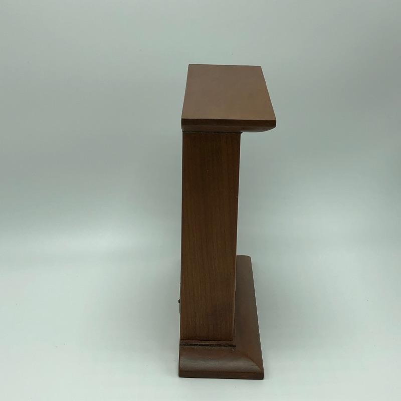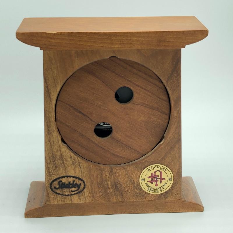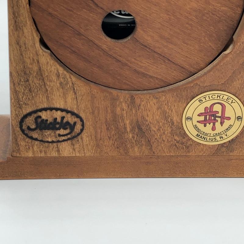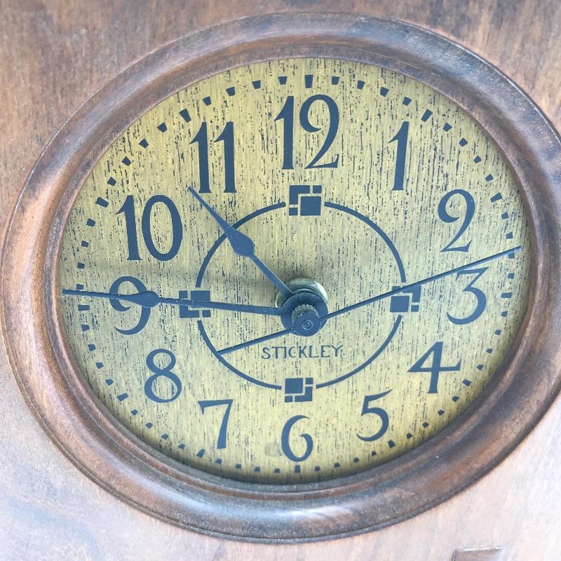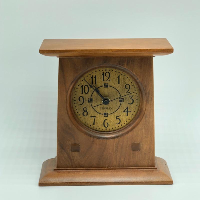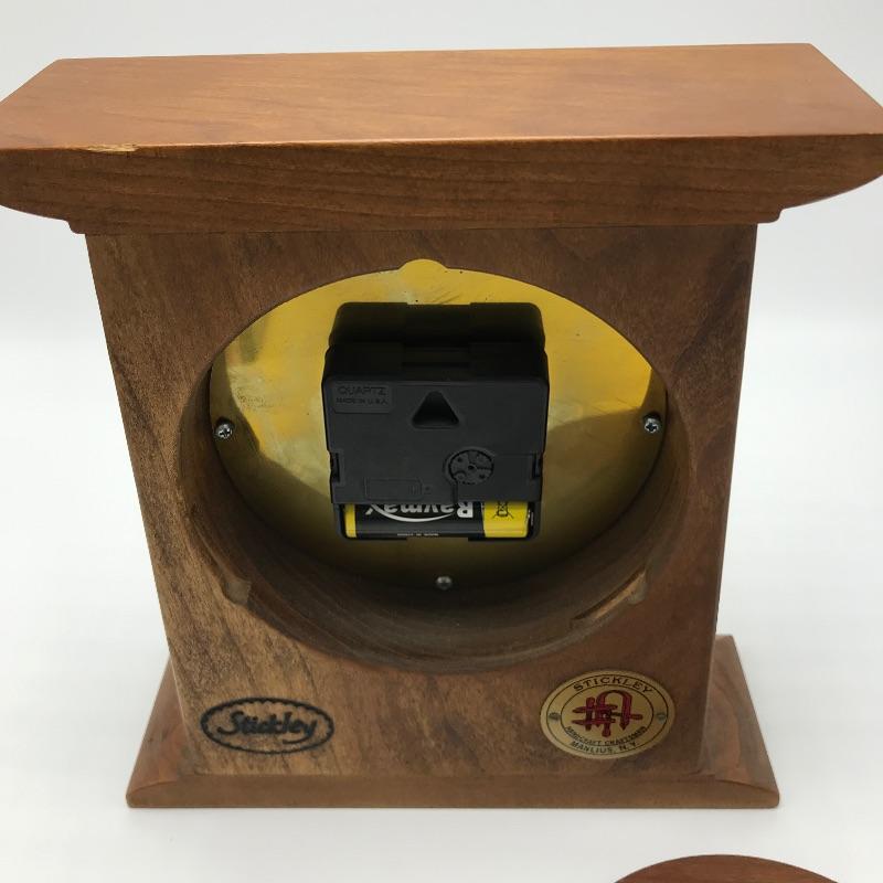 Beautiful Arts & Crafts wooden mantel or desk clock by Stickley. This is an EJ Audi contemporary reproduction that is battery operated. It is not currently working which may just be a dead battery. Could not check. Small chip in the wood on top.