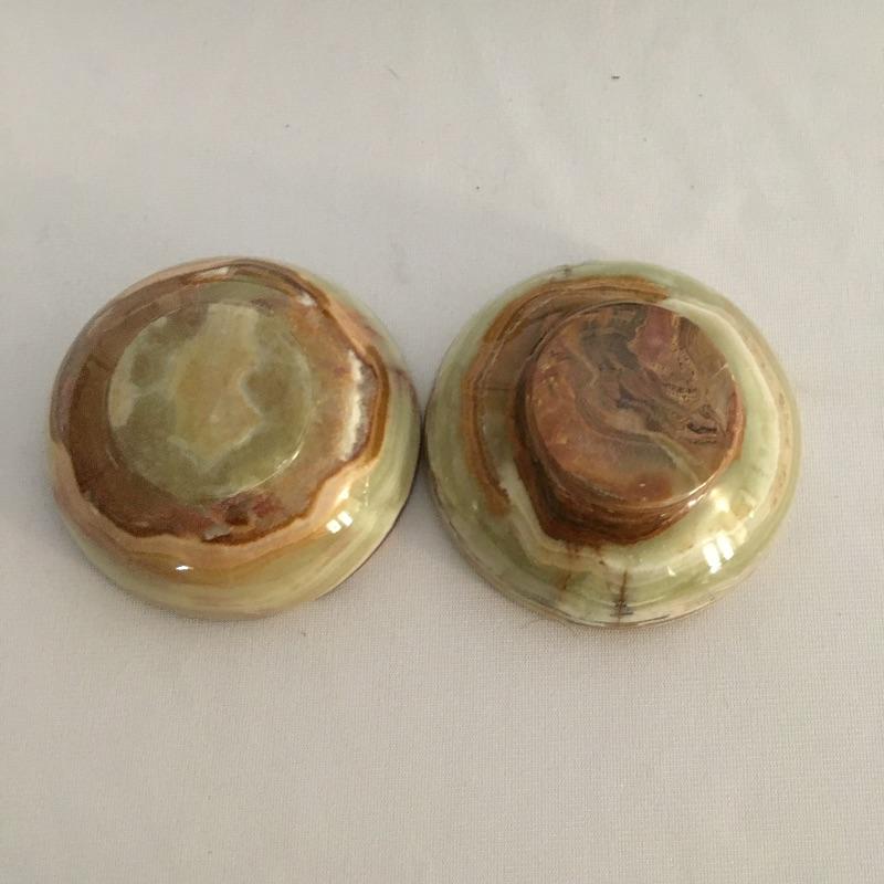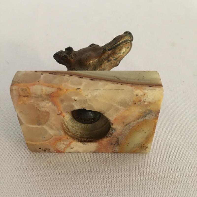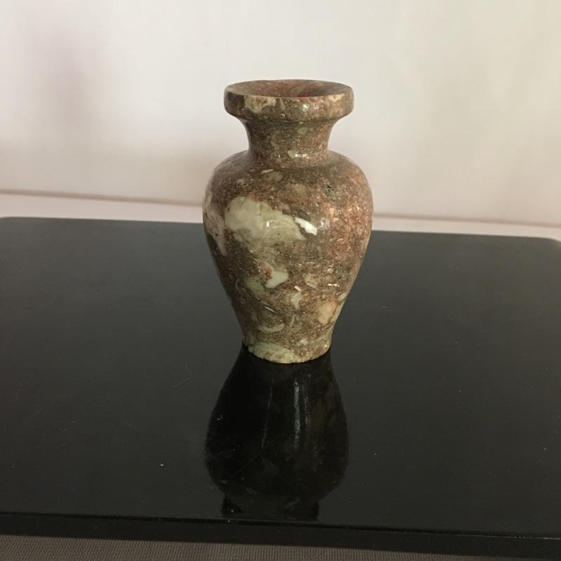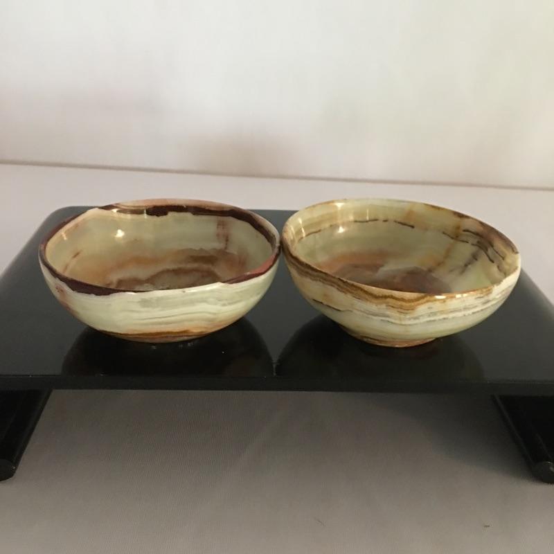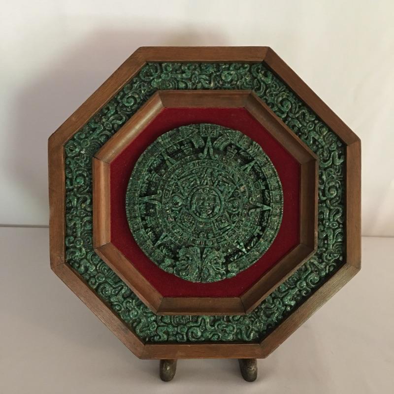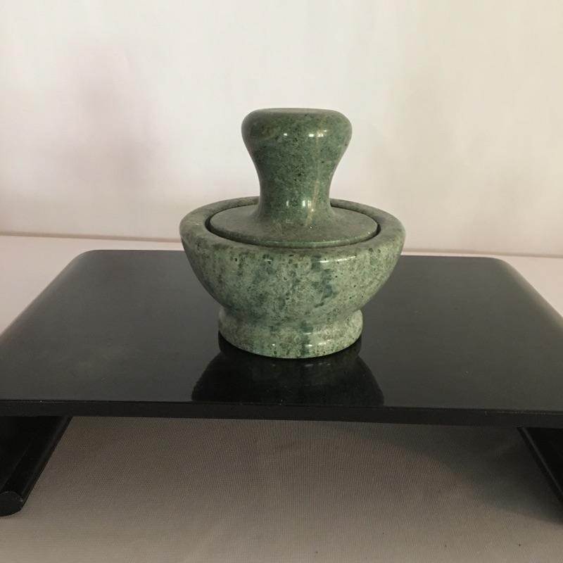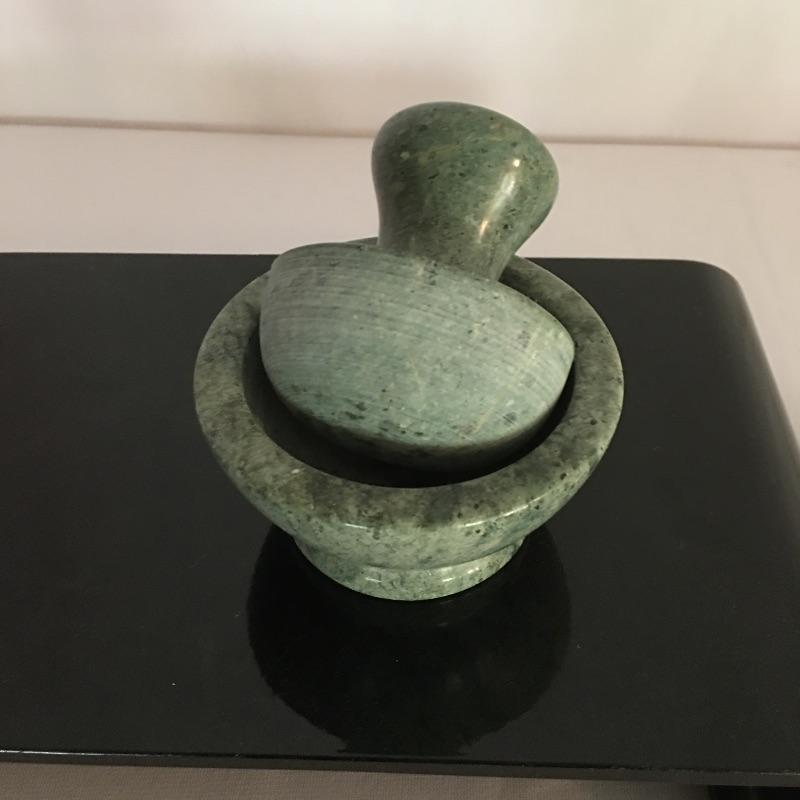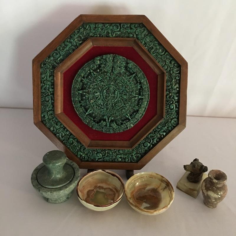 Stone and more. Lot includes some mortar and pestle, two small stone bowls(possibly alabaster), one mini stone vase, metal dog on stone base and a octagon shaped wooden and malachite artwork. Octagon shaped piece measures 13.5” x 13.5” x 1”.