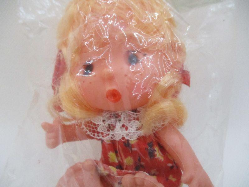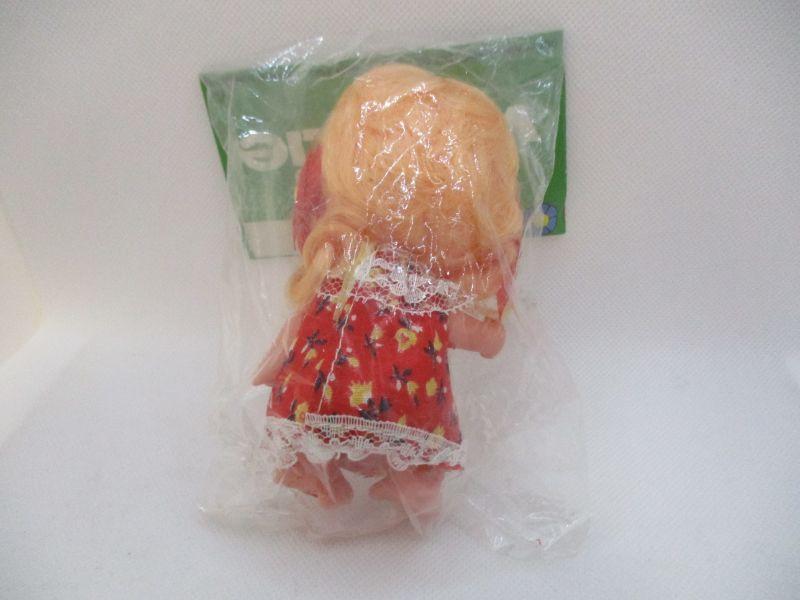 This cutie was distributed by Arrow Wholesale and made in Hong Kong. She is 5" tall with moveable arms and legs (at the shoulders and hips) and in her original sealed packaging.