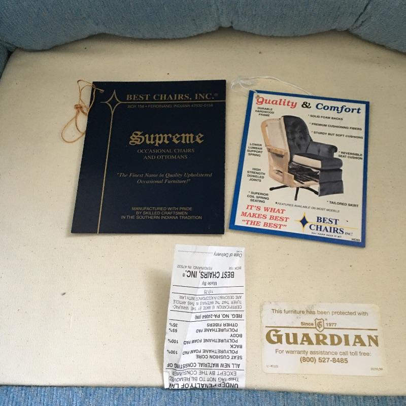 Swivel rocker made by Best Chairs Inc from Indiana. Sit back and relax in this baby blue swivel rocker. Rocker measures 32” x 34” x 36” with a 18” seat height.