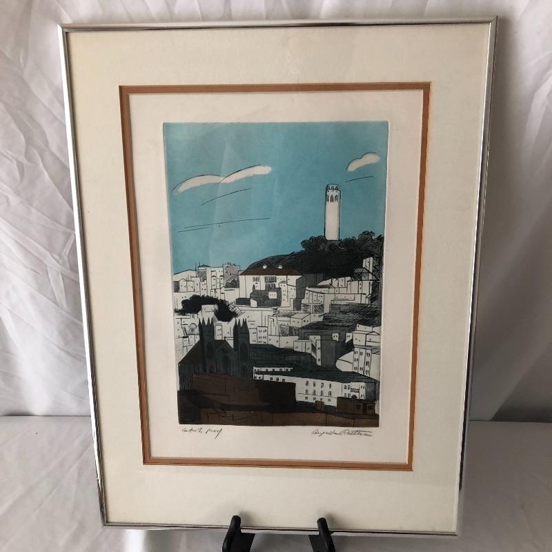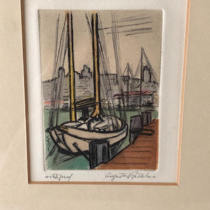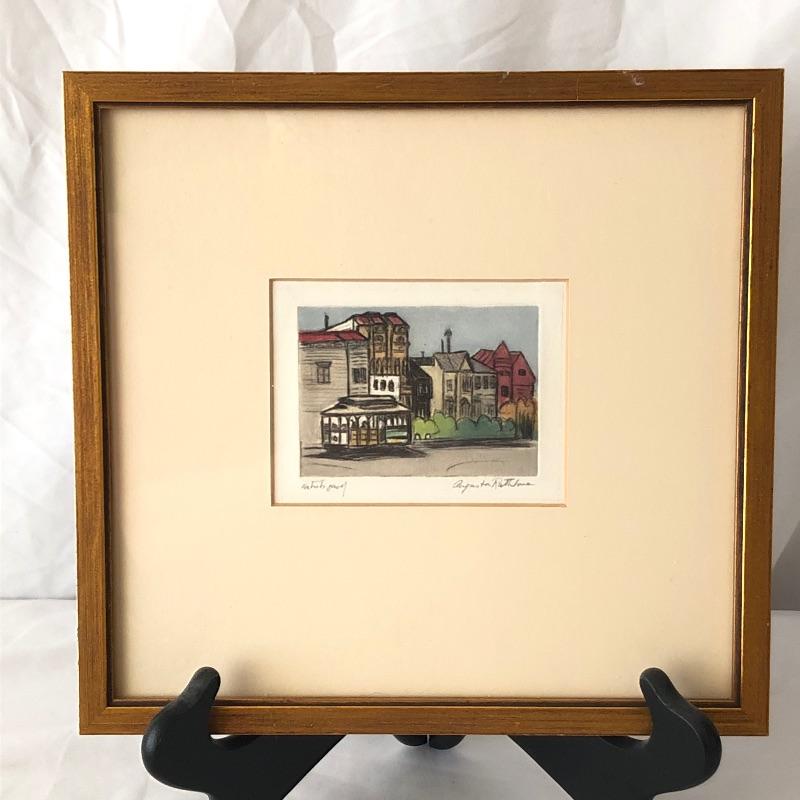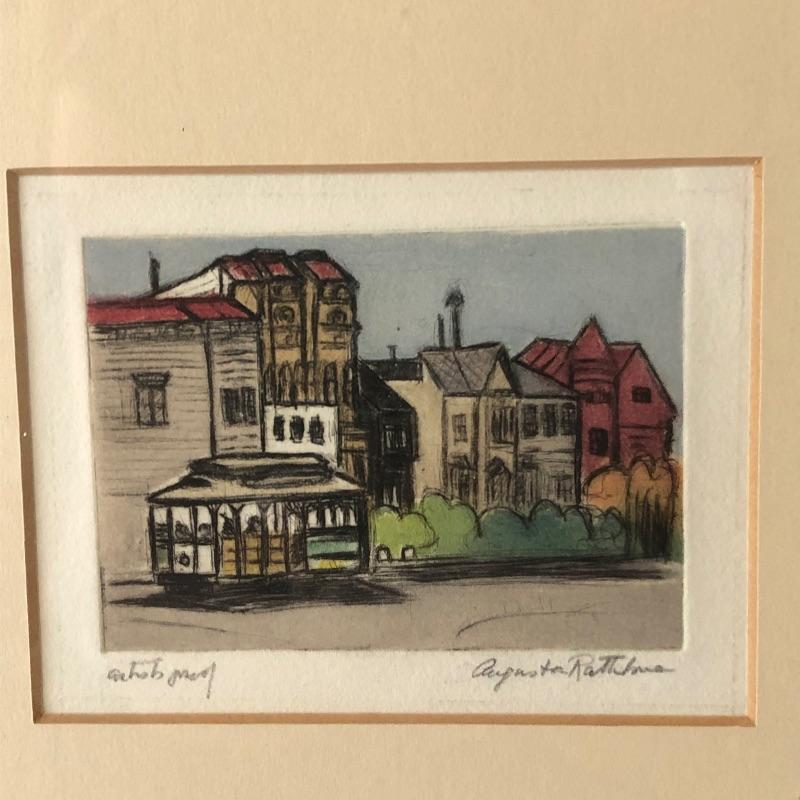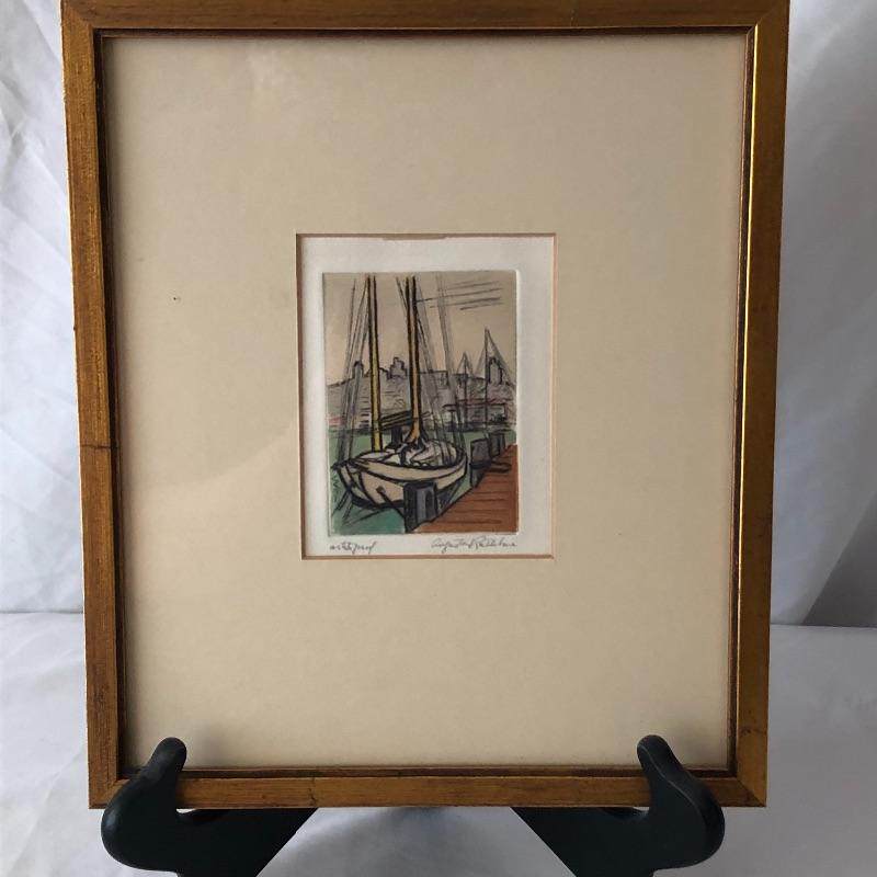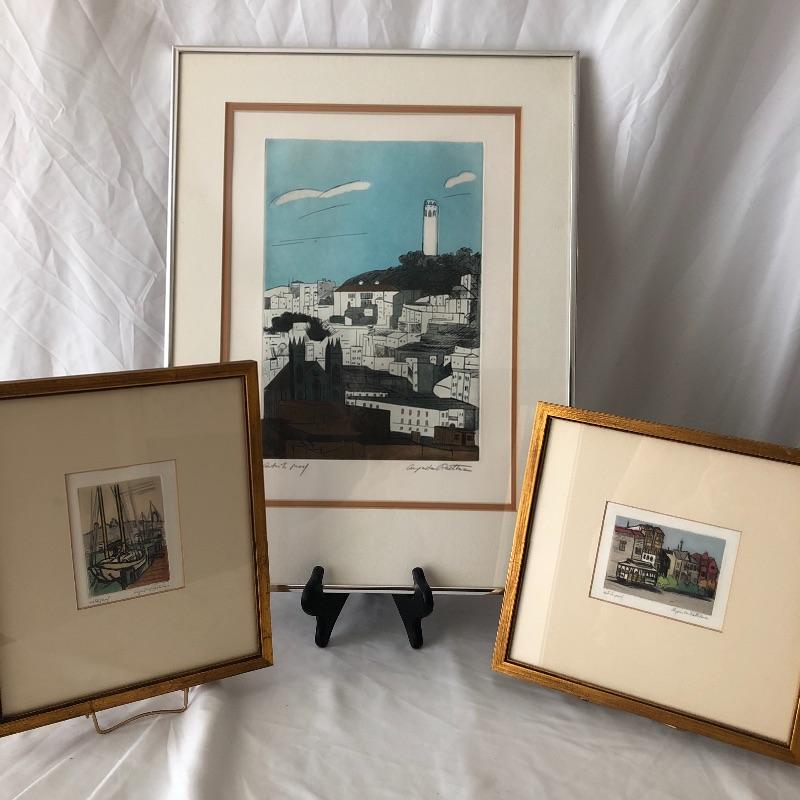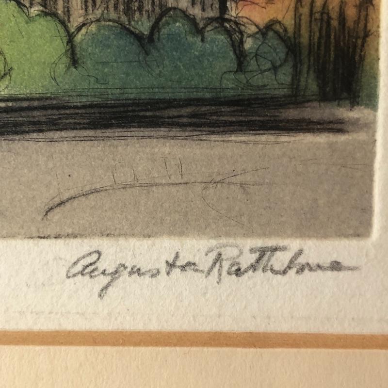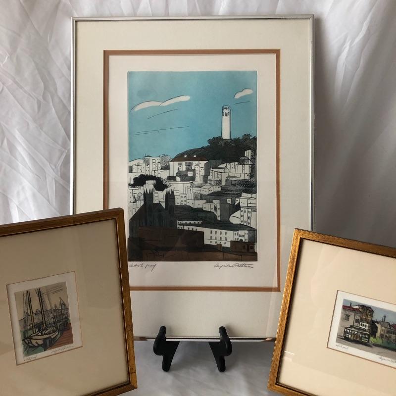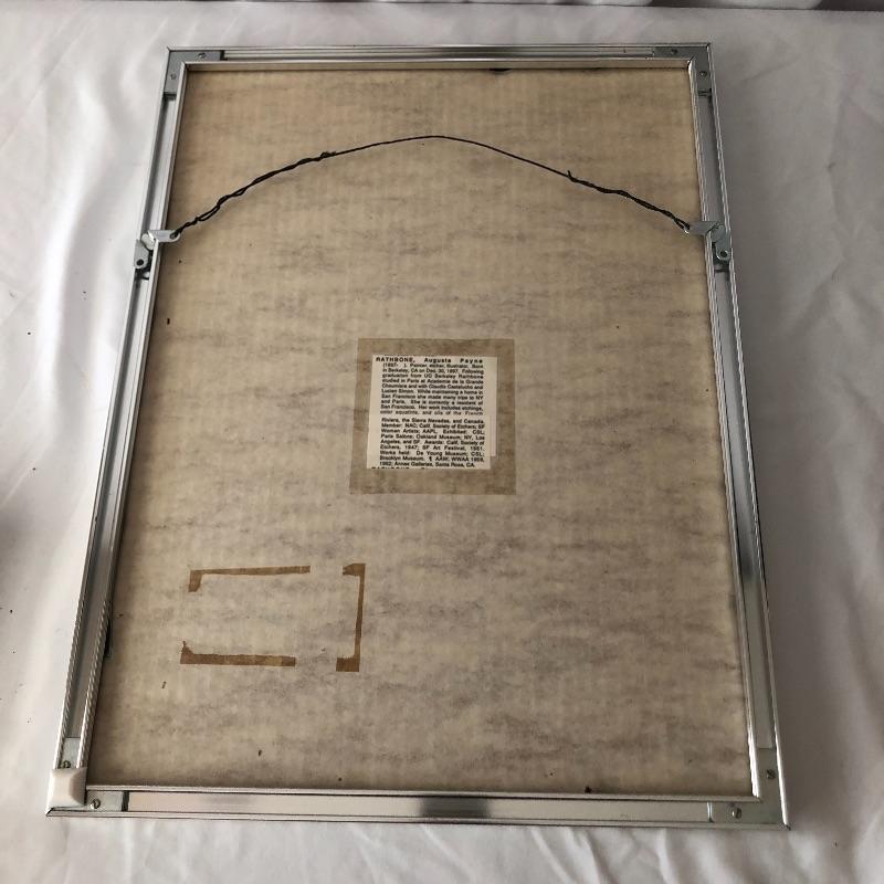 All three of these pieces have been signed with the signature Augusta Rathbone and Artists Proof. The two smaller etchings come in matching dark gold colored frames. The larger piece is matted and in a silver metal frame and measures 15” x 20”.
