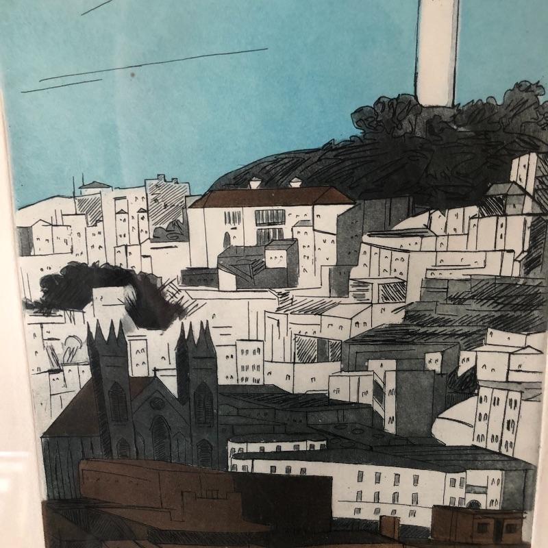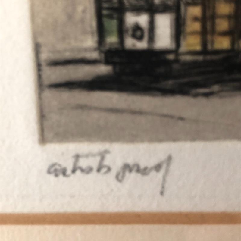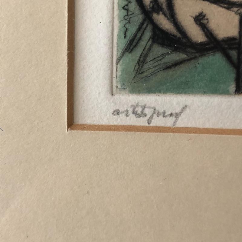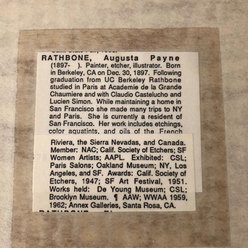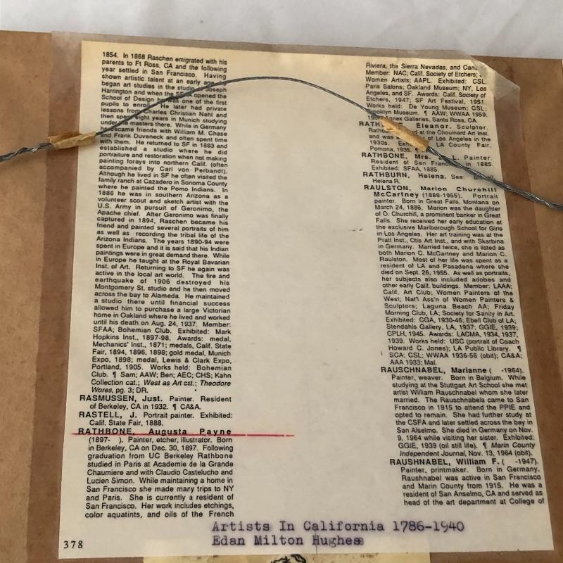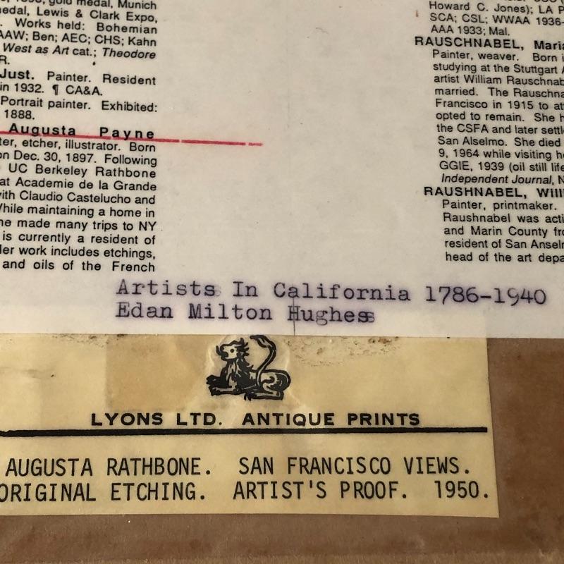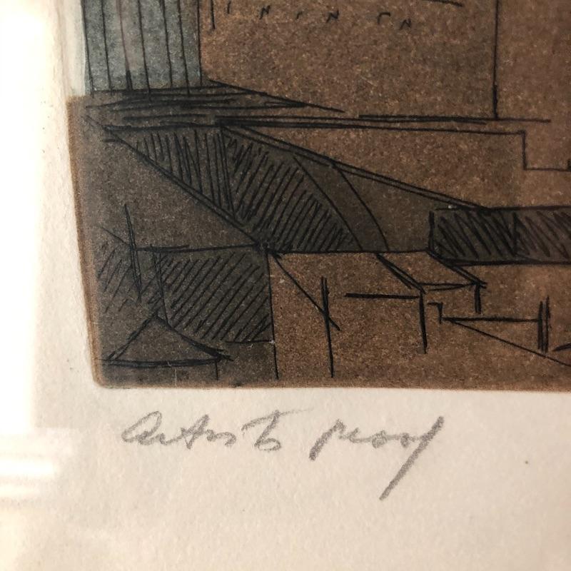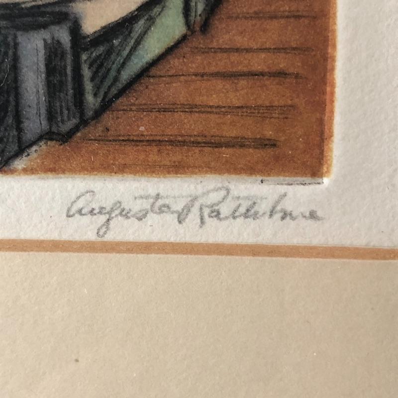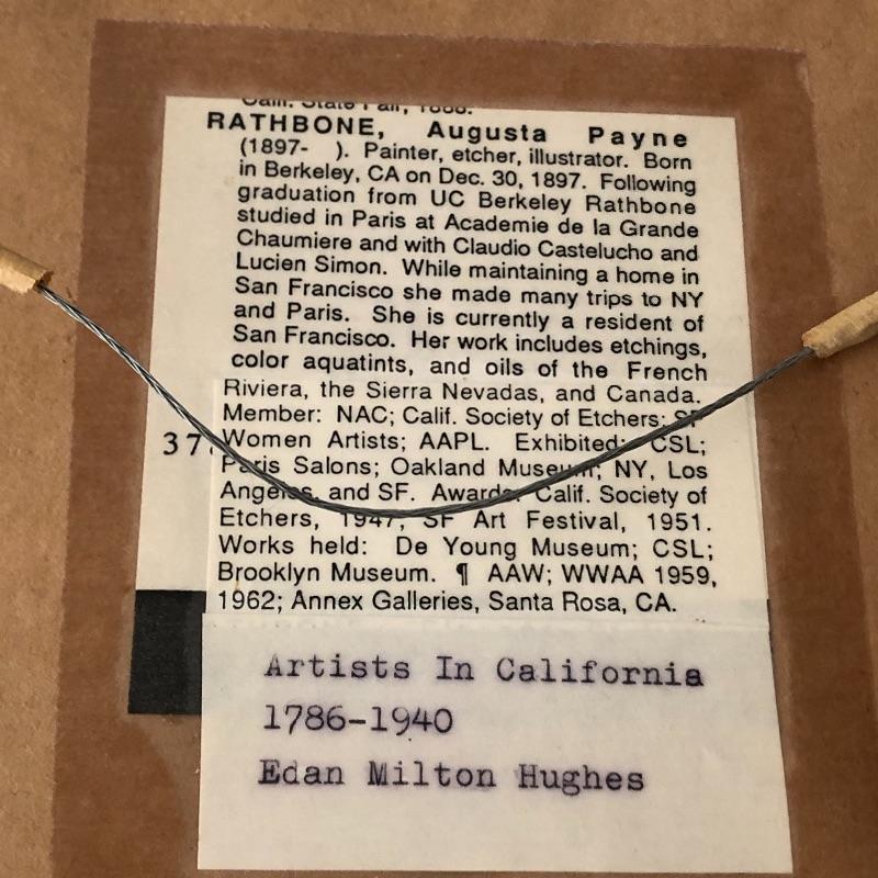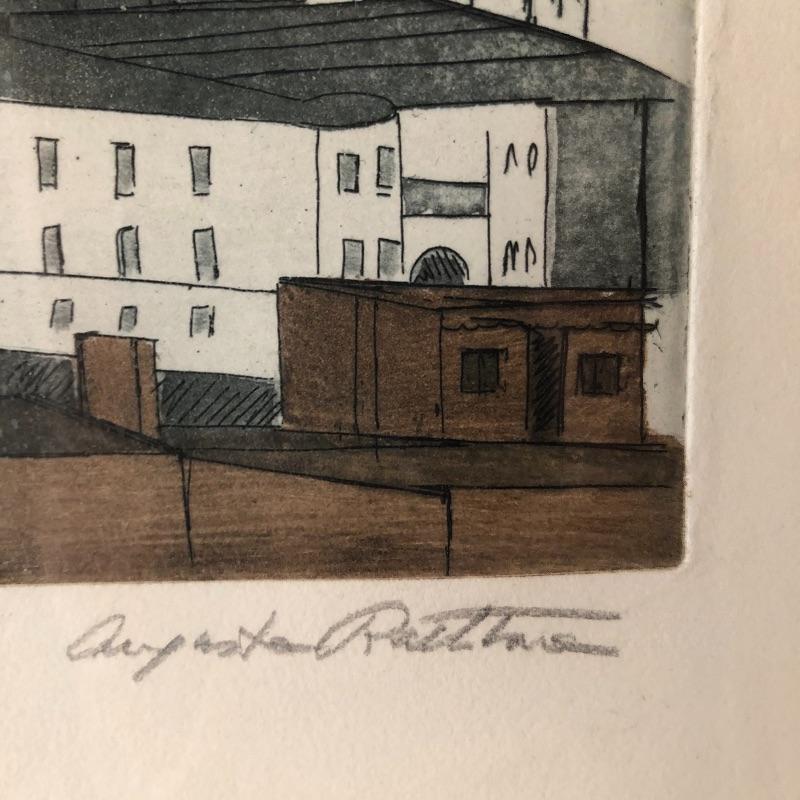 All three of these pieces have been signed with the signature Augusta Rathbone and Artists Proof. The two smaller etchings come in matching dark gold colored frames. The larger piece is matted and in a silver metal frame and measures 15” x 20”.