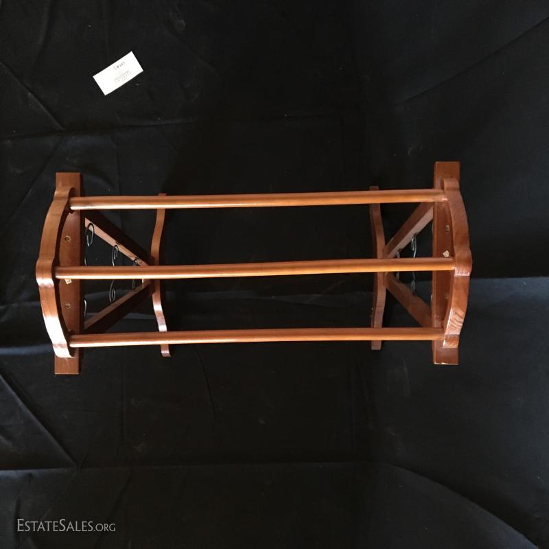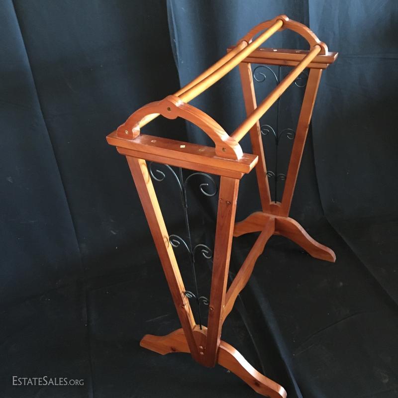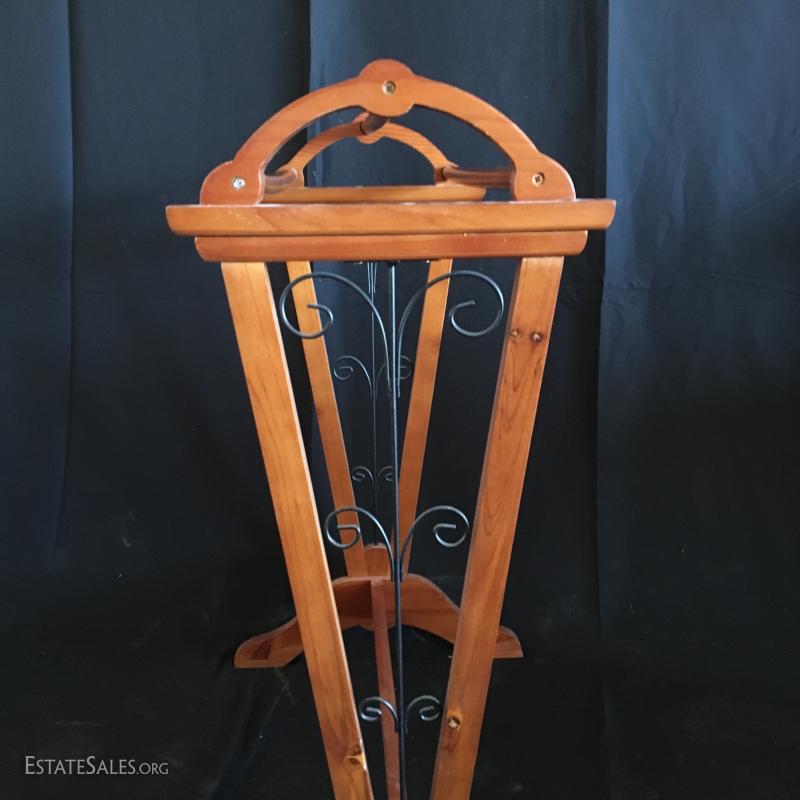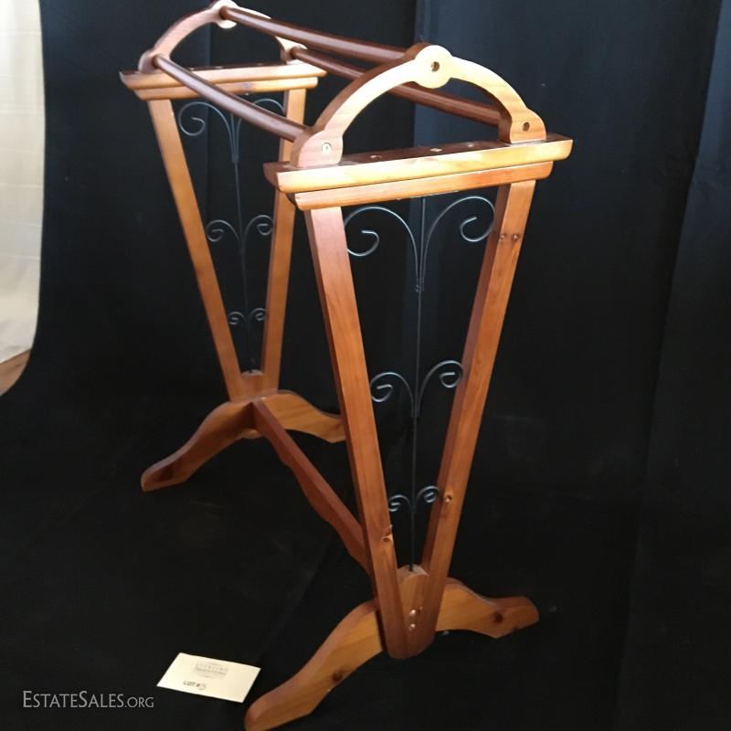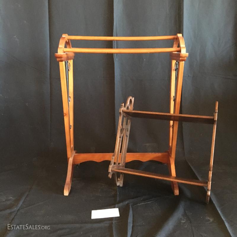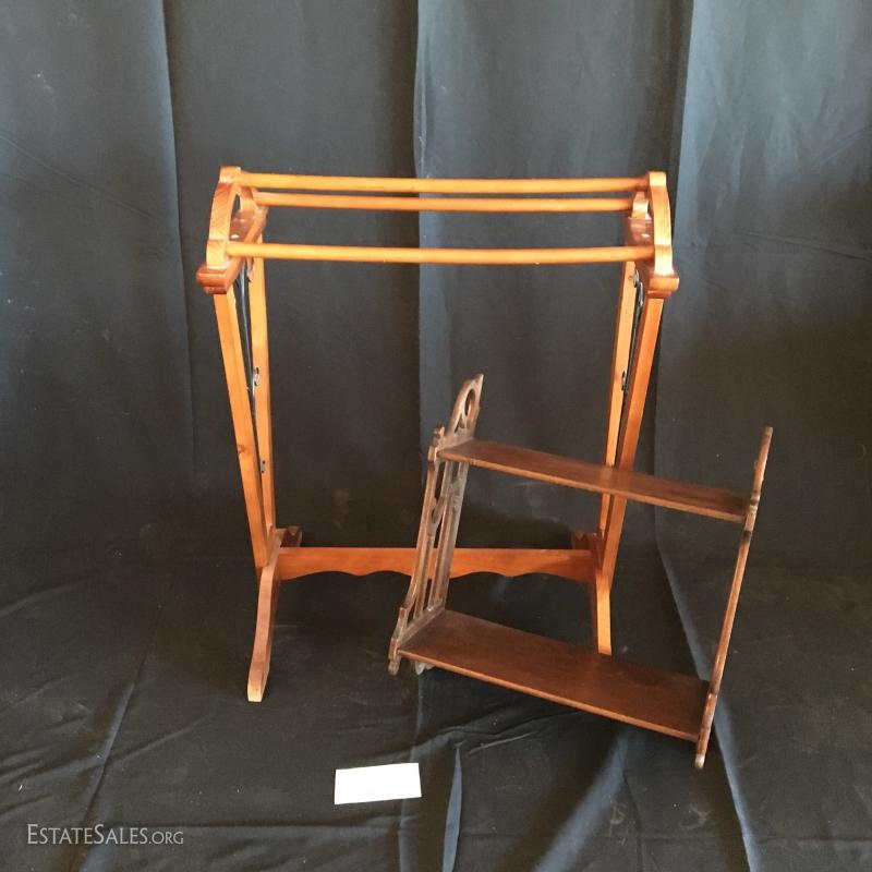 Towel/Newspaper Rack. Wood with metal detail. 27" Tall x 15" Wide, coloring looks lighter in photos. Weight limit 50lbs.