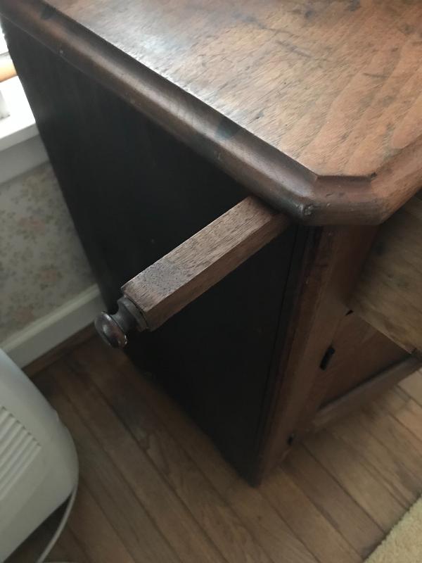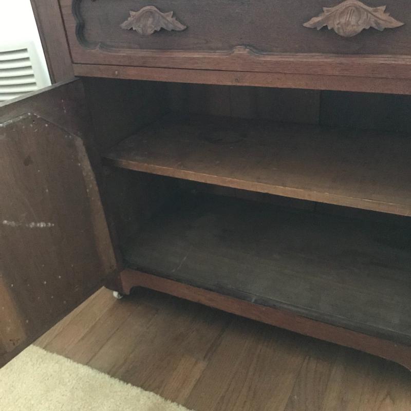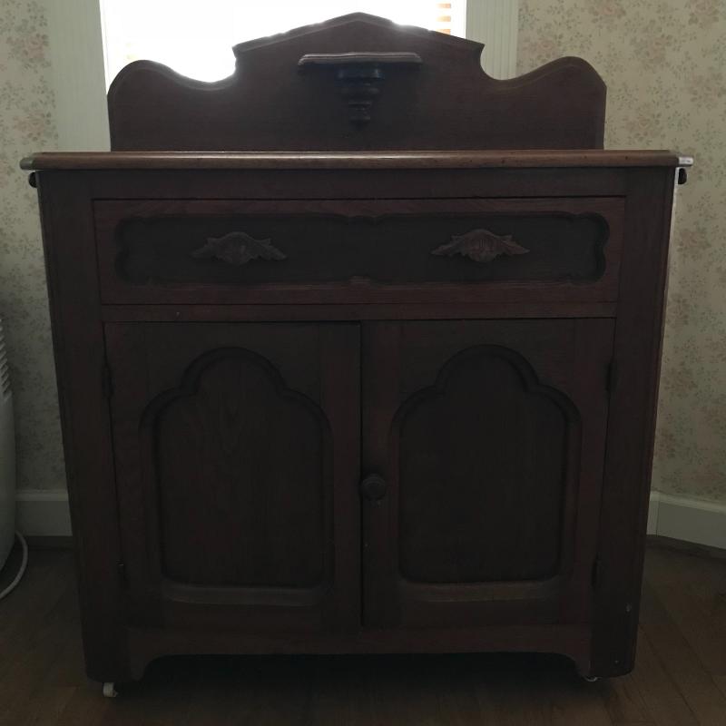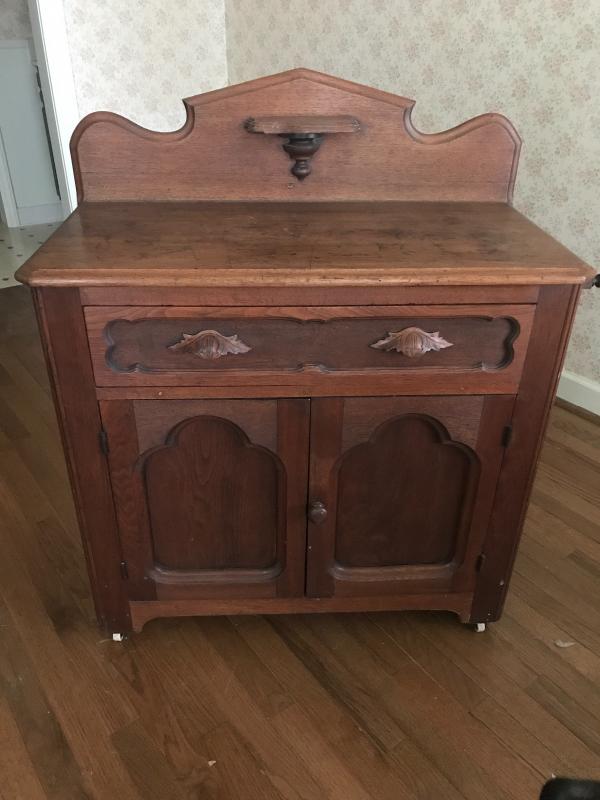 Beautiful antique wash basin with gorgeous wooden drawer pulls. This unique piece is in great shape and rolls on casters. Approx. 32”l x 16”w x 38”h. Lot is avaialable for local pick up only in Flat Rock, NC.