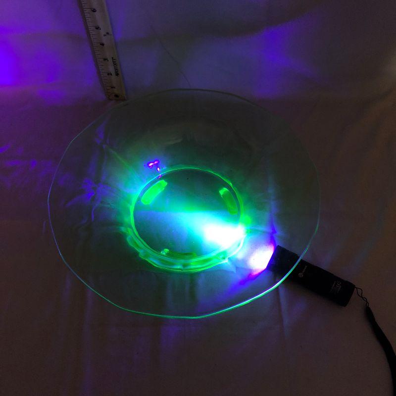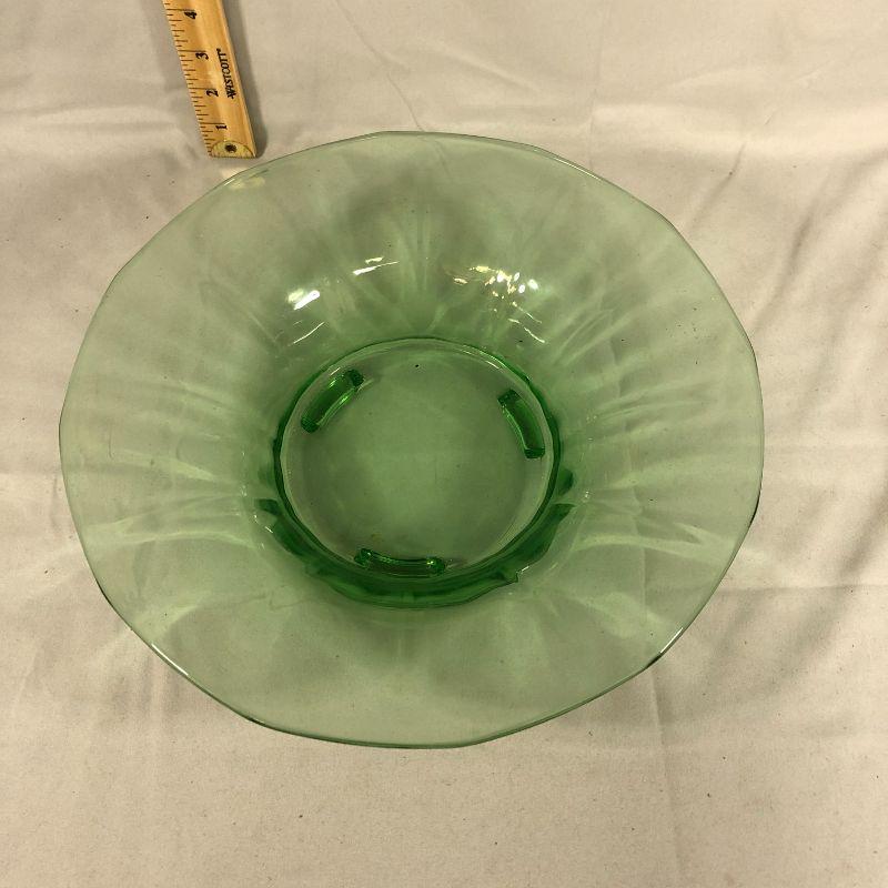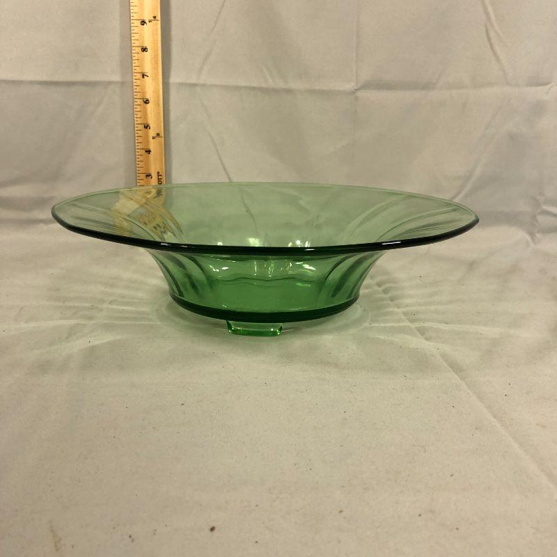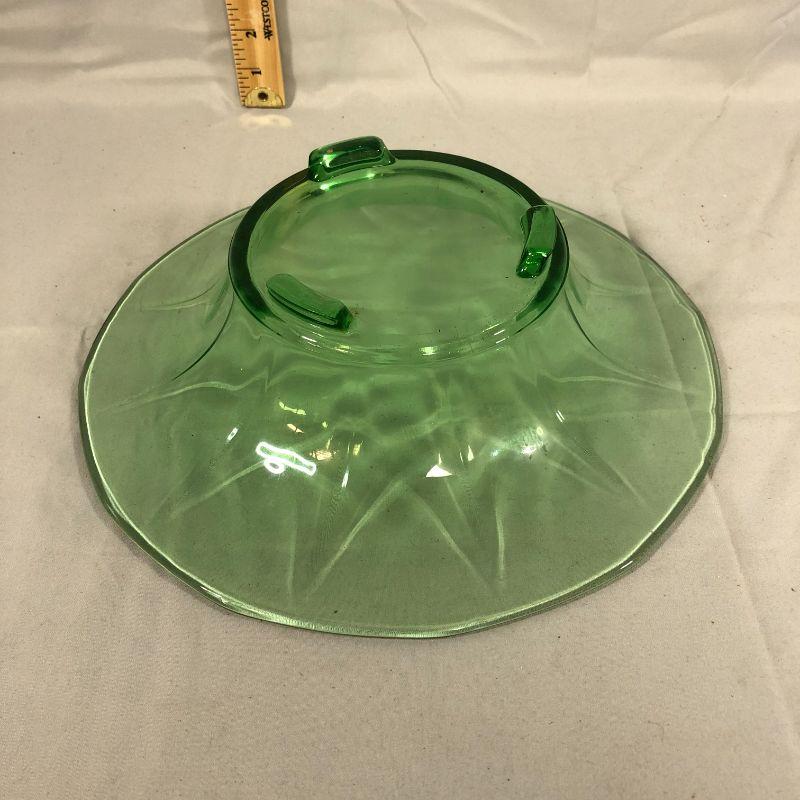 This bowl is about 12" in diameter and in great condition. It has three "toes" on the base and a lovely green glow when you use a blacklight.