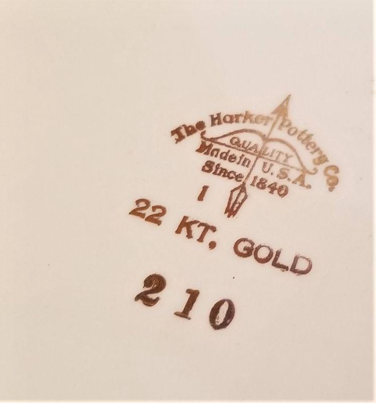 Vintage cake/dessert set from the 1940's - platter is 13.25" handle to handle, server is 9.5" long, and the 6 dessert plates are each 7.25" across. Good condition - 22kt gold rimmed.
