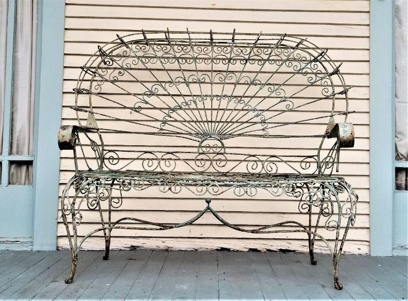 Wonderful vintage Garden Settee - love the chippy, shabby chic look. Please note the photos - one arm rest has some unattached and one spindle on the back has come unattached. Relatively easy fix that I will let you do. 54" wide at widest point, 21" deep, 45" tall.