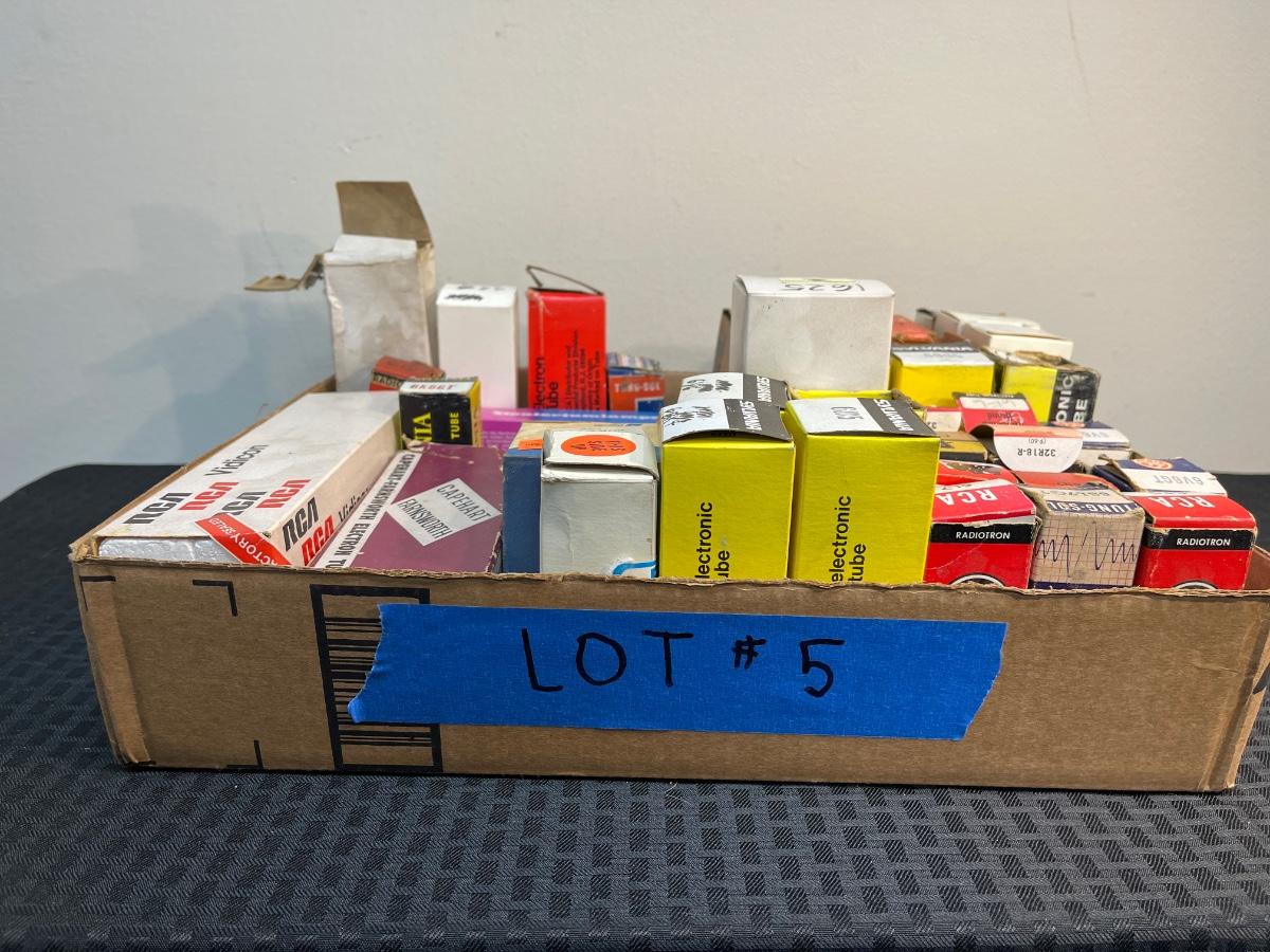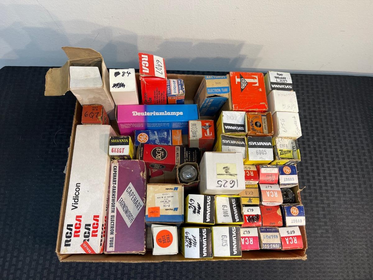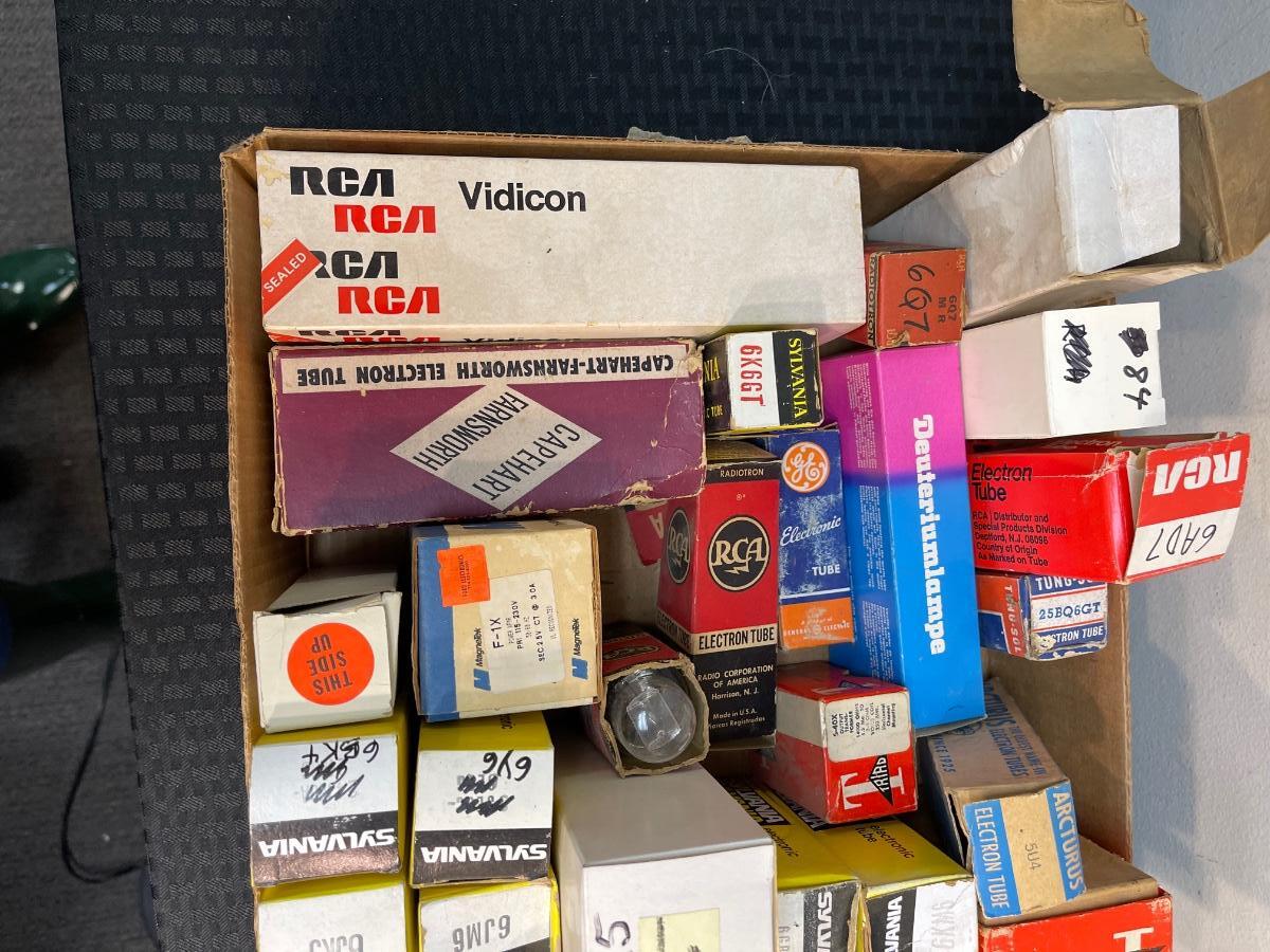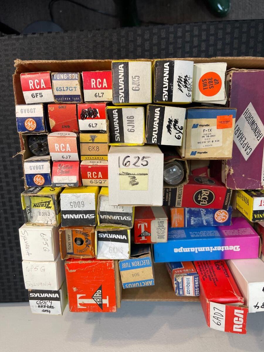 Lot #5 auction: box of tubes from our recent Fullerton estate. These are untested. Mfg varies