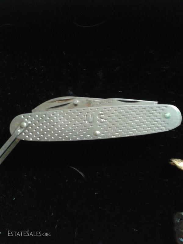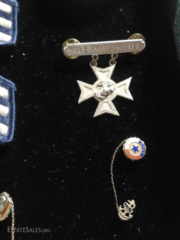 Lot 5 focuses specifically on vintage U.S. Military odds and ends with: a USDN Paperweight; USAF E-4 Senior Airman Patches; USAF Senior Security Badge (note that the top star is missing); USMC Rifle Sharpshooter medal and USMC WWII Cap Badge Emblem; 1991 US Camillus Armed Forces Utility Pocket Knife; 2 strands of a charm bracelet with 'US Navy', 'Denham Fall '57' charms. With the exception of the security badge, all items are in excellent condition.