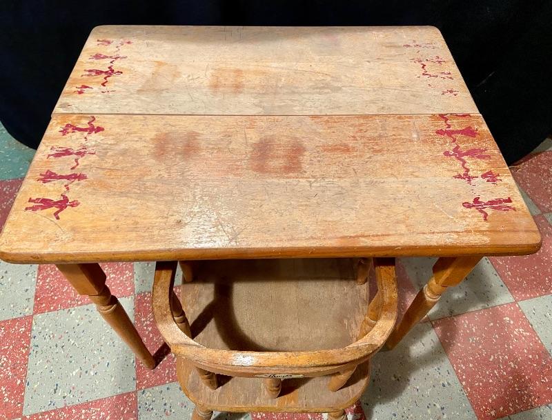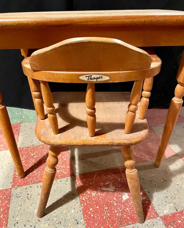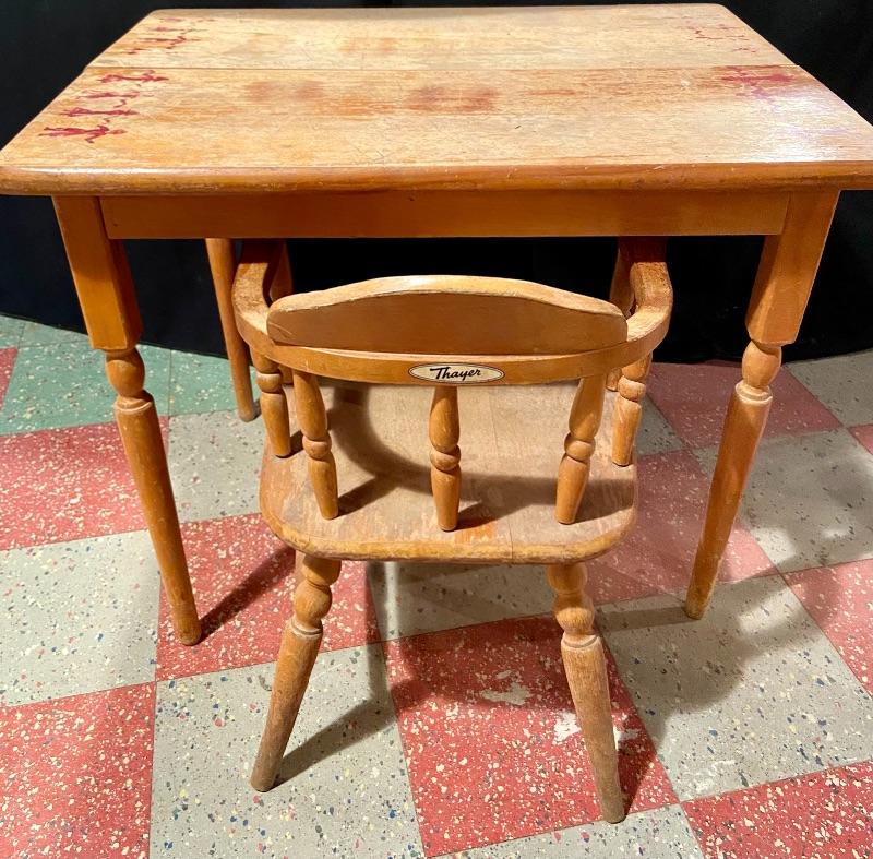 Oak student desk 26Lx20Wx21.5H, and small Thayer wooden oak chair 15Lx12Wx20T. MHW Please see all pictures for condition. Thank you for looking and have fun bidding