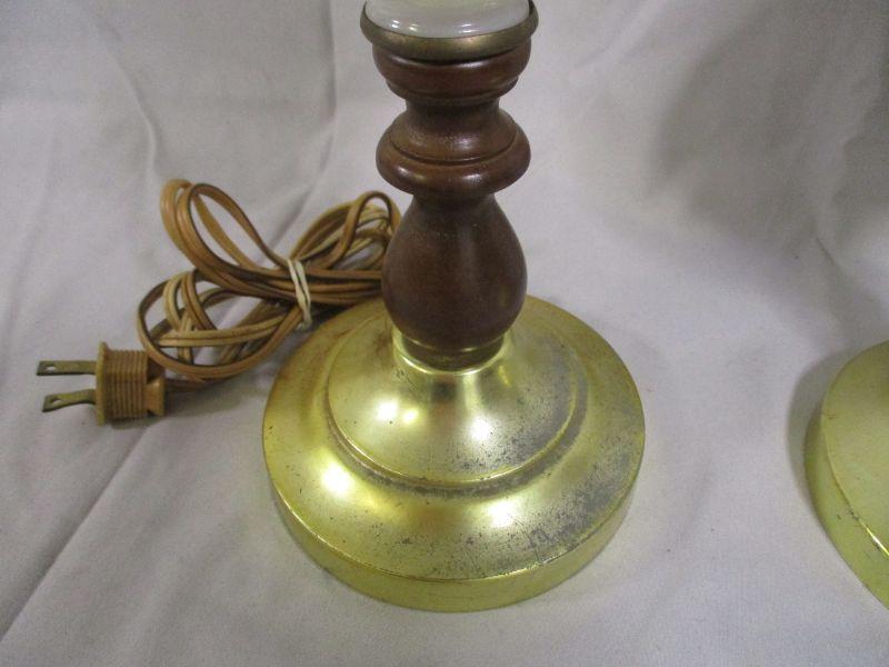 Both of these work and are in overall good condition. The lamps are metal base, wood pillar, and milk glass bowl, with another piece of wood. The wood pillar on one has a worn finish which could easily be hidden with some wood oil. They are about 12.5" tall.