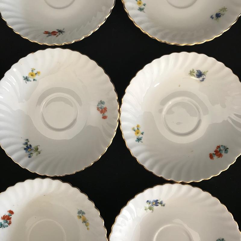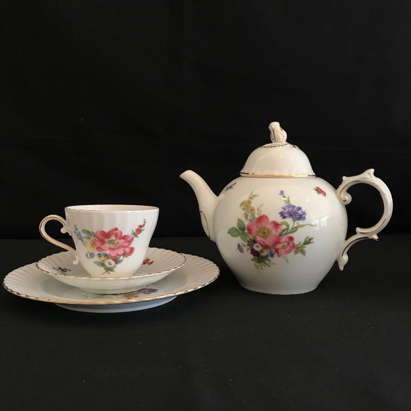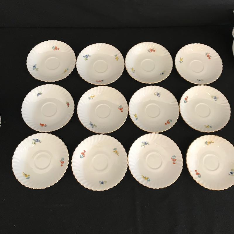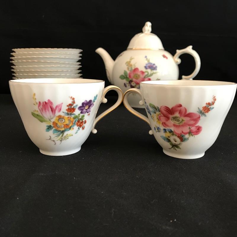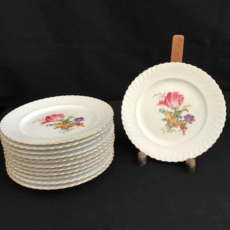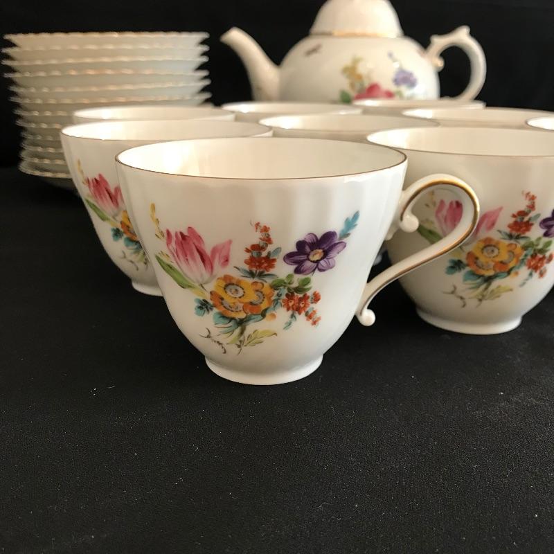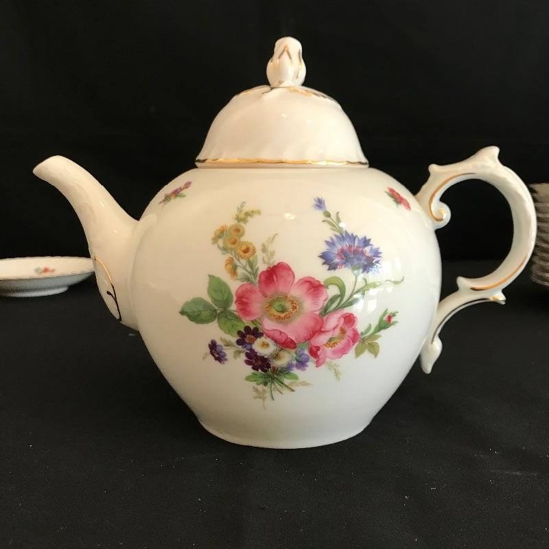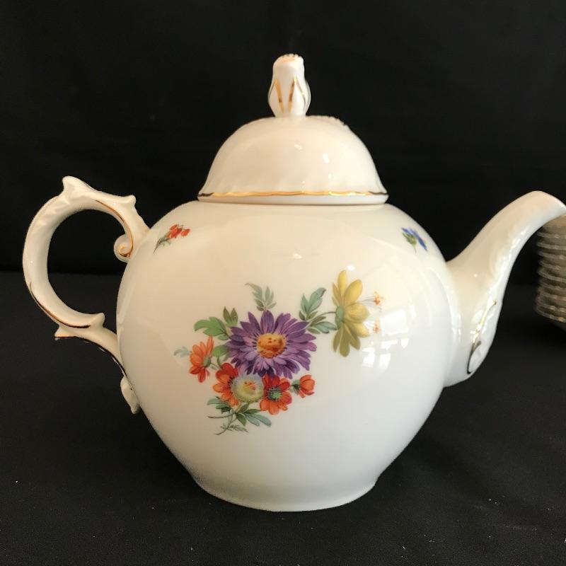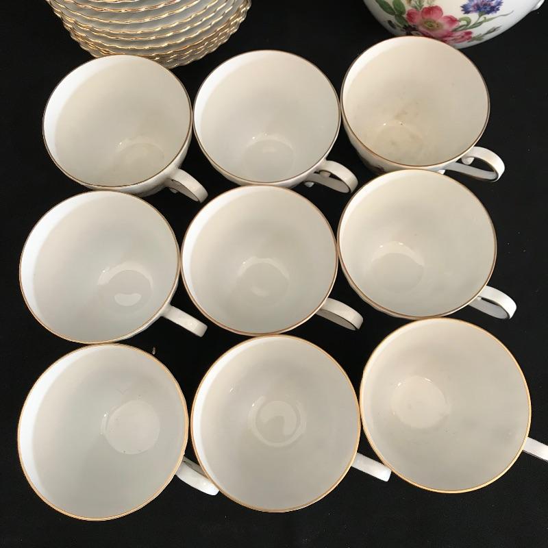 Have a tea party with nine of your closest friends and have some extra plates leftover! Lovely hand painted collection marked Residenz, Kaiser, W. Germany and more. Nine teacups have different designs on each side, see photos. The Furstenberg teapot has a rose adorned lid that appears currently stuck in place. Lot also contains twelve each saucers and 8” sandwich plates. All gold rim and accents appear in very good shape. See photos. Shipping available.