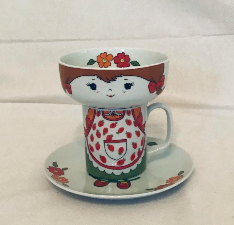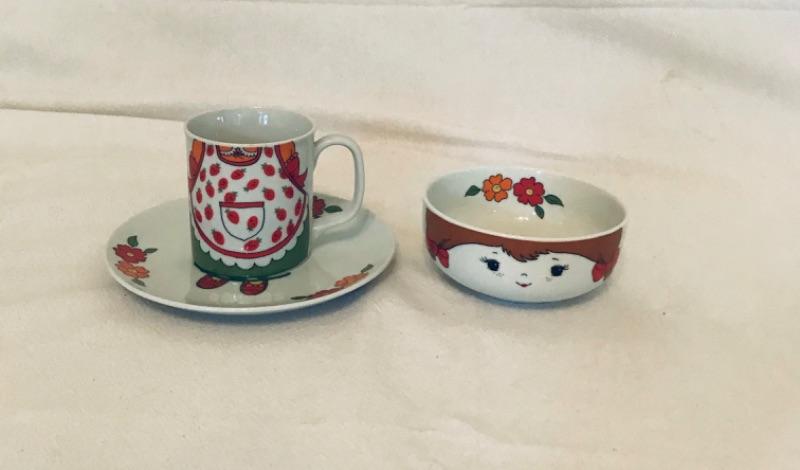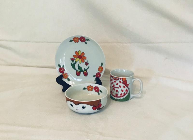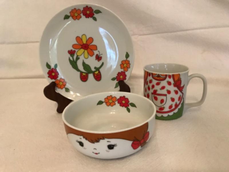 Child’s plate, bowl, and mug. Makes the best little whimsical gal. Sadly there is a small chip.