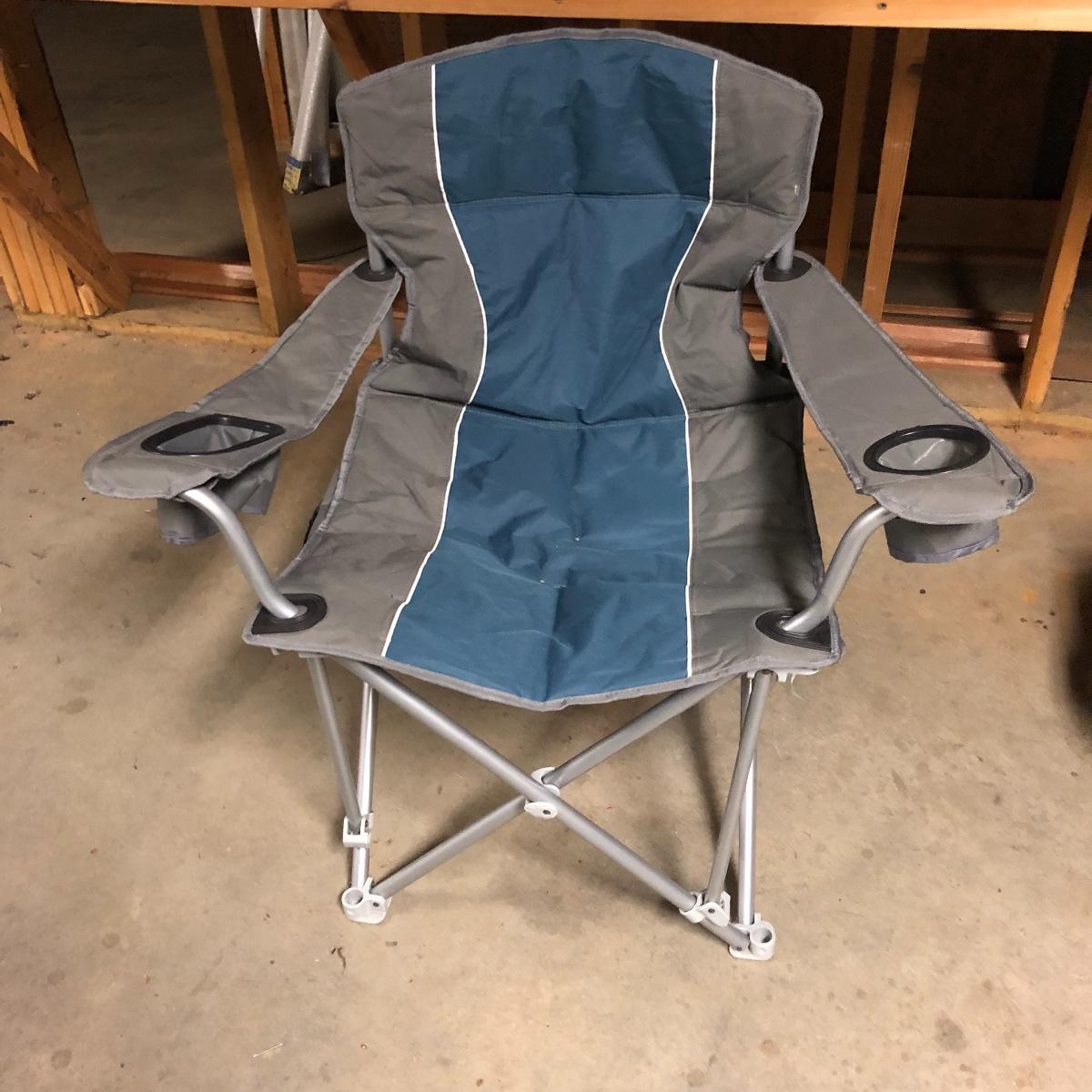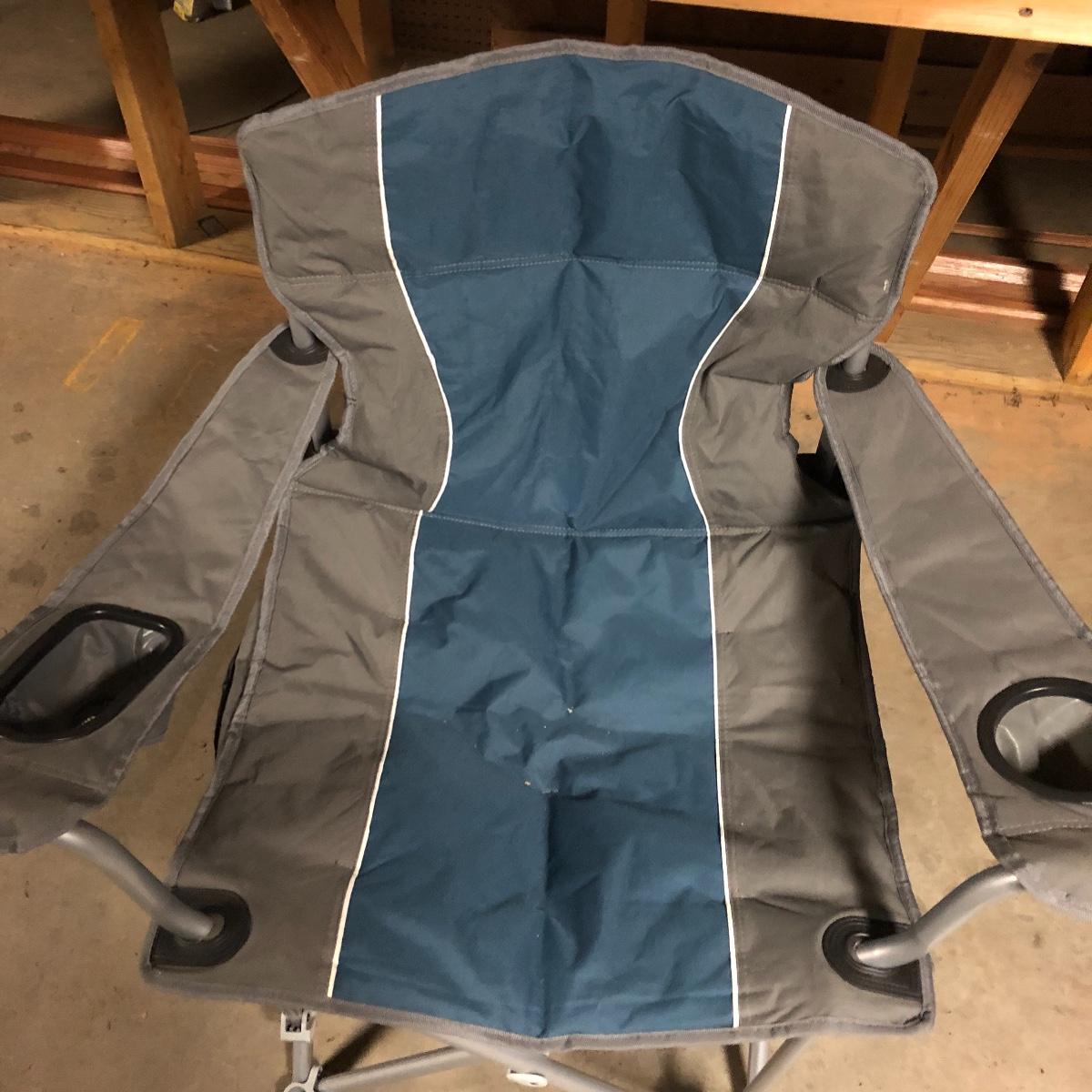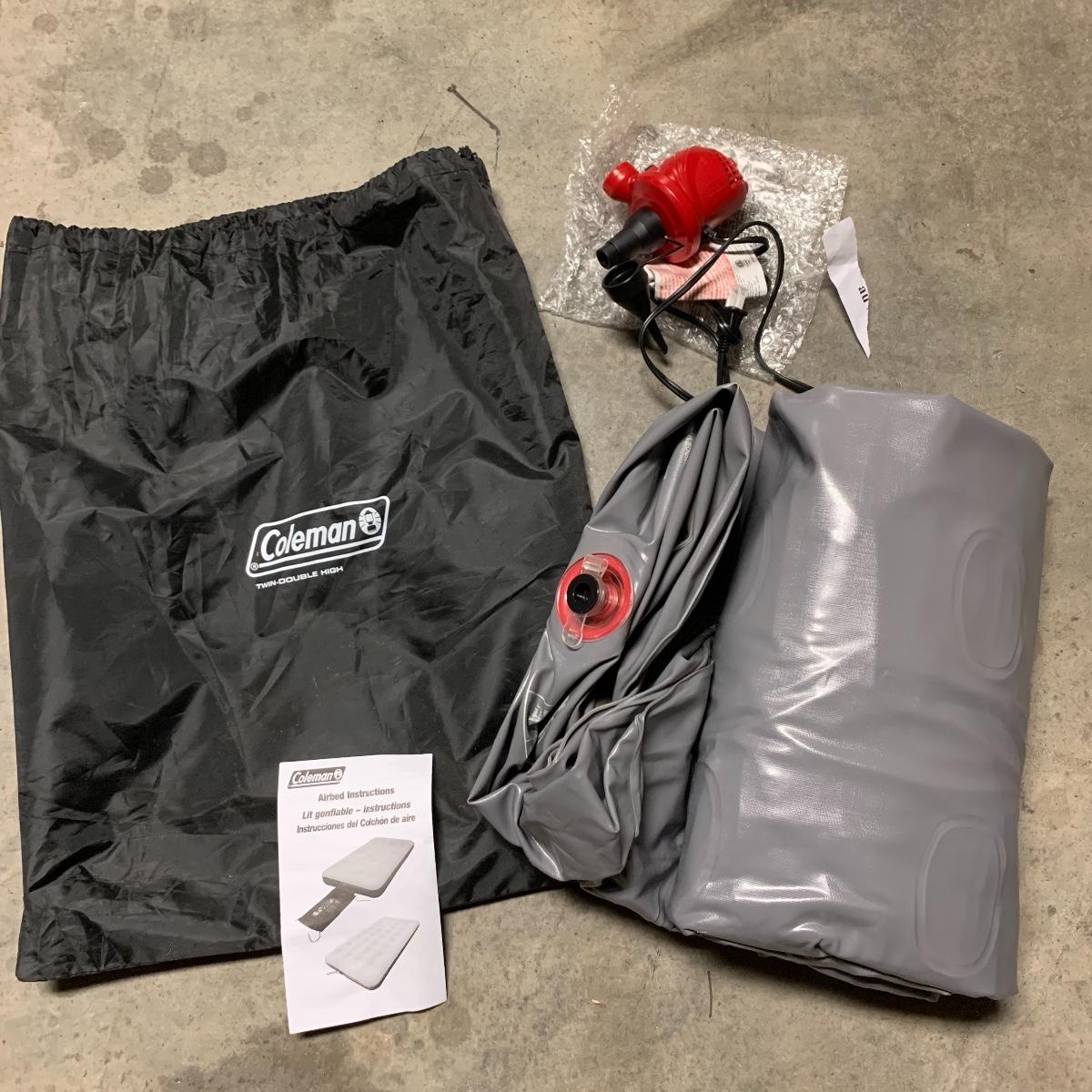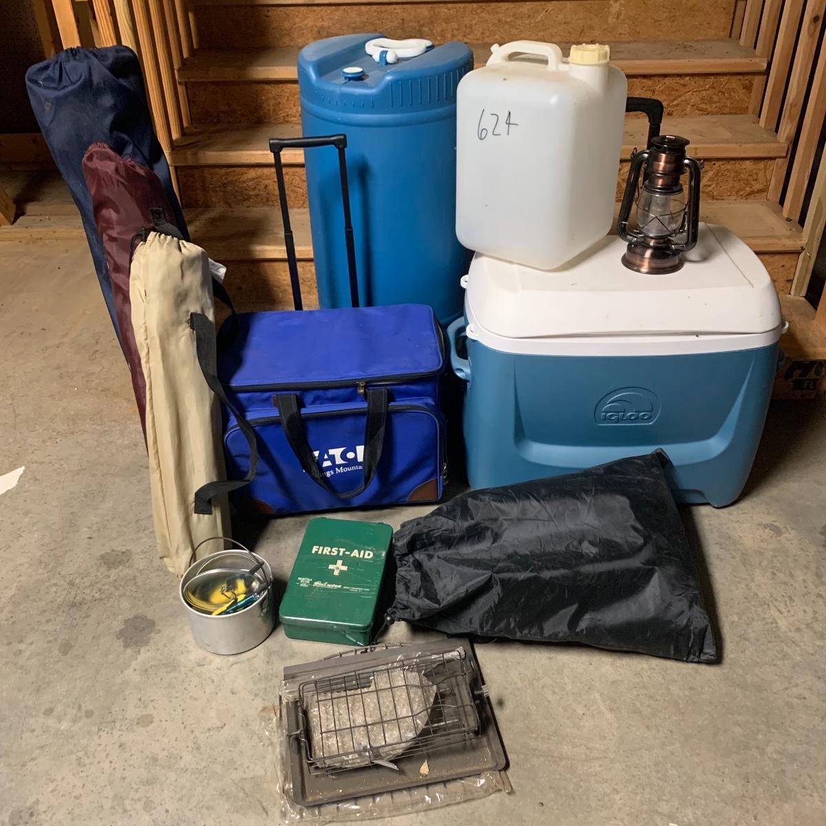 This lot includes cooking / grilling supplies, a vintage metal first aid kit box (no supplies), a lantern, two water jugs, a Coleman air bed, coolers, camping chairs, and more. One of the chairs is by Ozark Trail. All chairs appear to be in good condition. One of the coolers is by Igloo and has wheels. It measures about 16in x 25in x 21in. The other cooler also has wheels. The larger water jug (blue) measures about 14in x 26in. The Coleman air bed is a twin double high bed and comes with instructions and an electric air pump. Local pick up only.