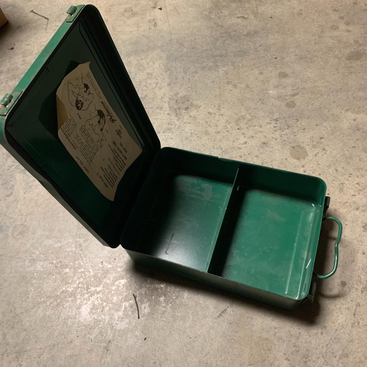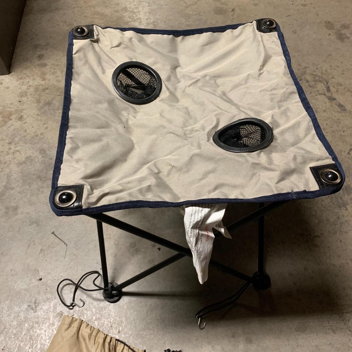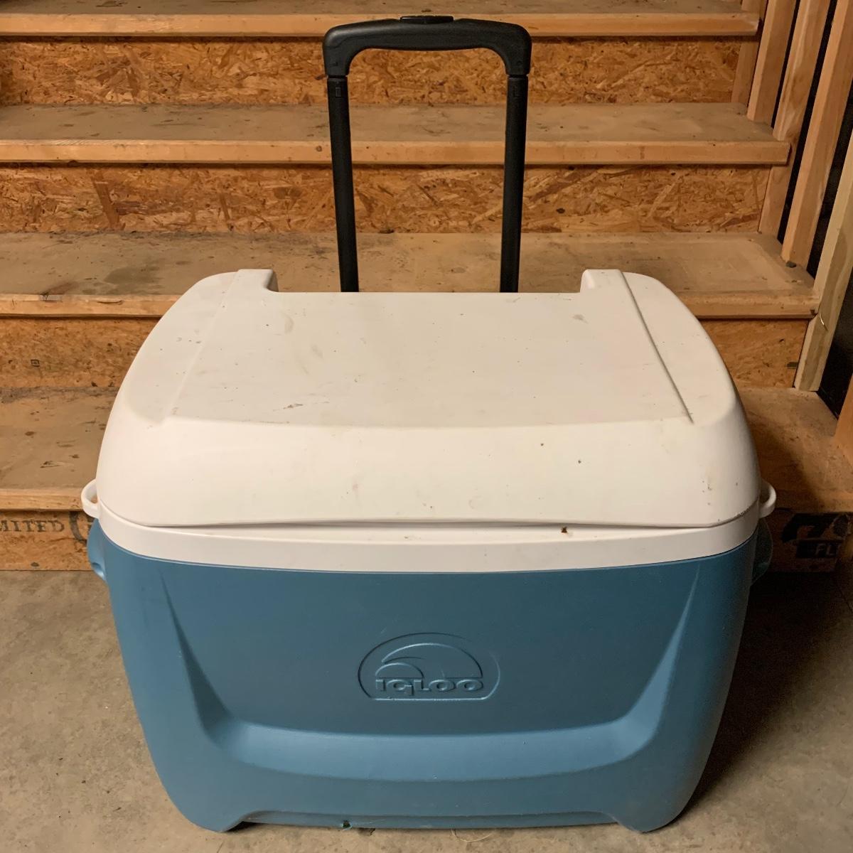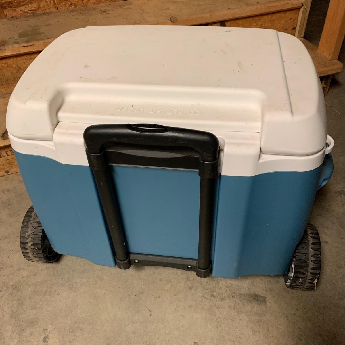 This lot includes cooking / grilling supplies, a vintage metal first aid kit box (no supplies), a lantern, two water jugs, a Coleman air bed, coolers, camping chairs, and more. One of the chairs is by Ozark Trail. All chairs appear to be in good condition. One of the coolers is by Igloo and has wheels. It measures about 16in x 25in x 21in. The other cooler also has wheels. The larger water jug (blue) measures about 14in x 26in. The Coleman air bed is a twin double high bed and comes with instructions and an electric air pump. Local pick up only.