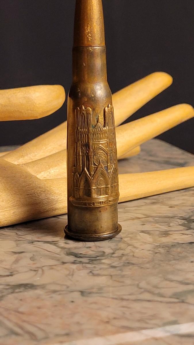 This interesting Military Trench Art made from an assault rifle cartridge features the famous Cathedral in REIMS France. This town is the famous site of the German surrender in WW2 and this dagger/letter opener Memento shows an additional REIMS inscription on the actual blade portion.