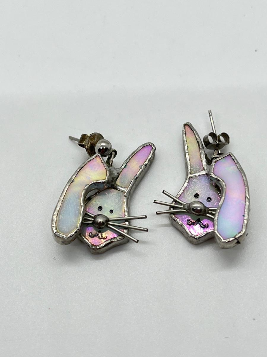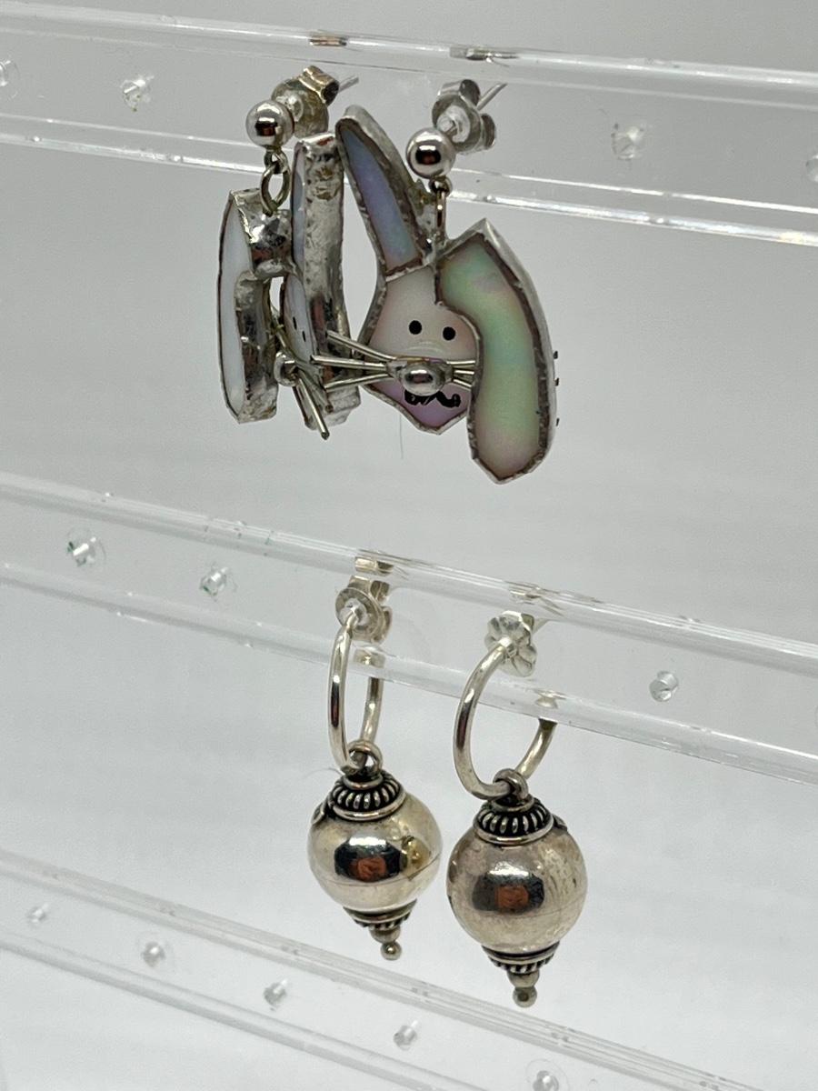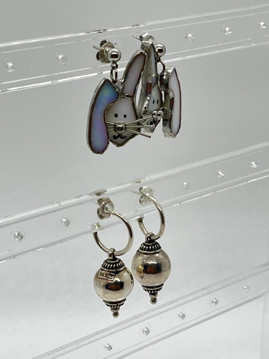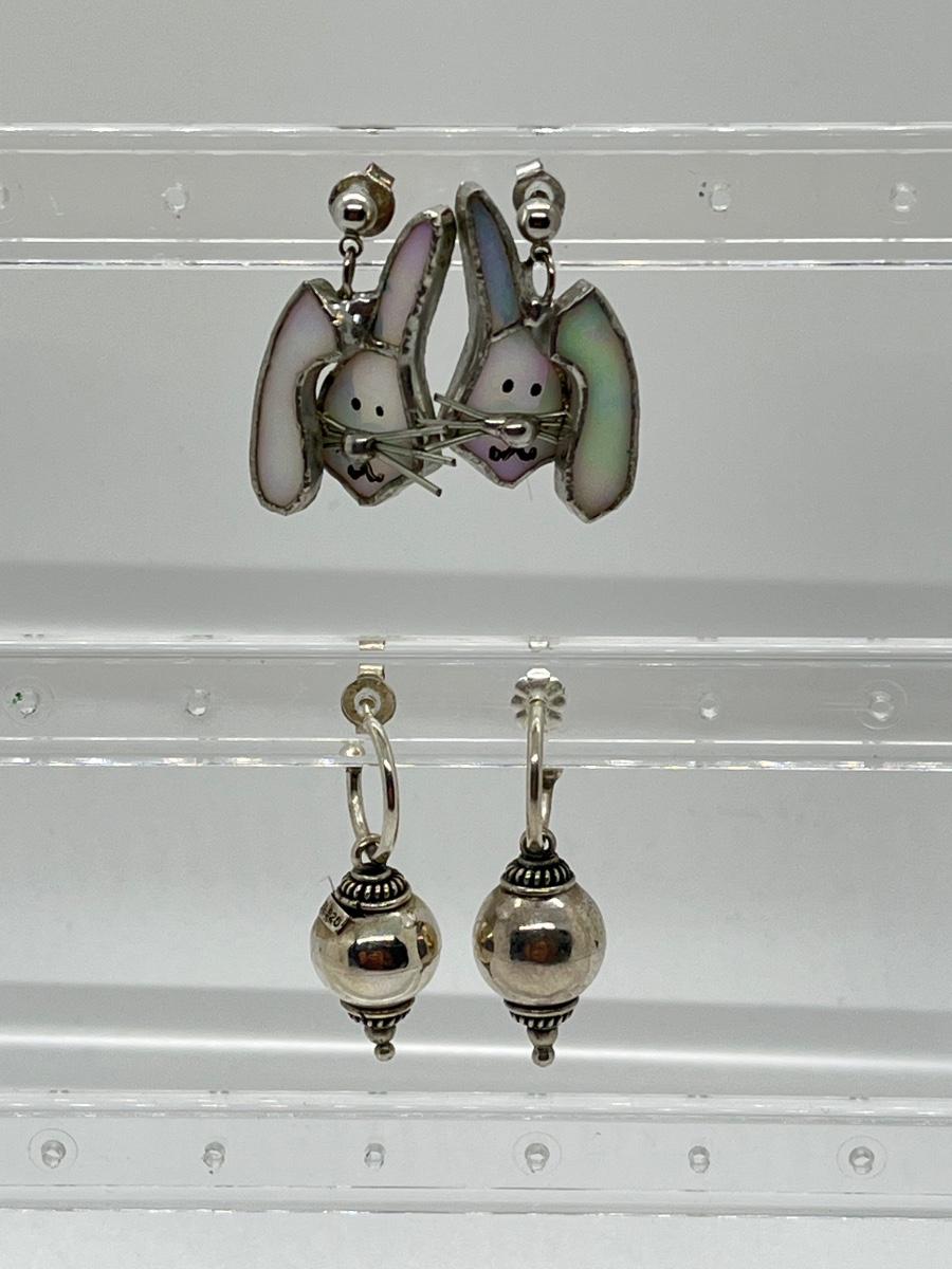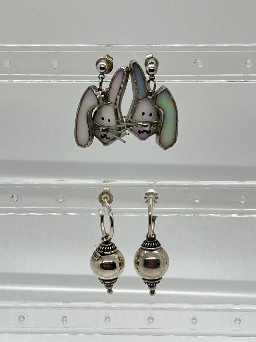 LOT 50: Sterling Silver Pierced Earrings - Stained Glass Bunny Rabbits & Hoops with Removable Ball Danglers