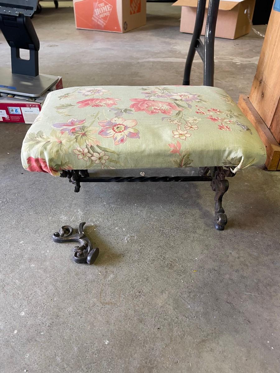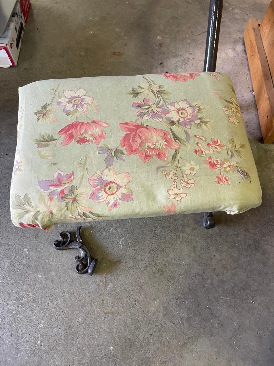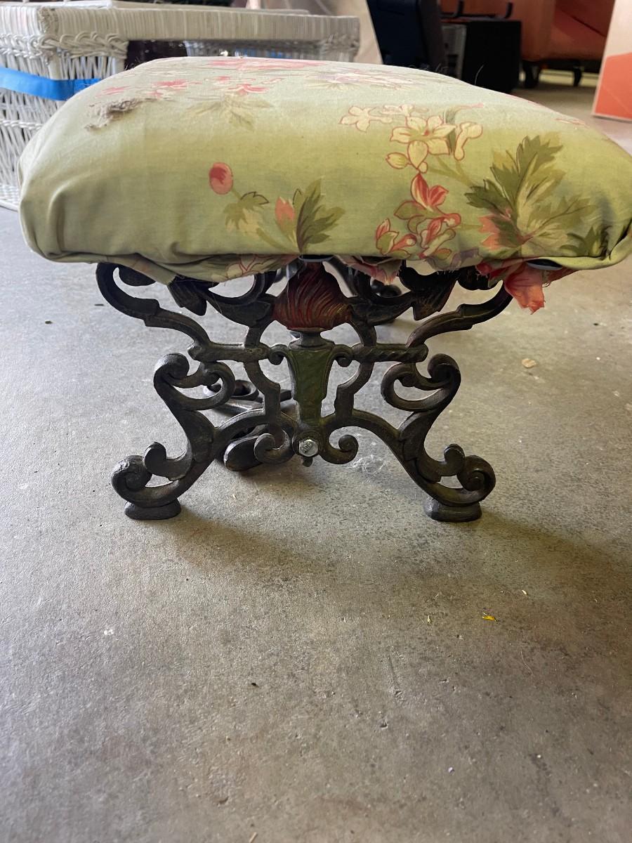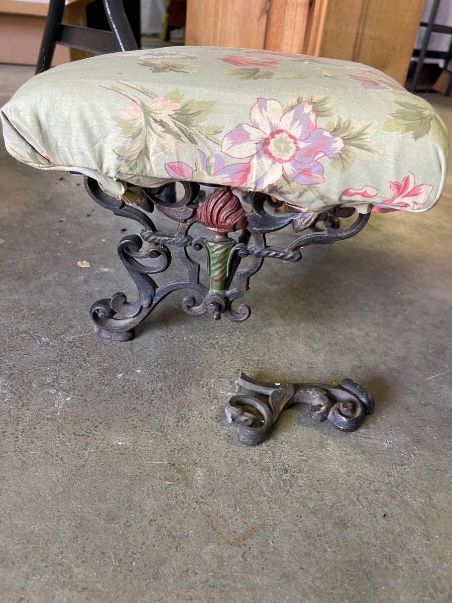 - antique stool, cast iron base, pretty fabric cover, one leg needs repair