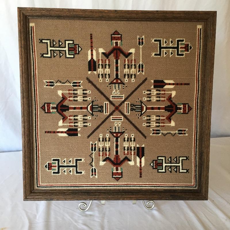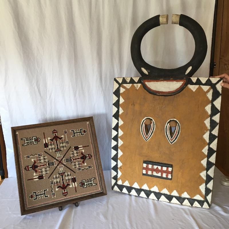 This cool pair includes a framed cross stitch piece of art and what appears to be a carved wooden piece of art. A conversation starter if ever we saw one, this large horned piece is all ready to hang on your wall.