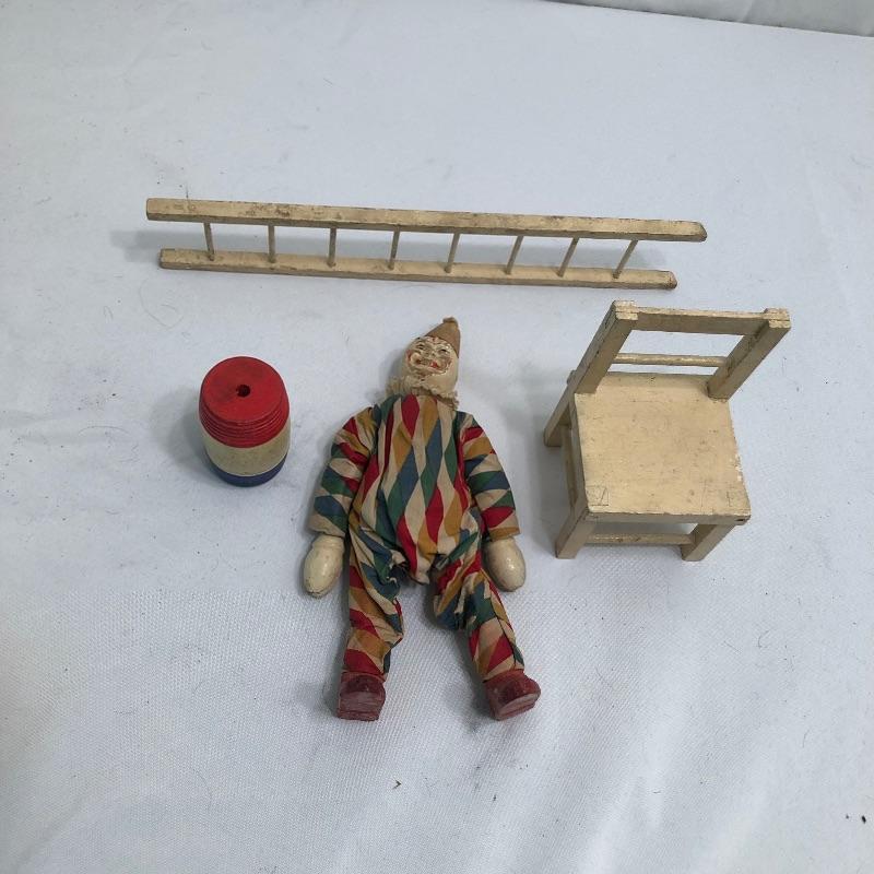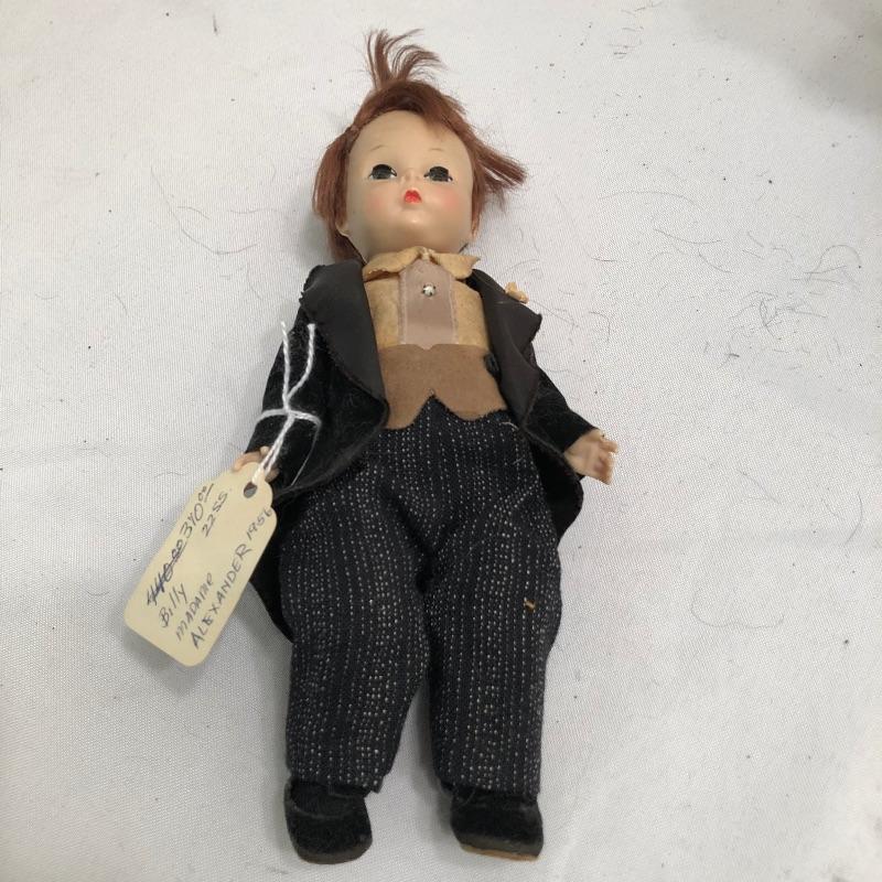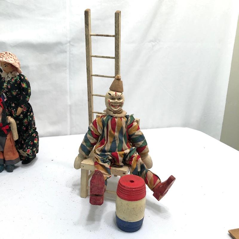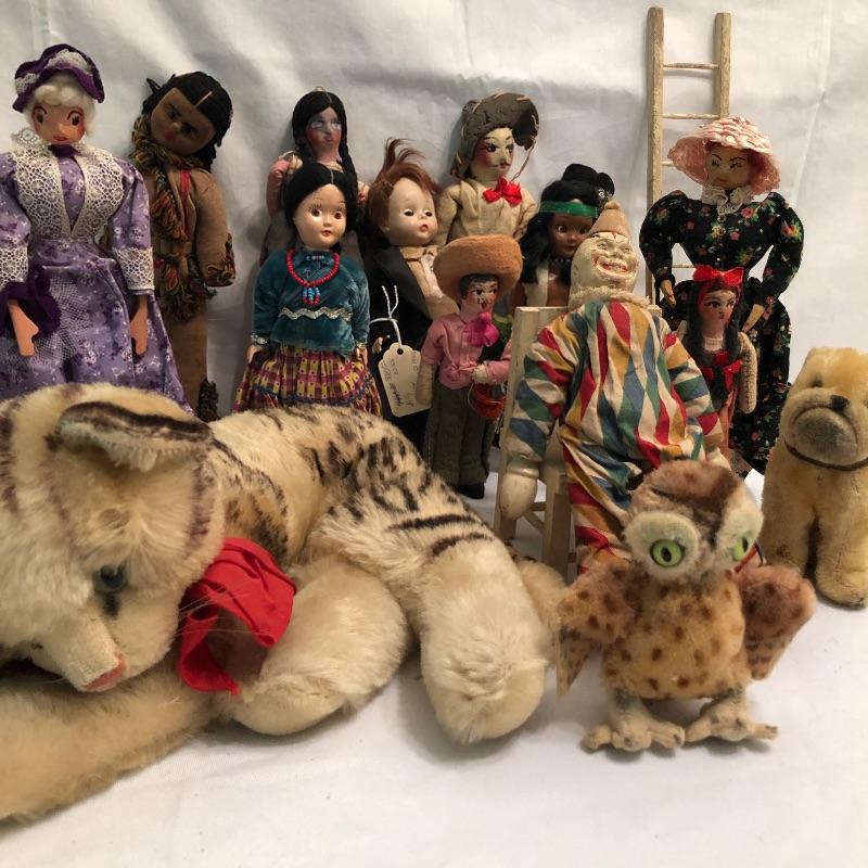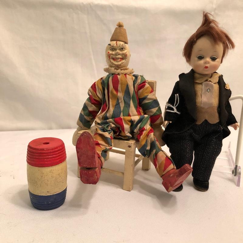 We have some rare antique finds for you in this lot! A total of ten dolls along with a clown, his barrel, chair and ladder and three soft animals. All the items appear to be quite old and the doll dressed in a black suit is a Madame Alexander doll from 1956 called "Billy" and carries a pretty hefty original price tag, see images.