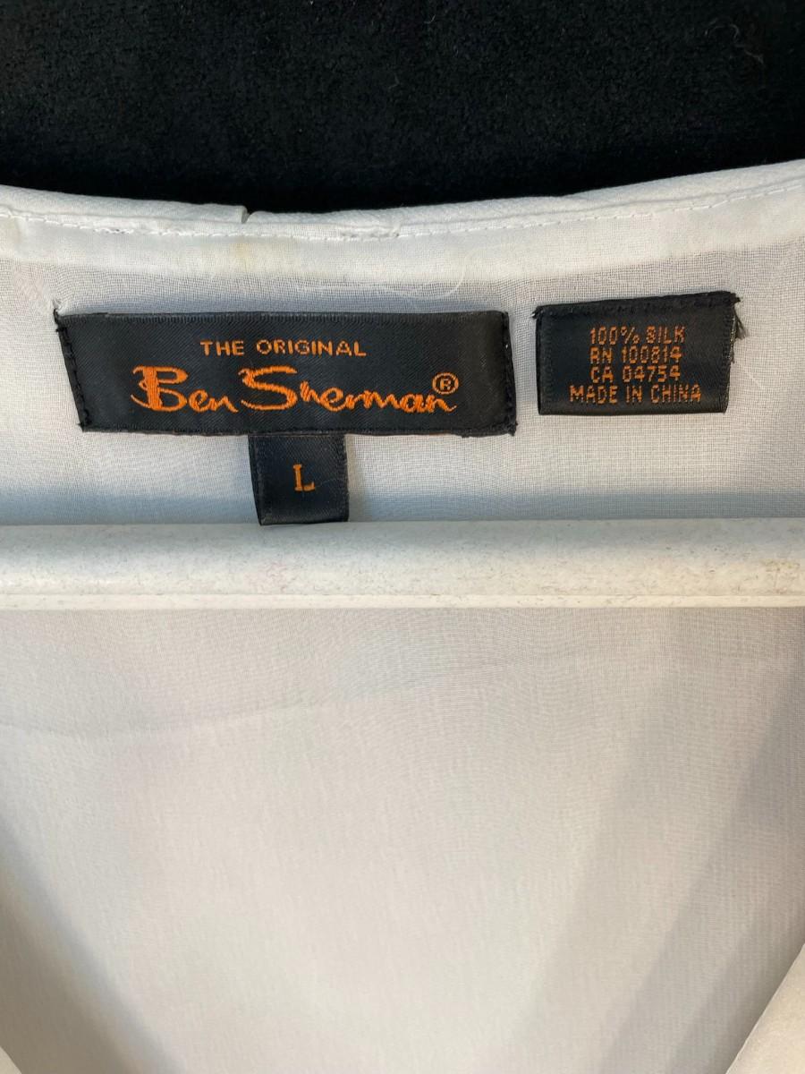 Ben Sherman 100% silk, size large, off-white dress with a black sash.