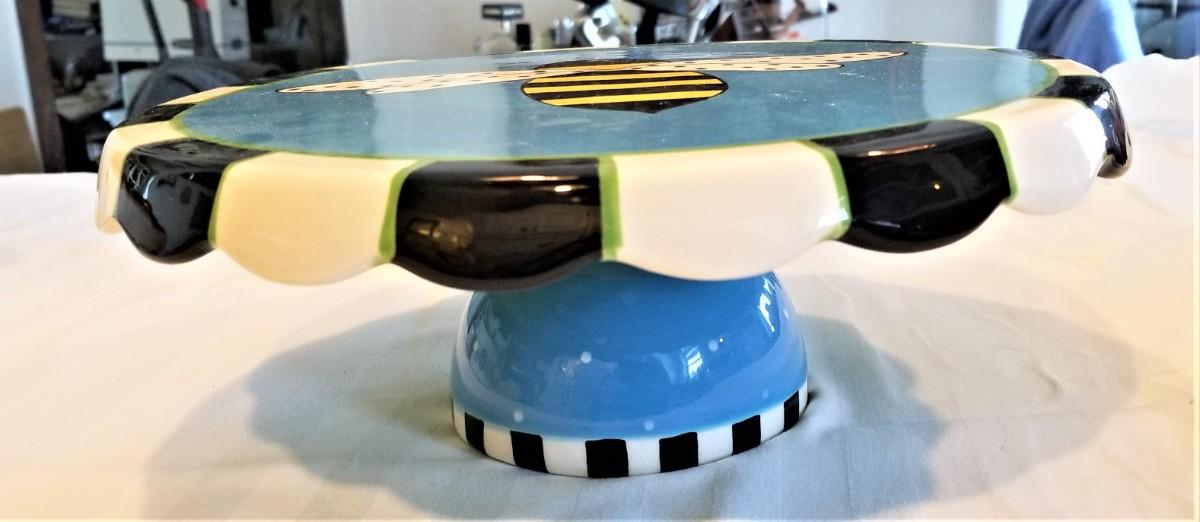 Very cut item - bumble bee-themed pedestal cake plate (good match for lot #49) - flip it over and it becomes a chip/dip party platter. Gently used condition (some crazing on top), measures 9" across, 3.5" tall. Ceramic.