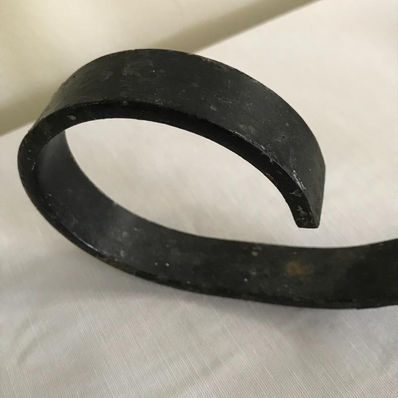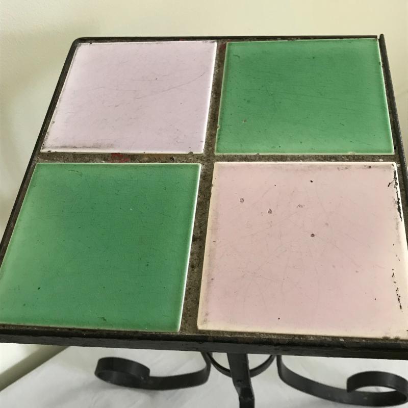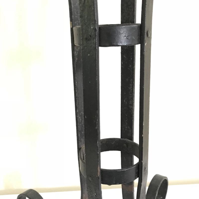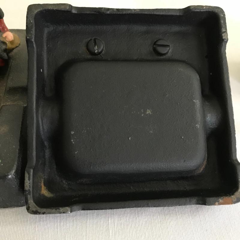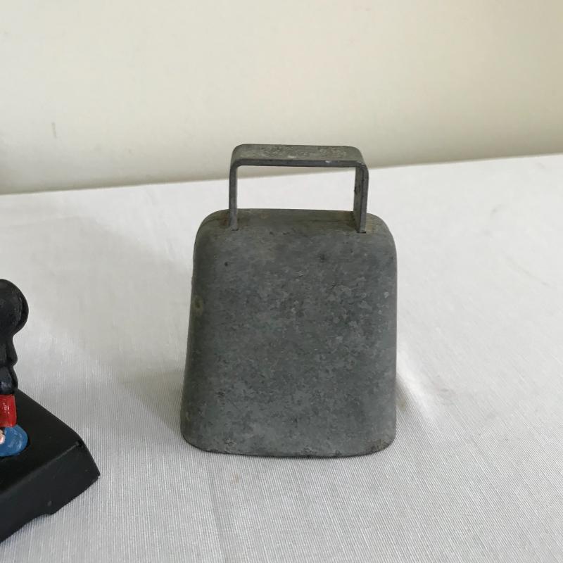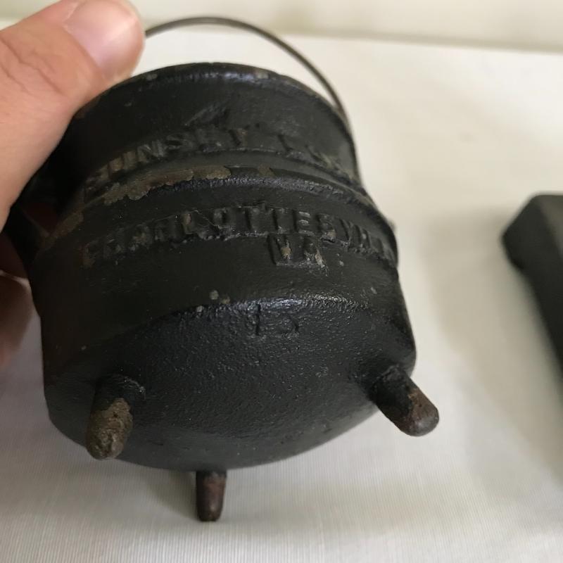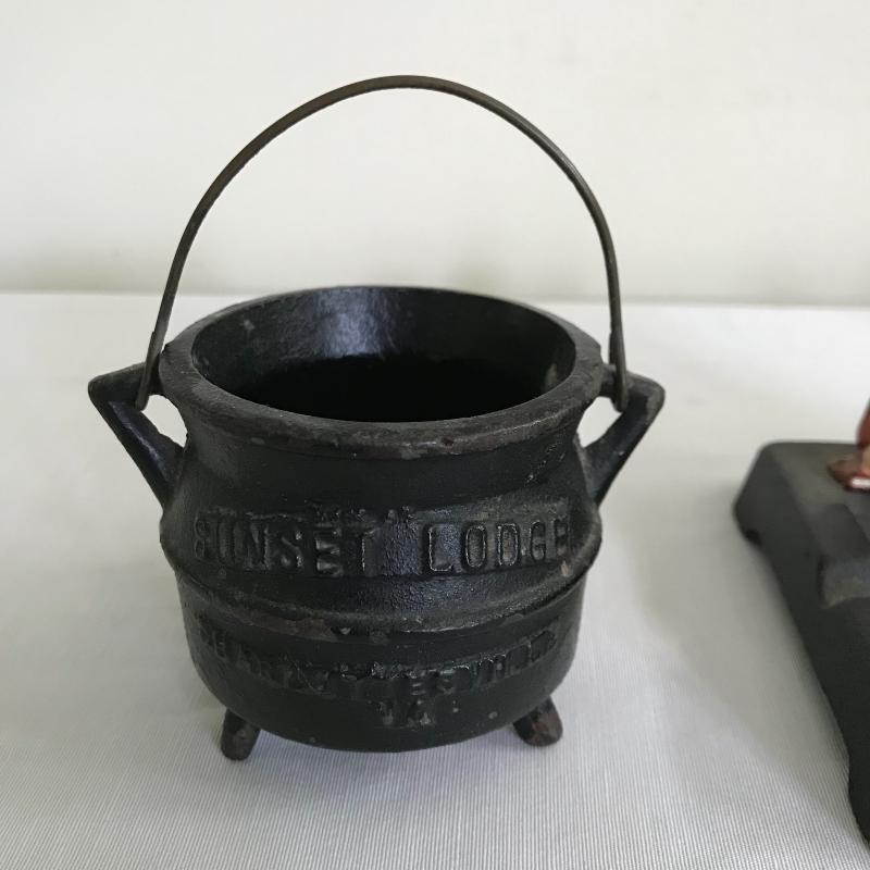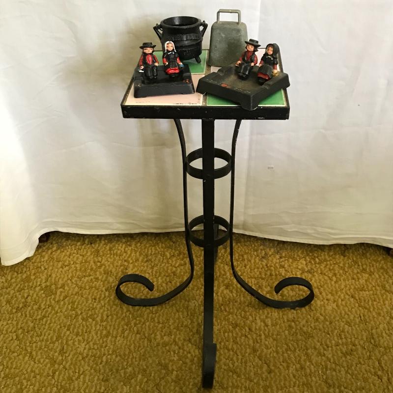 Lot includes two Wilton Prod Amish figurine ashtrays, a tiny cast iron pot stamped "Charlottesville" and a mobile handle. Lot also includes a metal cowbell and an iron plant stand with pink and green tiles. Local pick up only.