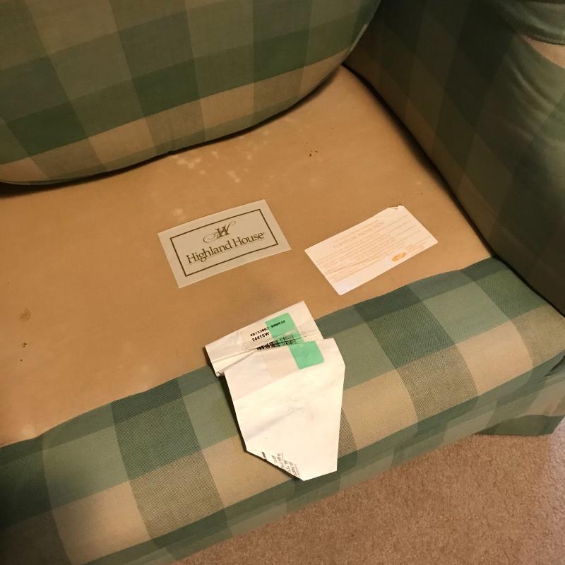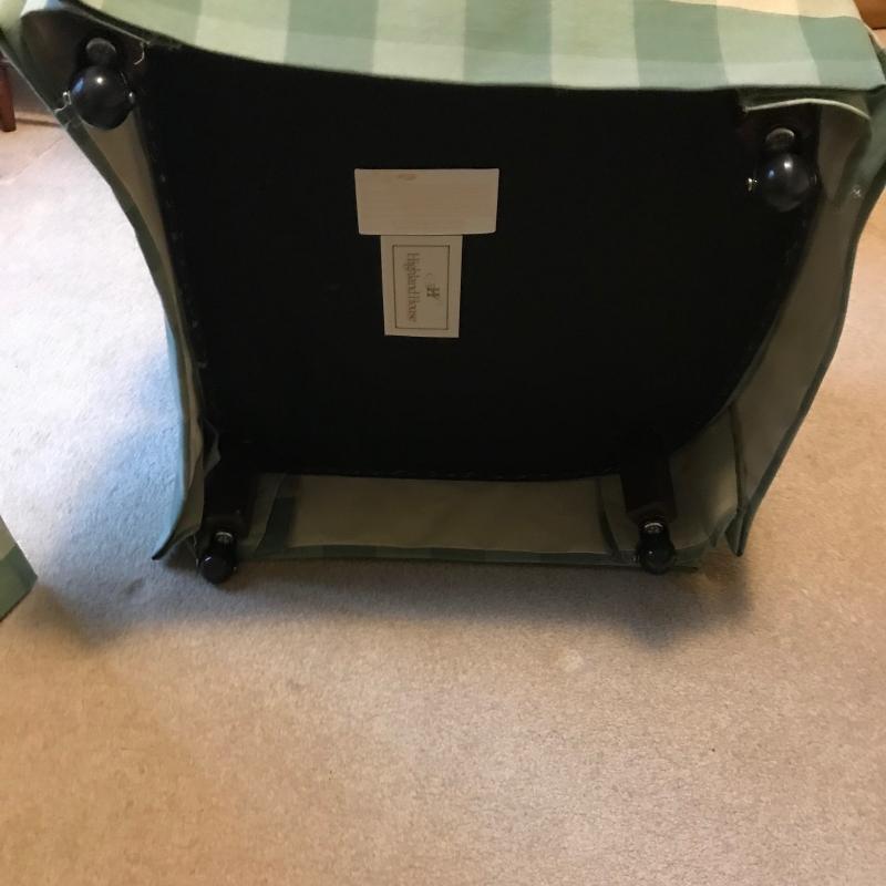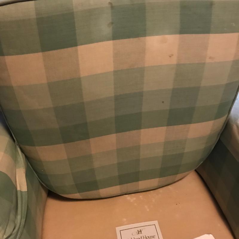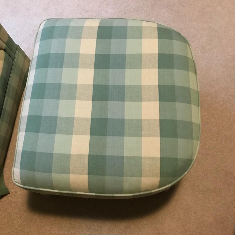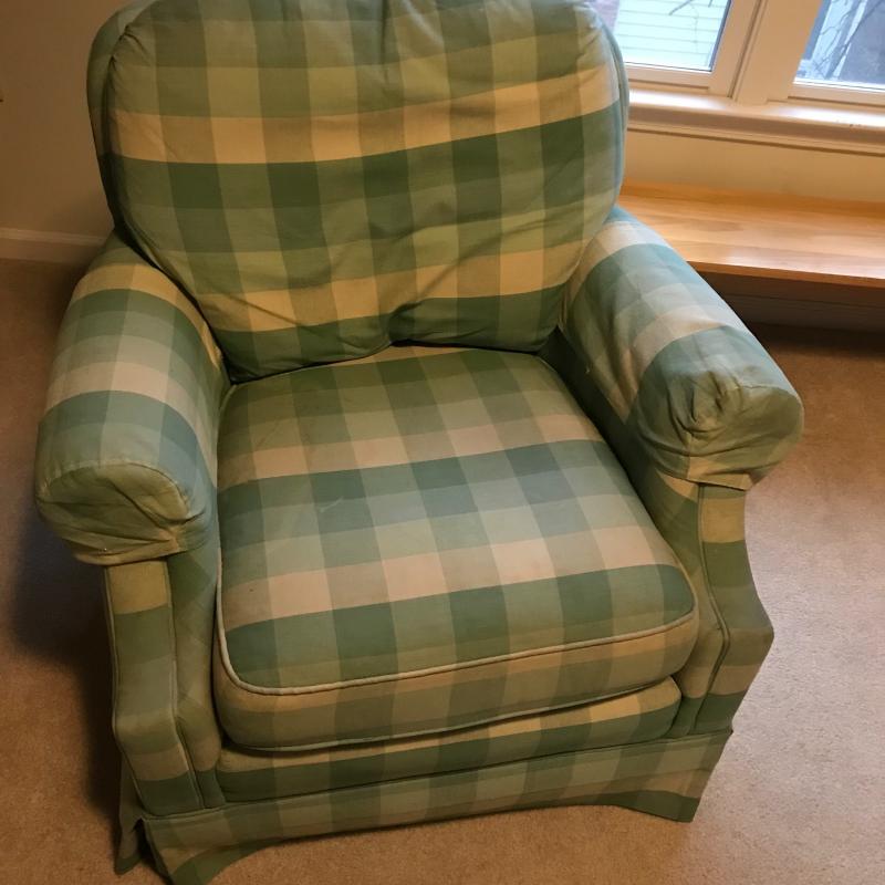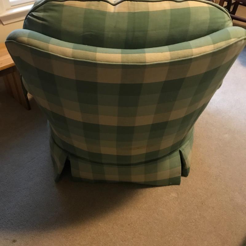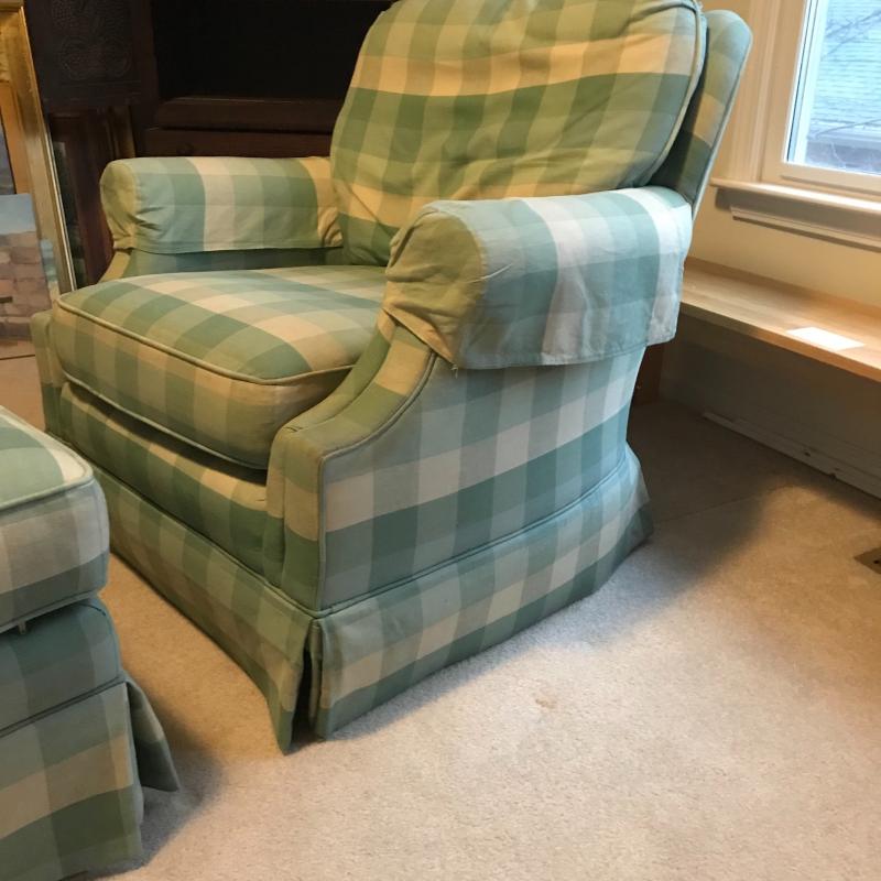 Green and beige checkered set by Highland House. Swivel chair and rolling ottoman. Both skirted Fabric has some staining on seat cushion. Chair measures 36” x30” x30” ottoman measures 27” x25” x16”. This lot is available for local pick up only in Asheville, NC.