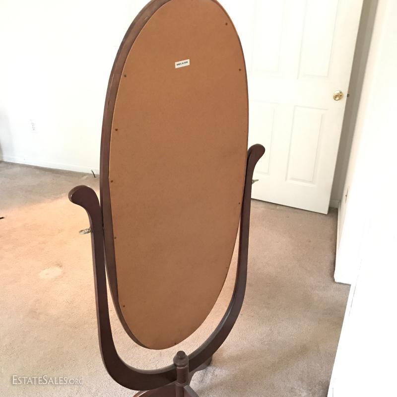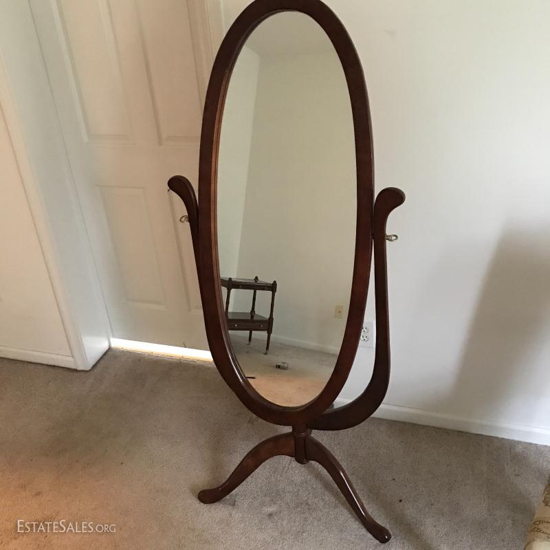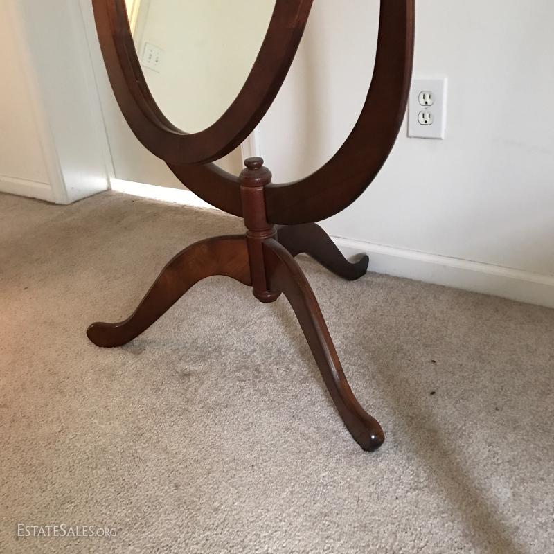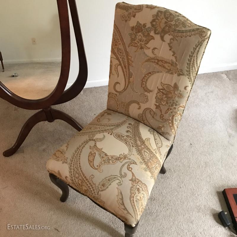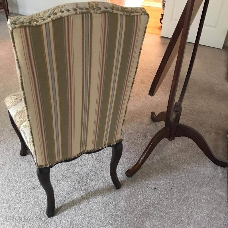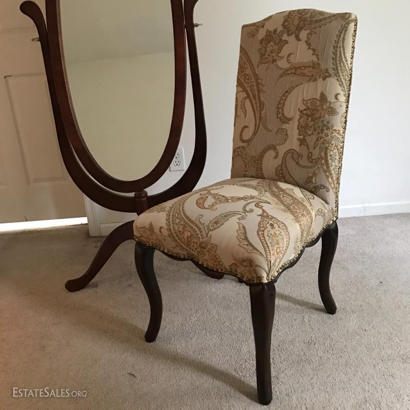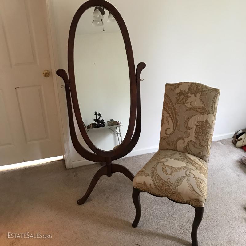 Dark wood colored chair and mirror. Fabric on chair is light paisley in colors of tan, cream, gold and teal. Standing mirror has three legs and measures 27.5" x 24" x 63.5. This lot is available for shipping or local pick up in Mills River, NC.