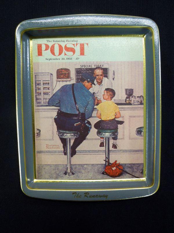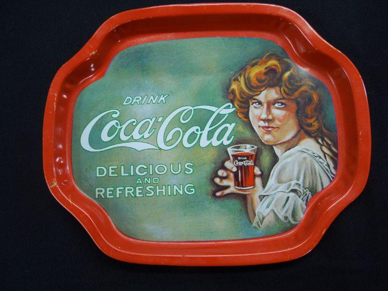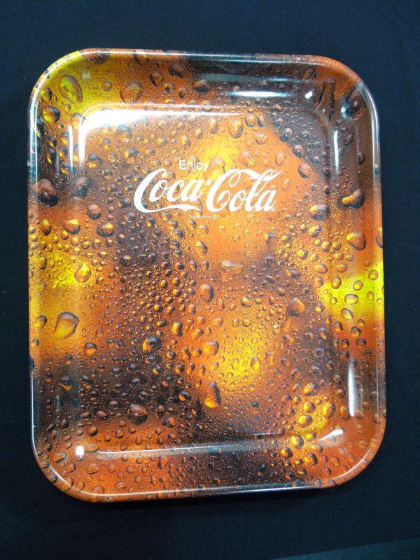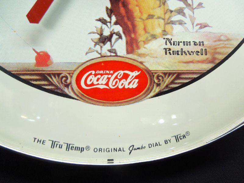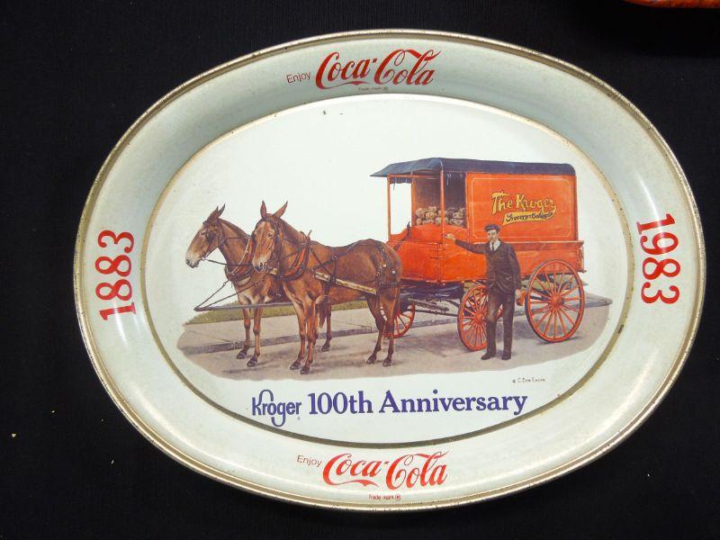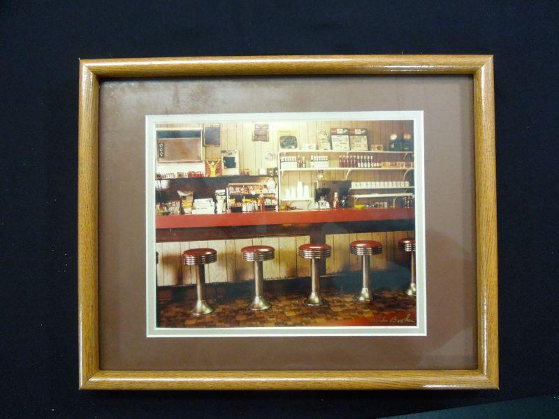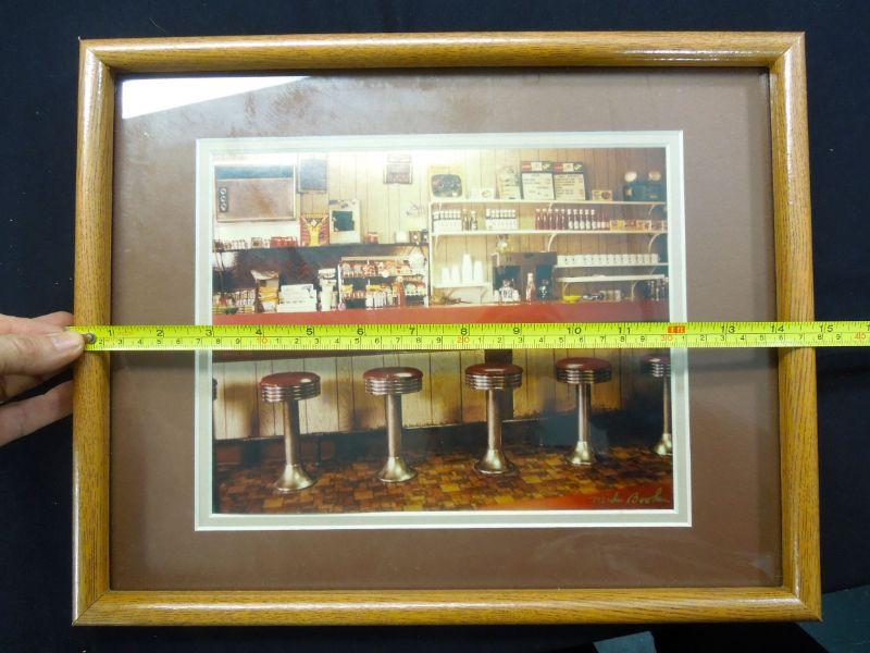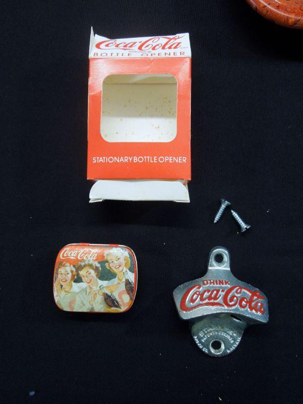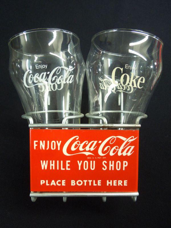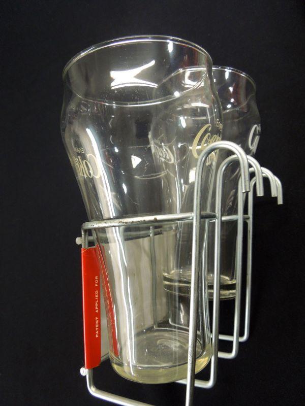 Pair tall soda glasses in stand with hook; 4 rocks glasses; four tin trays; a coke wall opener in box; a thermometer; a frmed diner photograph; a small mint tin. Most appear to be reproductions, with possible exception of glassware.