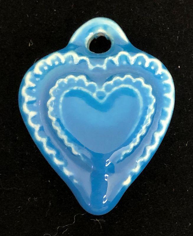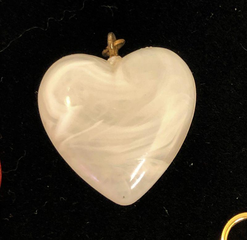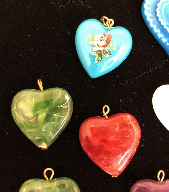 These appear to be something lighter than glass except for the one pendant that is ceramic (the blue one that is a heart within a heart). The gold tone heart within a heart has a red glass stone in the center.