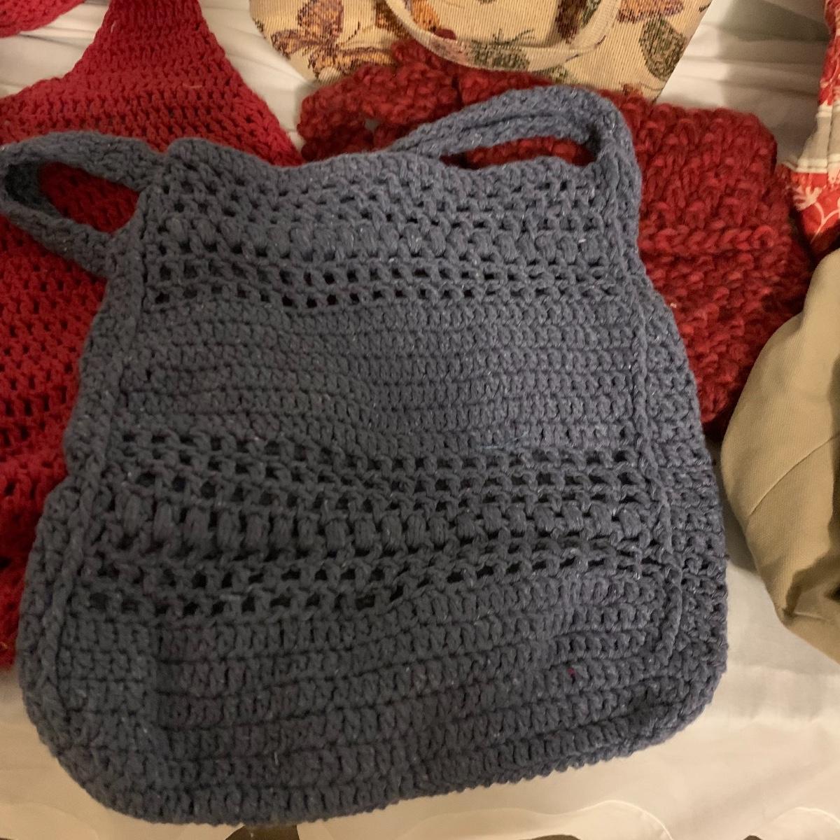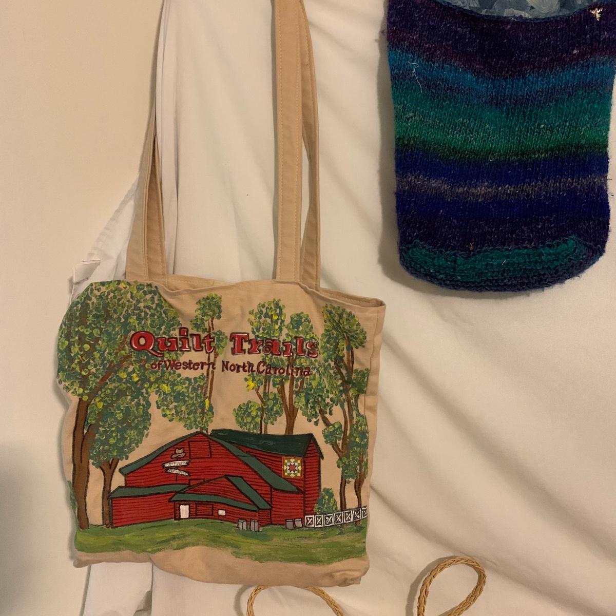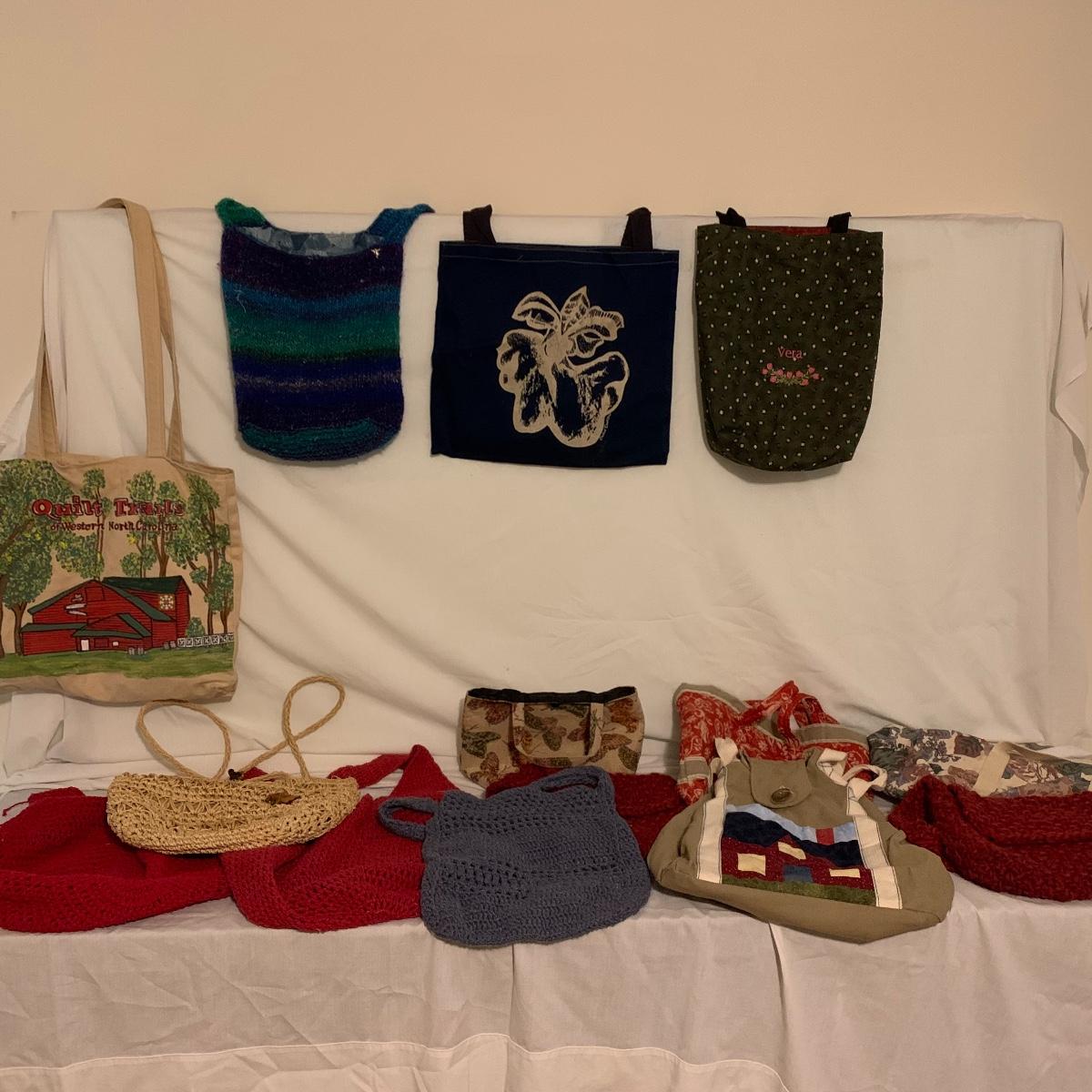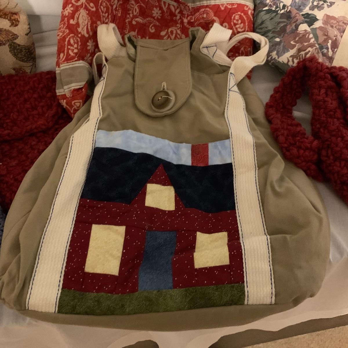 Lot contains aprox. Fourteen bags that range from purses to sewing satchels. The crocheted bags are newly made and one even has a nice button to be added to it. The farm scene bag and the house shaped bag have lots of compartments inside to separate items. This fun collection should keep you covered for transporting just about anything in style. Quilt trails bag measures 15” x 15” not including handles.