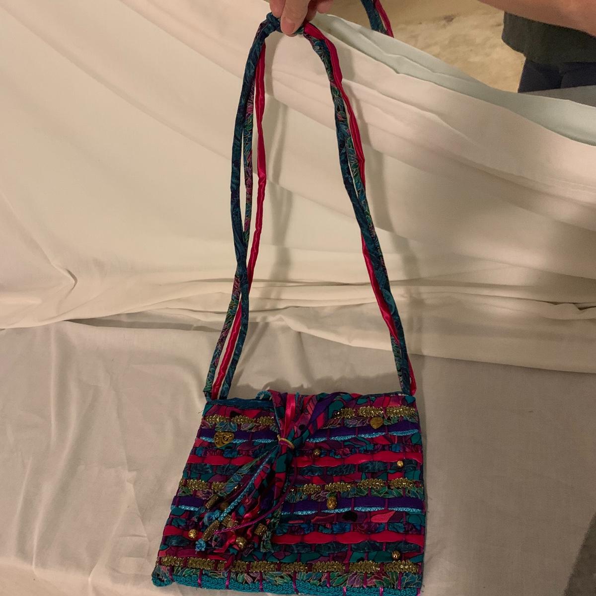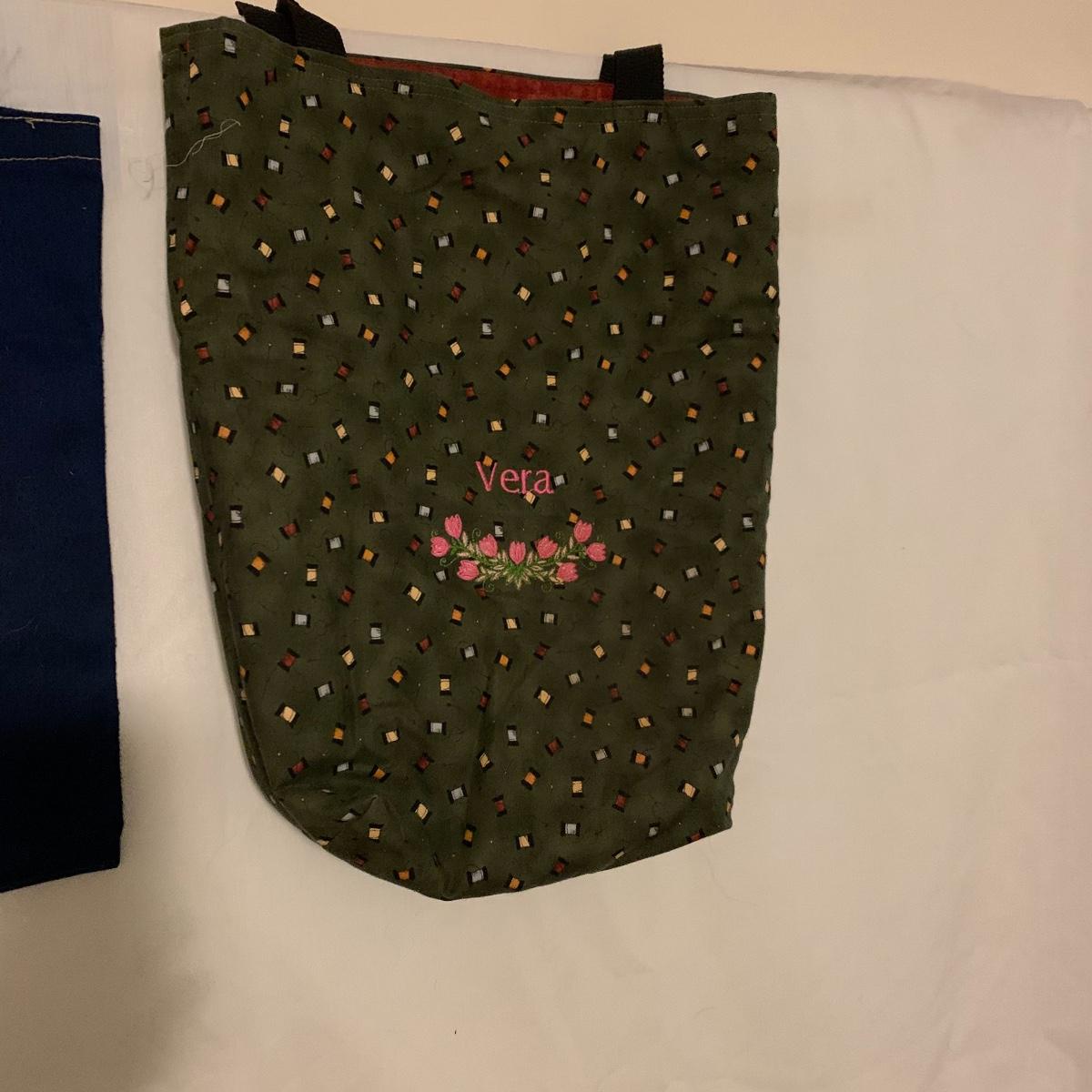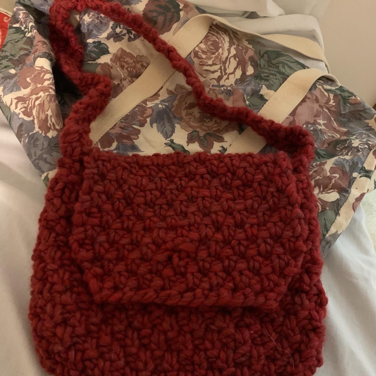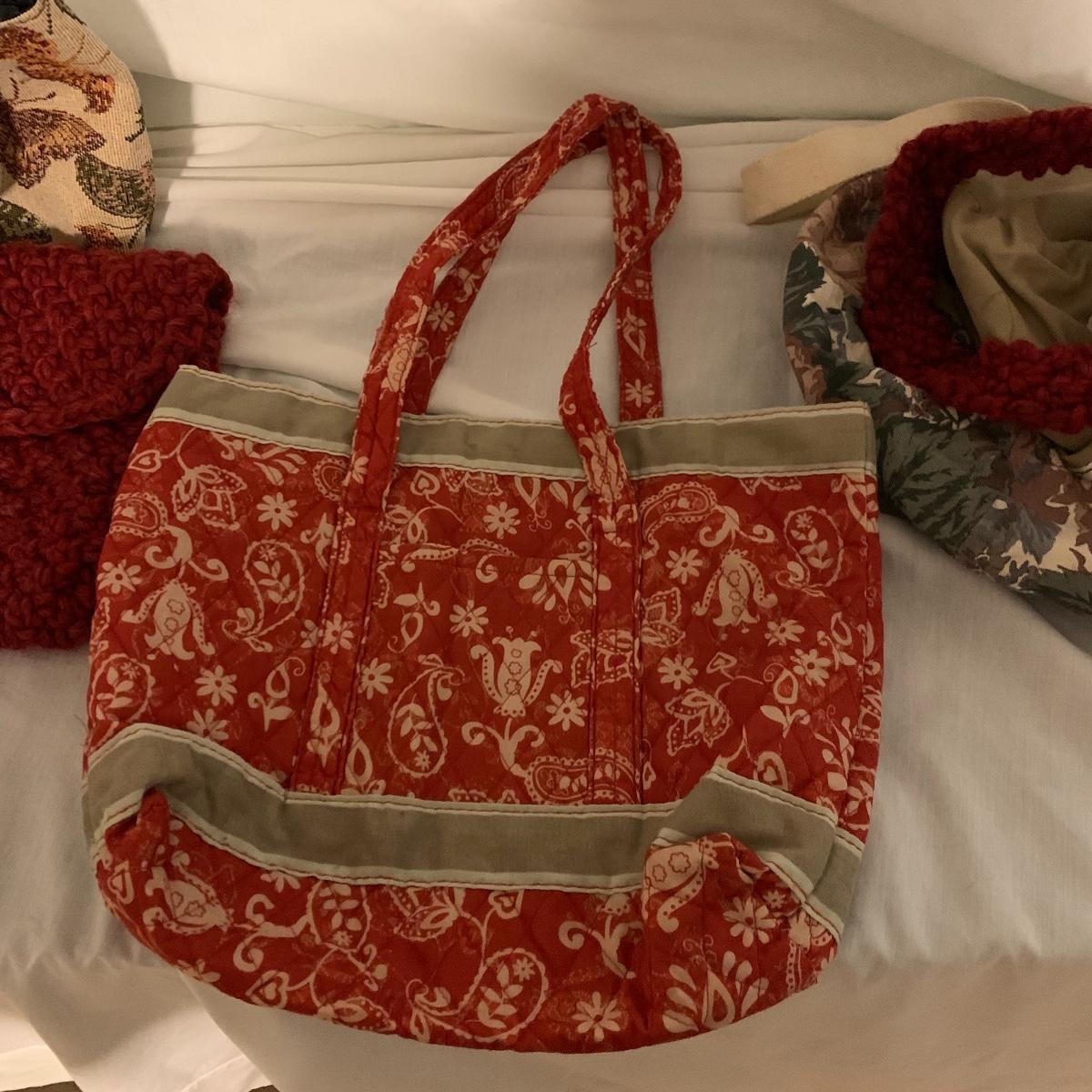 Lot contains aprox. Fourteen bags that range from purses to sewing satchels. The crocheted bags are newly made and one even has a nice button to be added to it. The farm scene bag and the house shaped bag have lots of compartments inside to separate items. This fun collection should keep you covered for transporting just about anything in style. Quilt trails bag measures 15” x 15” not including handles.